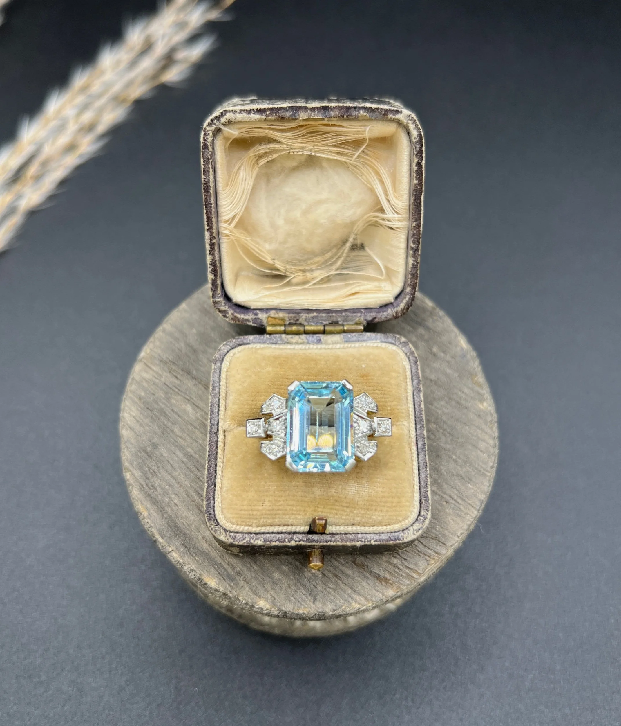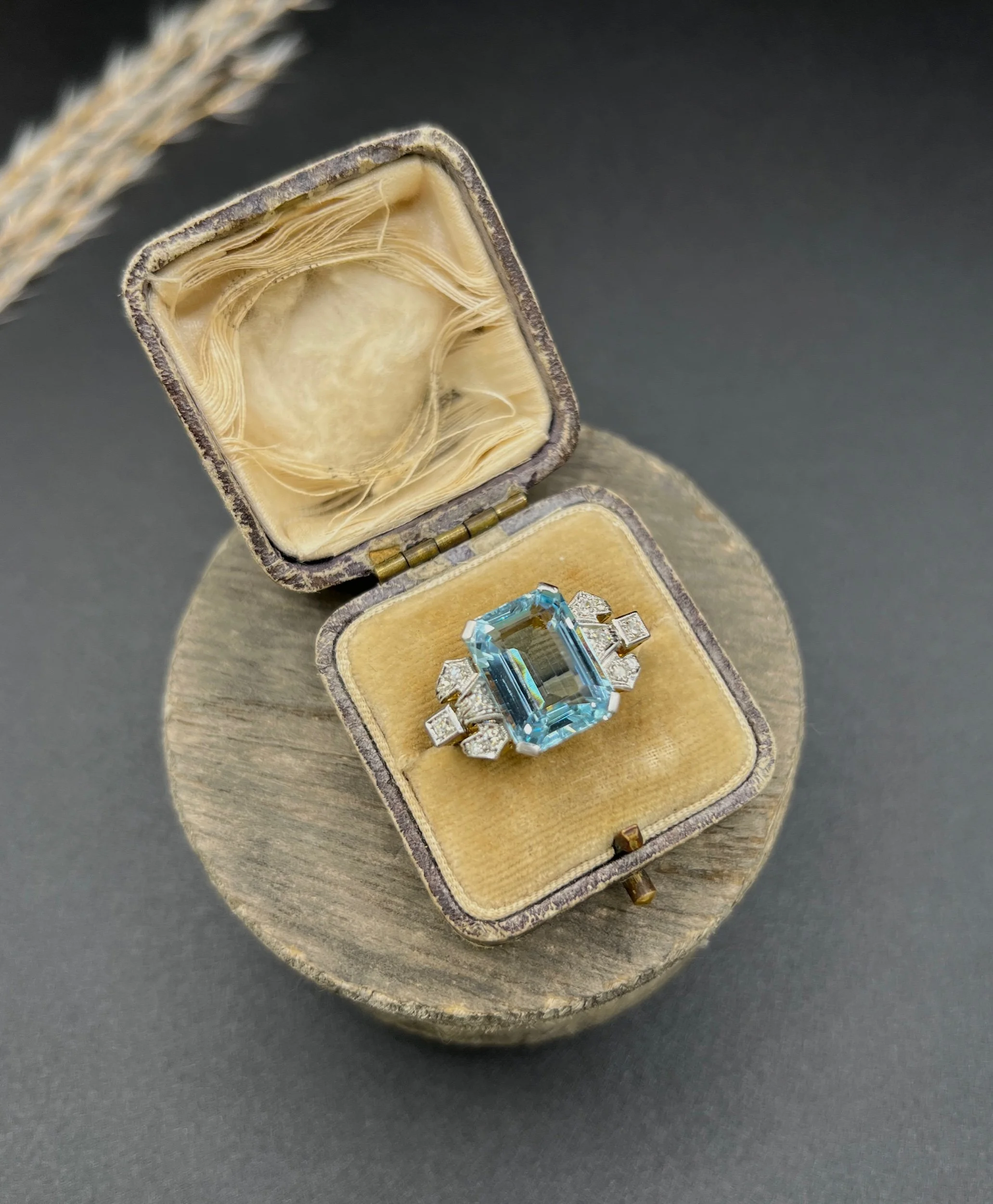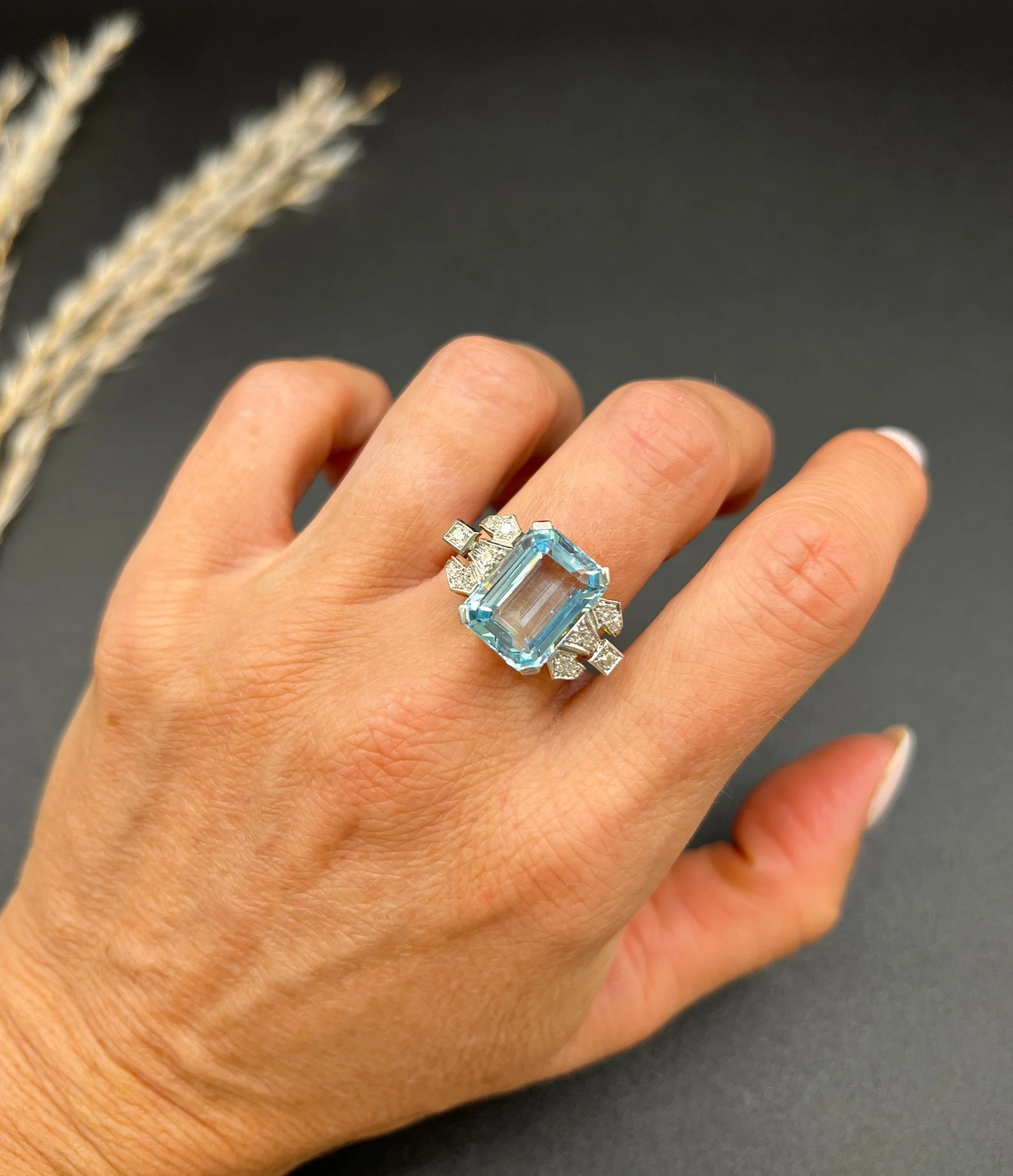 Step back in time with this fabulous 1920s cocktail ring, a true testament to the elegance of the era. At the heart of this exquisite piece lies a mesmerising emerald-cut natural aquamarine stone, which captures the light beautifully and showcases its captivating hue. Flanked by statement design milgrain-set diamond shoulders, this ring exudes glamour and sophistication.