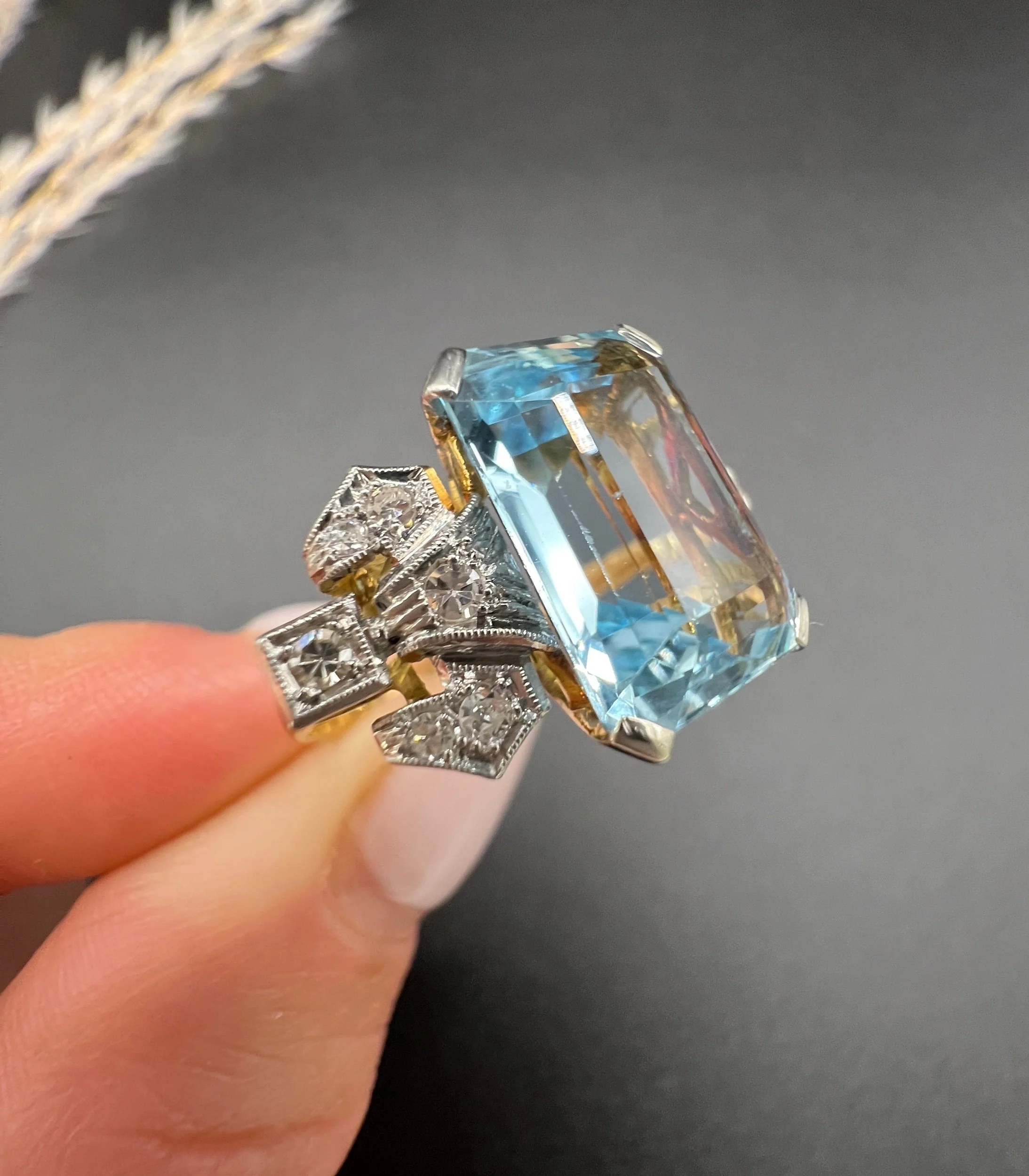 Antique 18ct Gold Stamped, 1920s Emerald Cut Aquamarine & Diamond Cocktail Ring