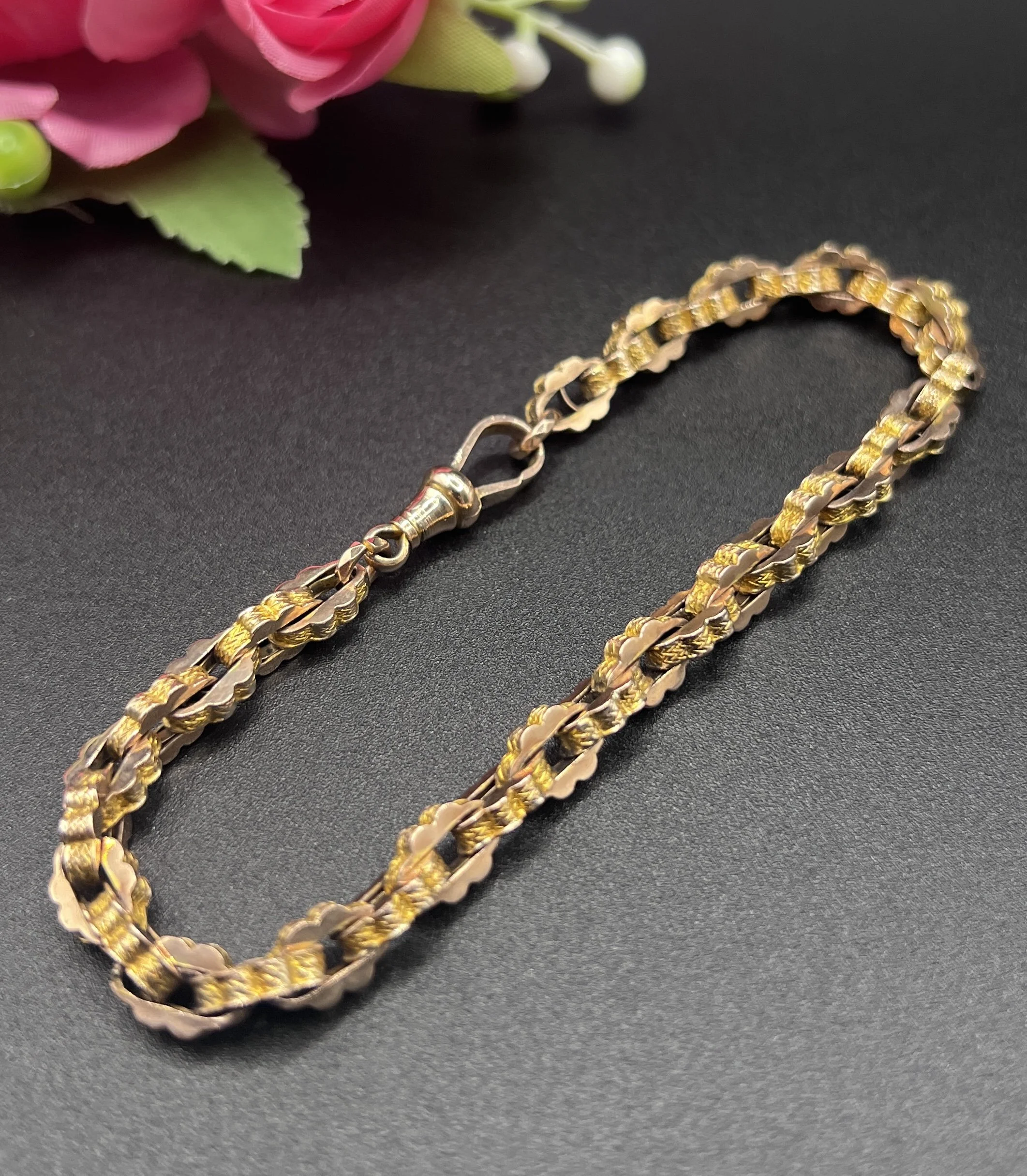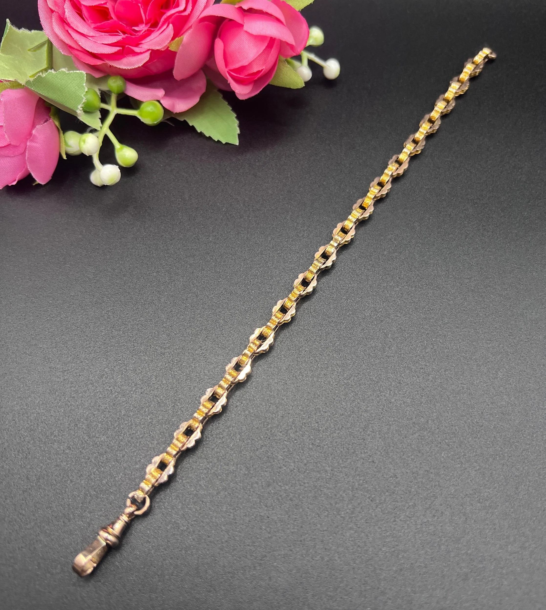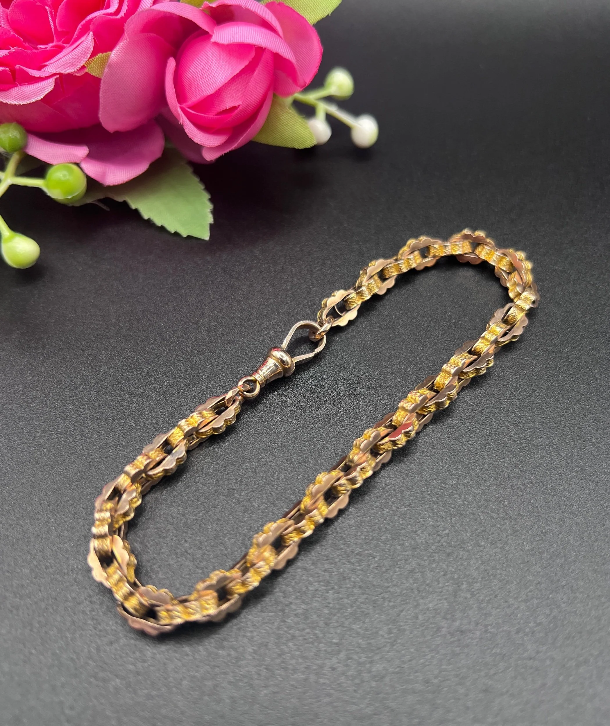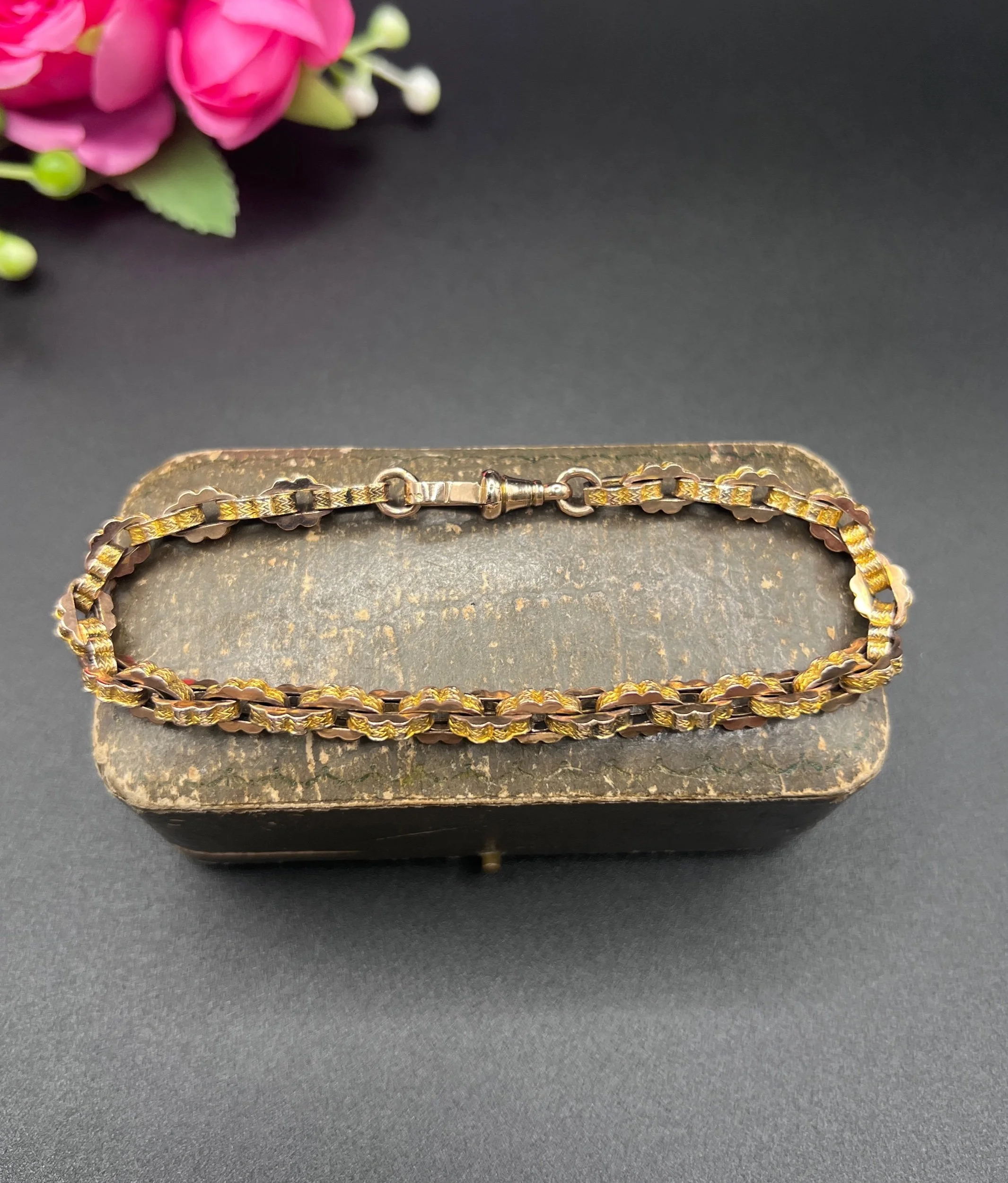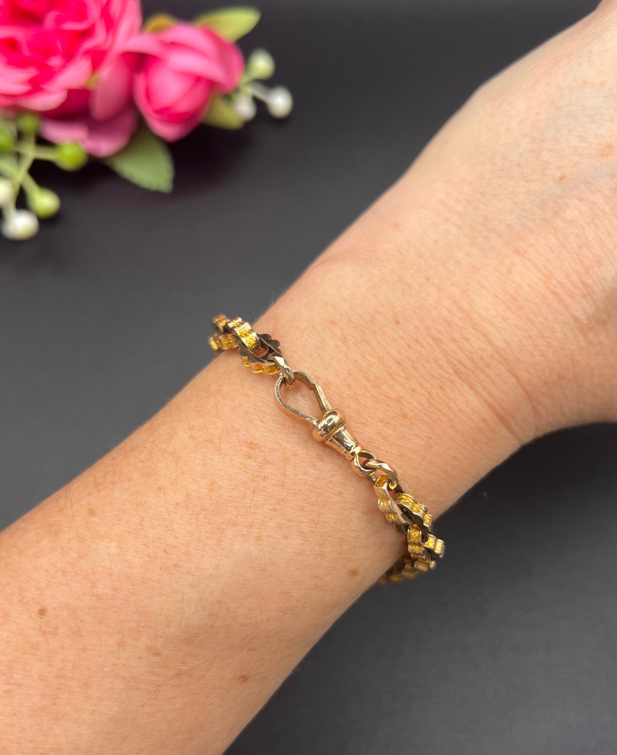 A beautiful Victorian bracelet crafted in yellow gold, composed of tightly interlocking fancy links with a uniform, geometric profile. The links showcase both a smooth and engraved surface, creating a lively play of light across the bracelet’s textured design. Secured with a swivel clasp, the piece combines decorative intricacy with wearable solidity.