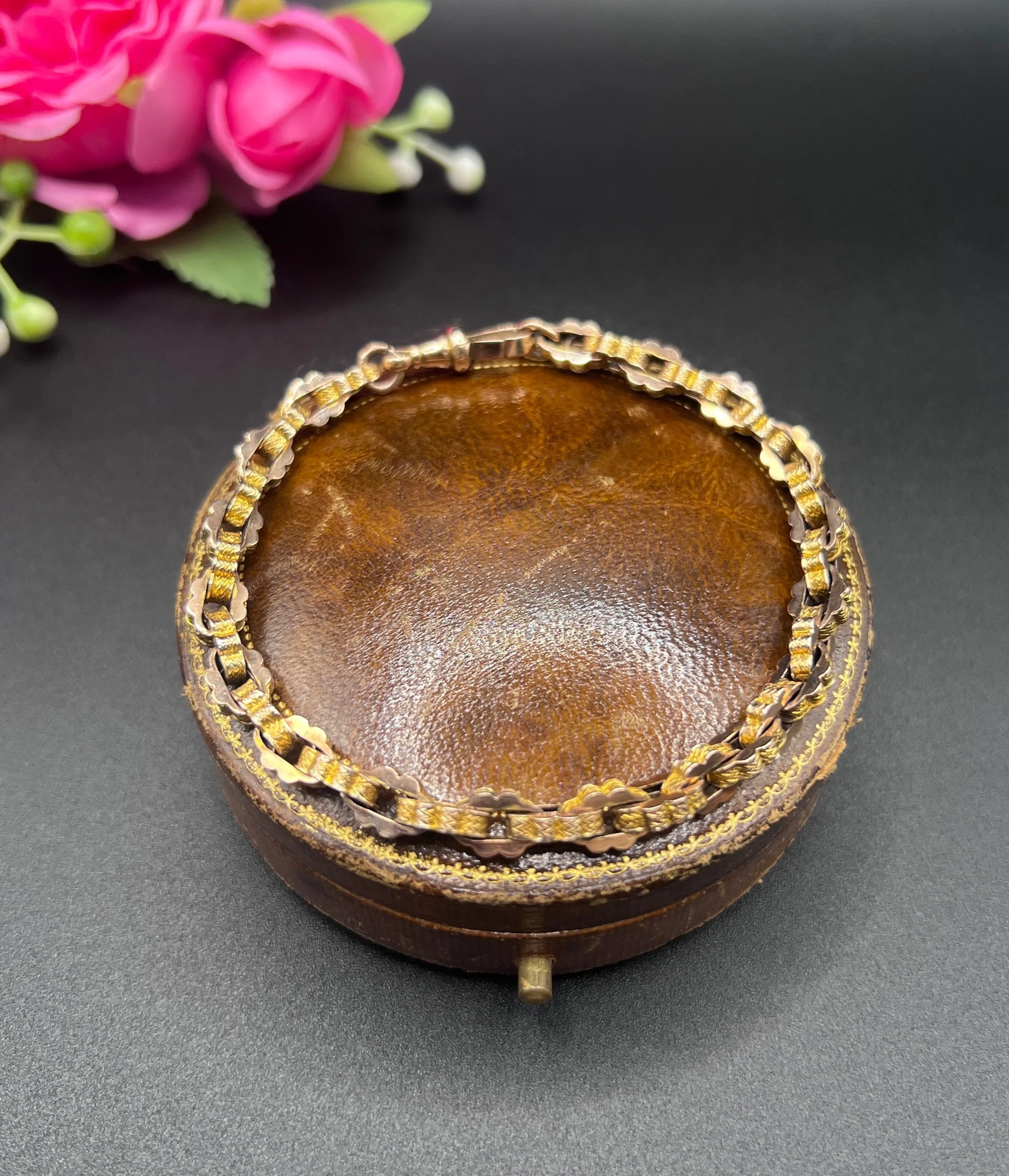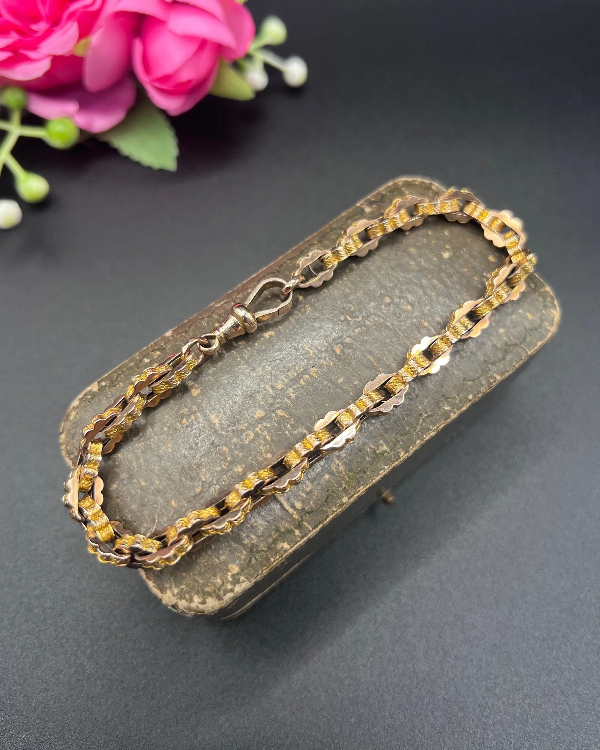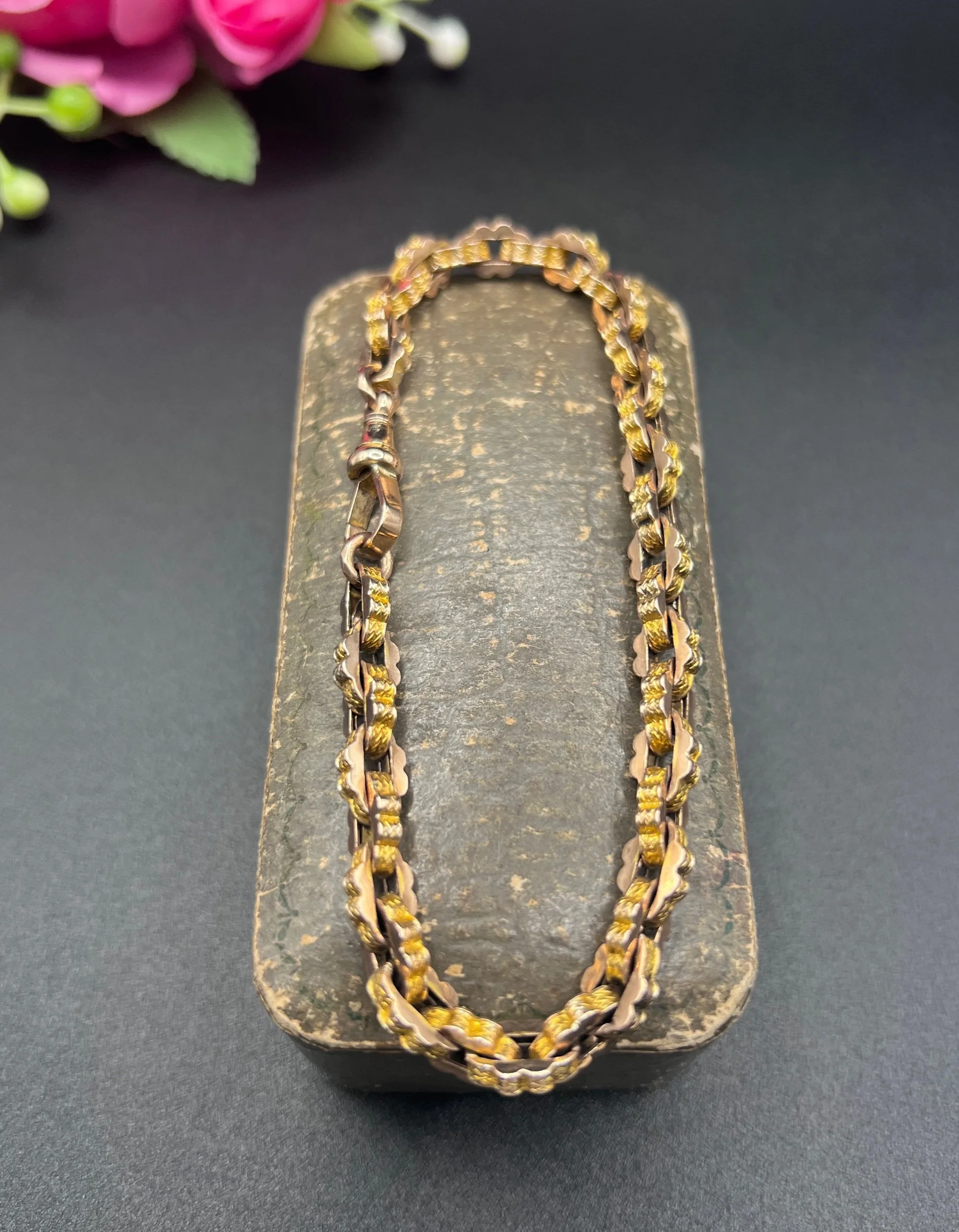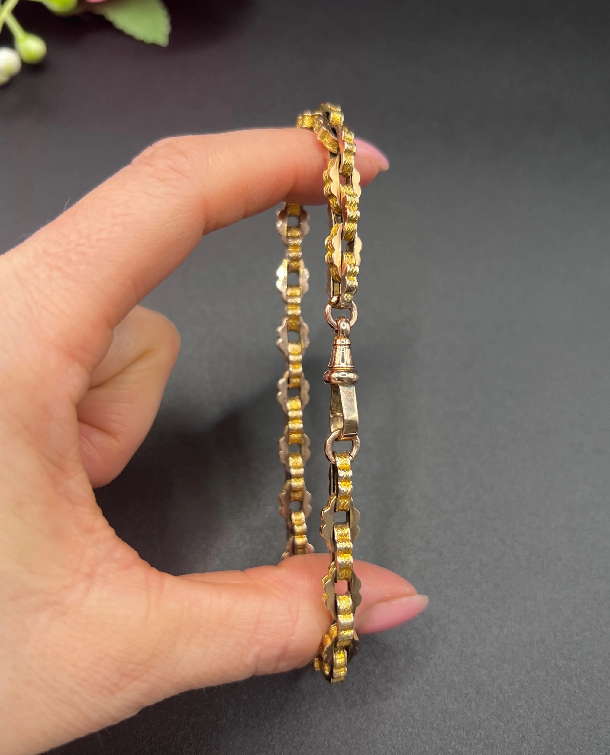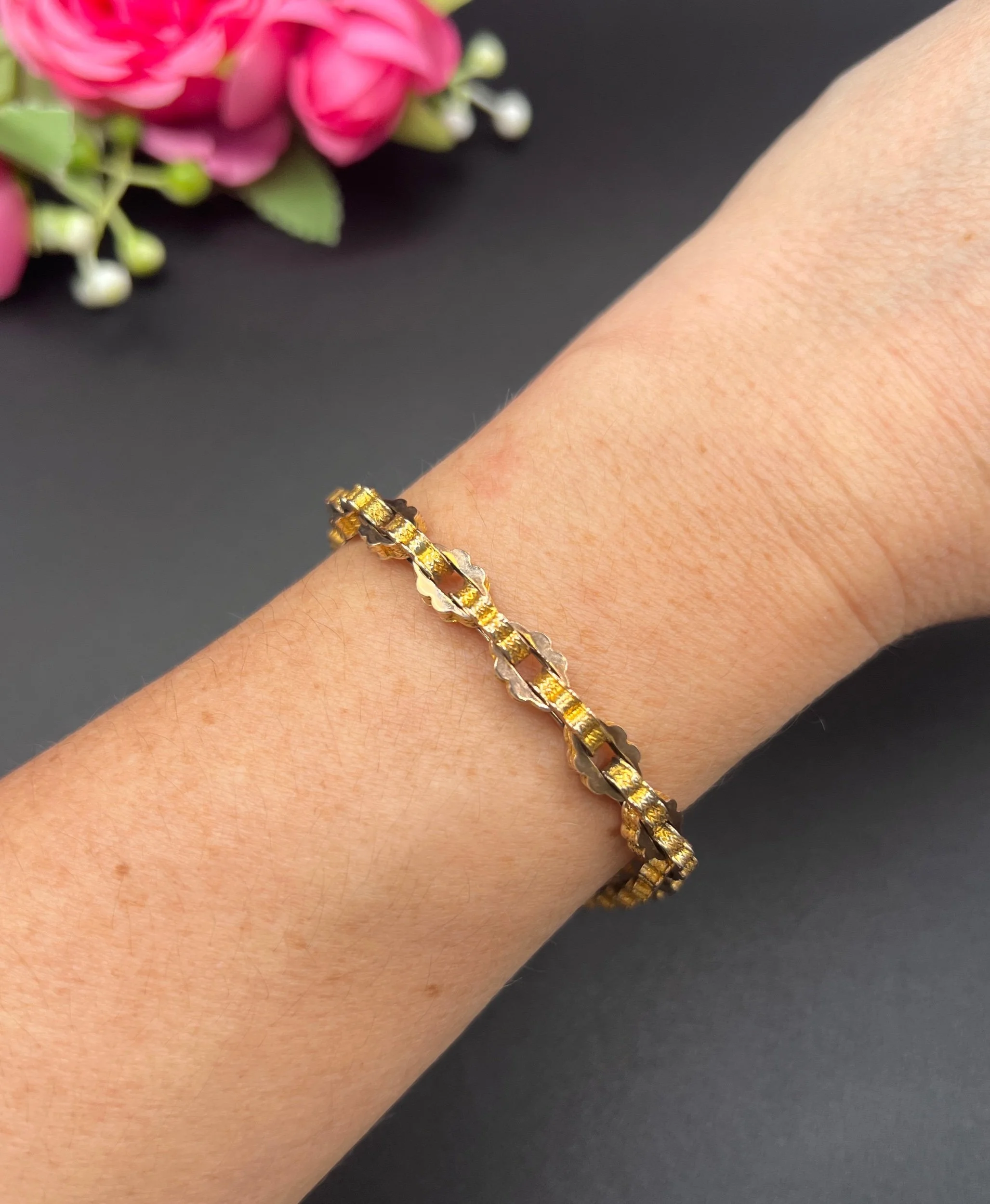 A beautiful Victorian bracelet crafted in yellow gold, composed of tightly interlocking fancy links with a uniform, geometric profile. The links showcase both a smooth and engraved surface, creating a lively play of light across the bracelet’s textured design. Secured with a swivel clasp, the piece combines decorative intricacy with wearable solidity.