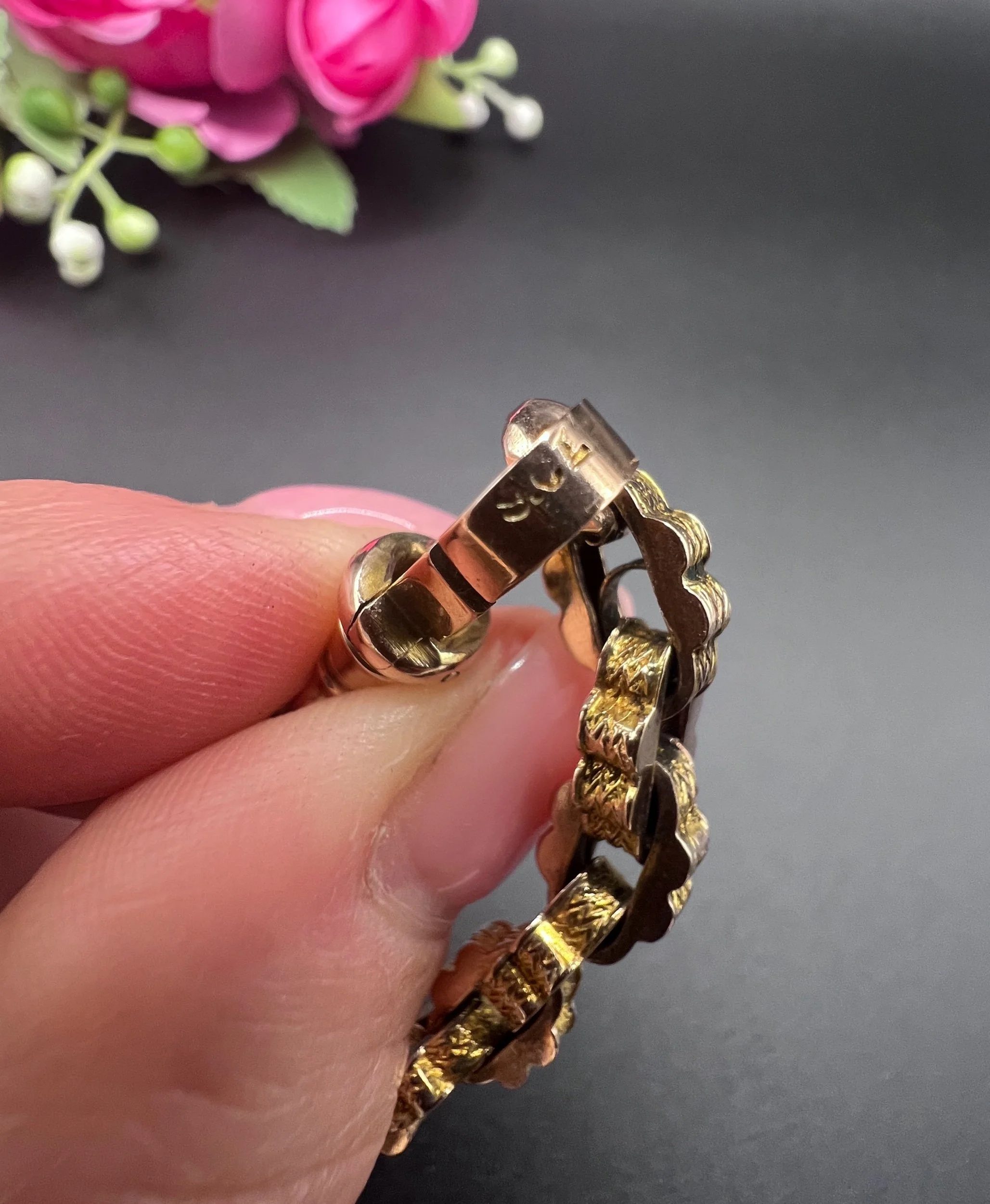 Its construction reflects the precision and elegance of 1880s goldwork, favouring rhythmic patterning and subtle brilliance in everyday adornment.