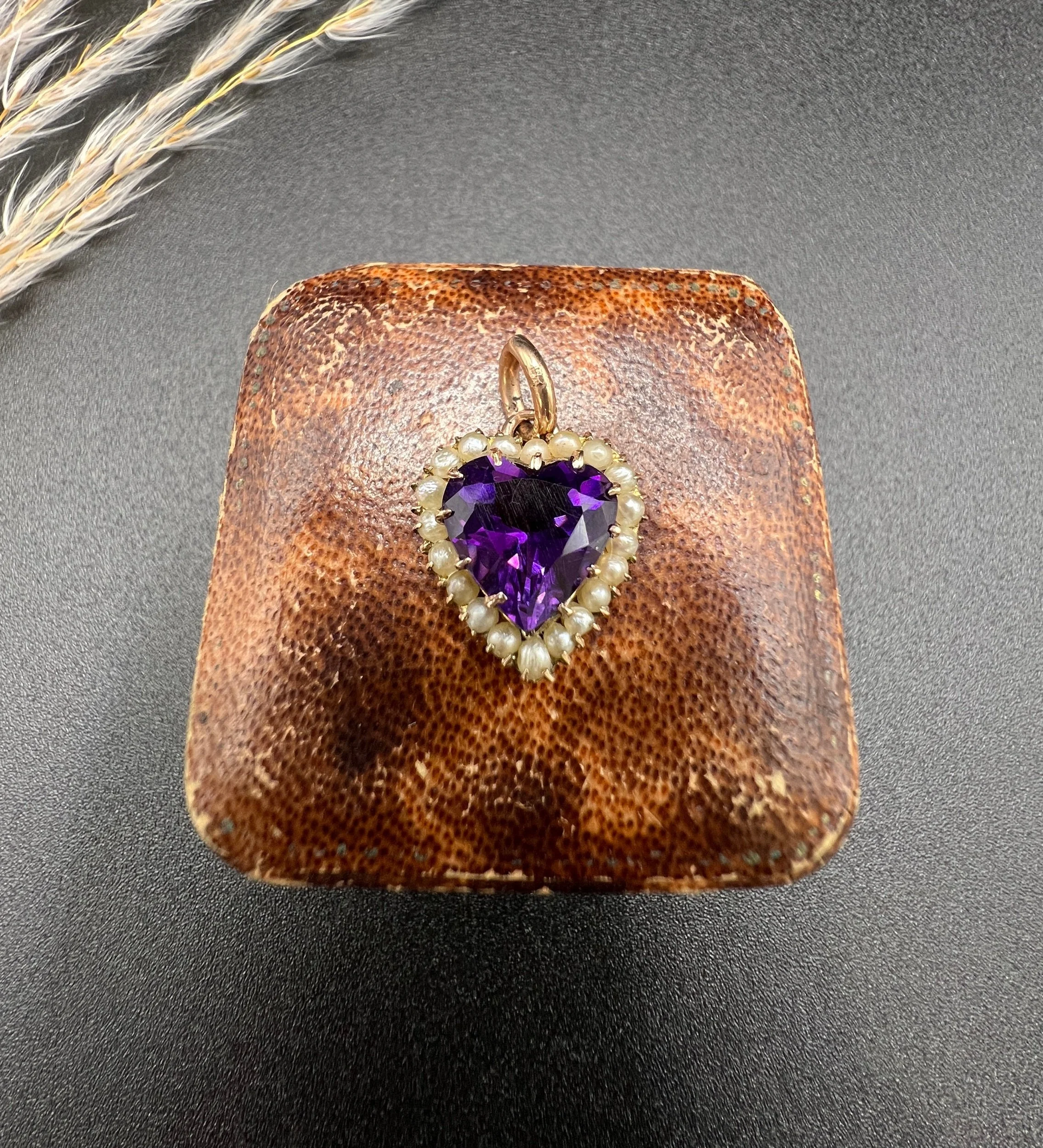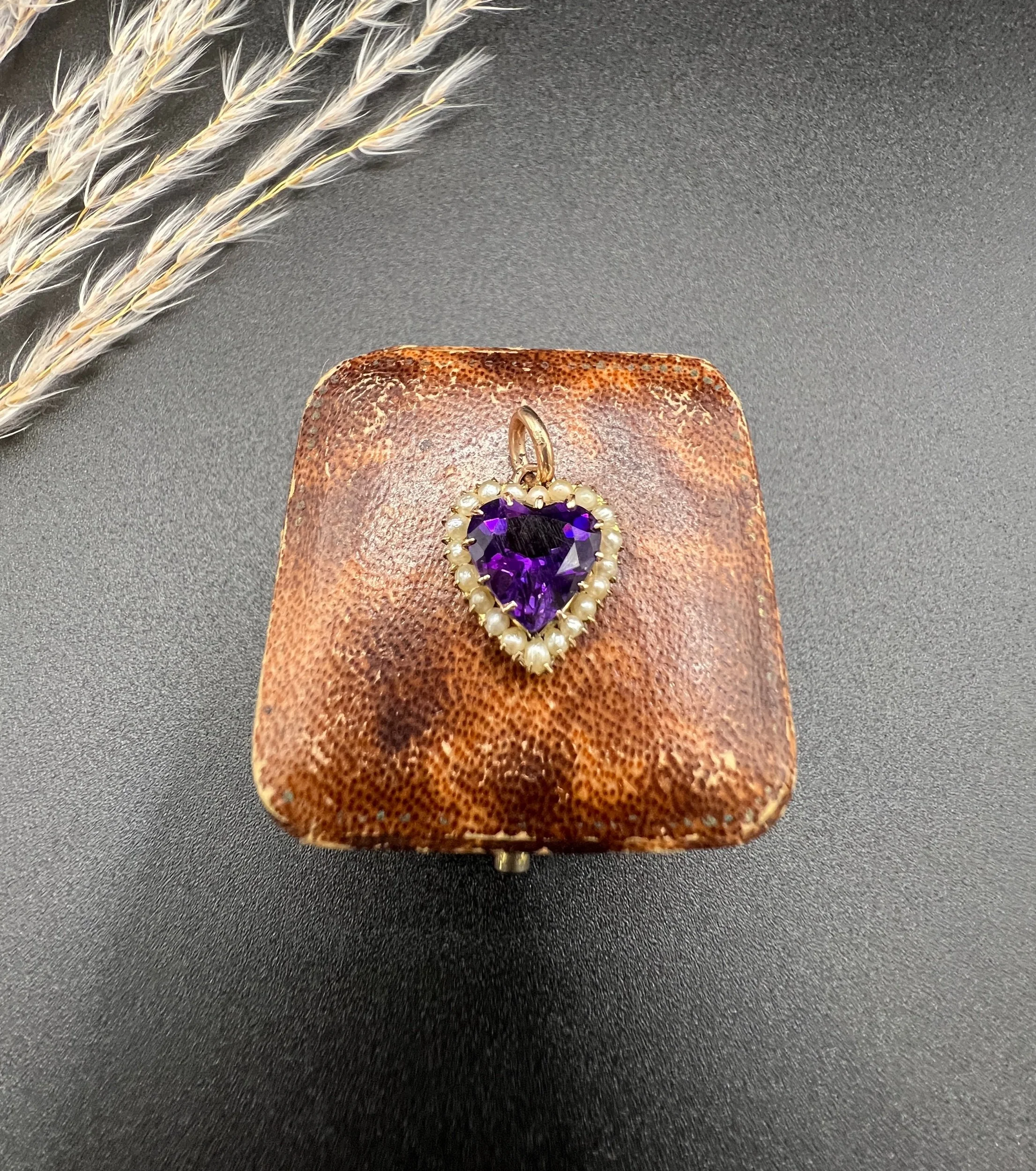 Antique 9ct Rose Gold, Edwardian Amethyst & Natural Seed Pearl Heart Pendant