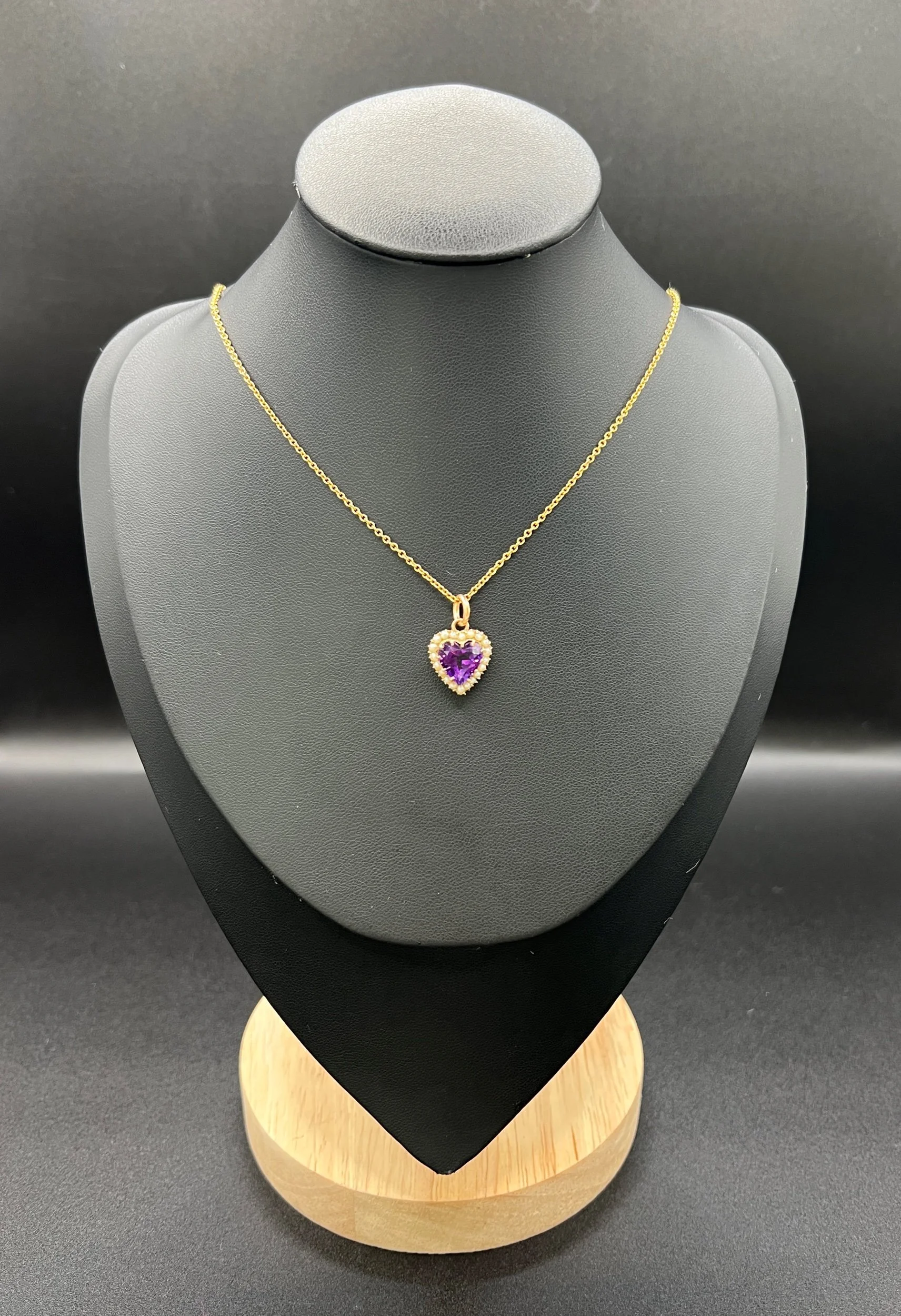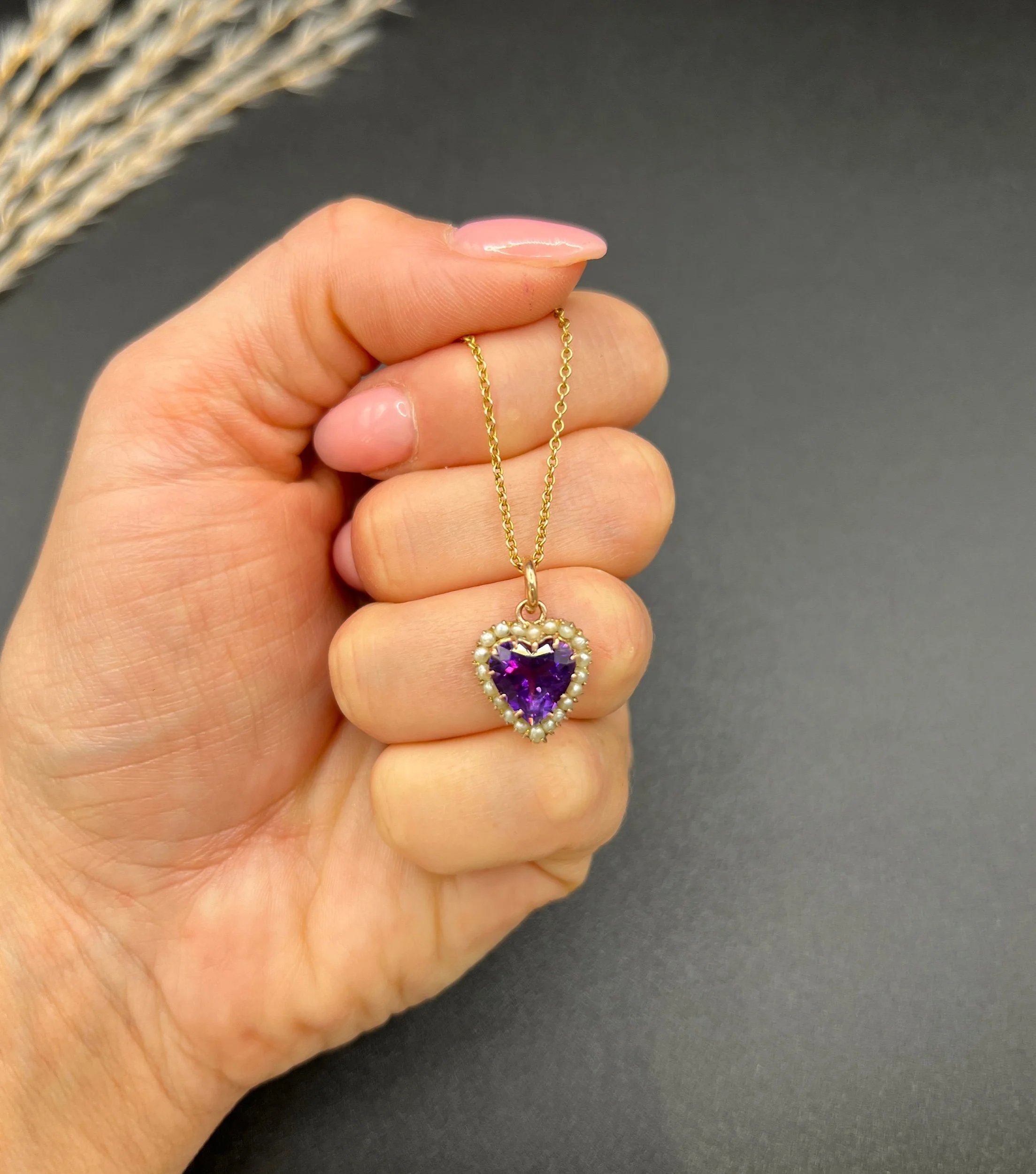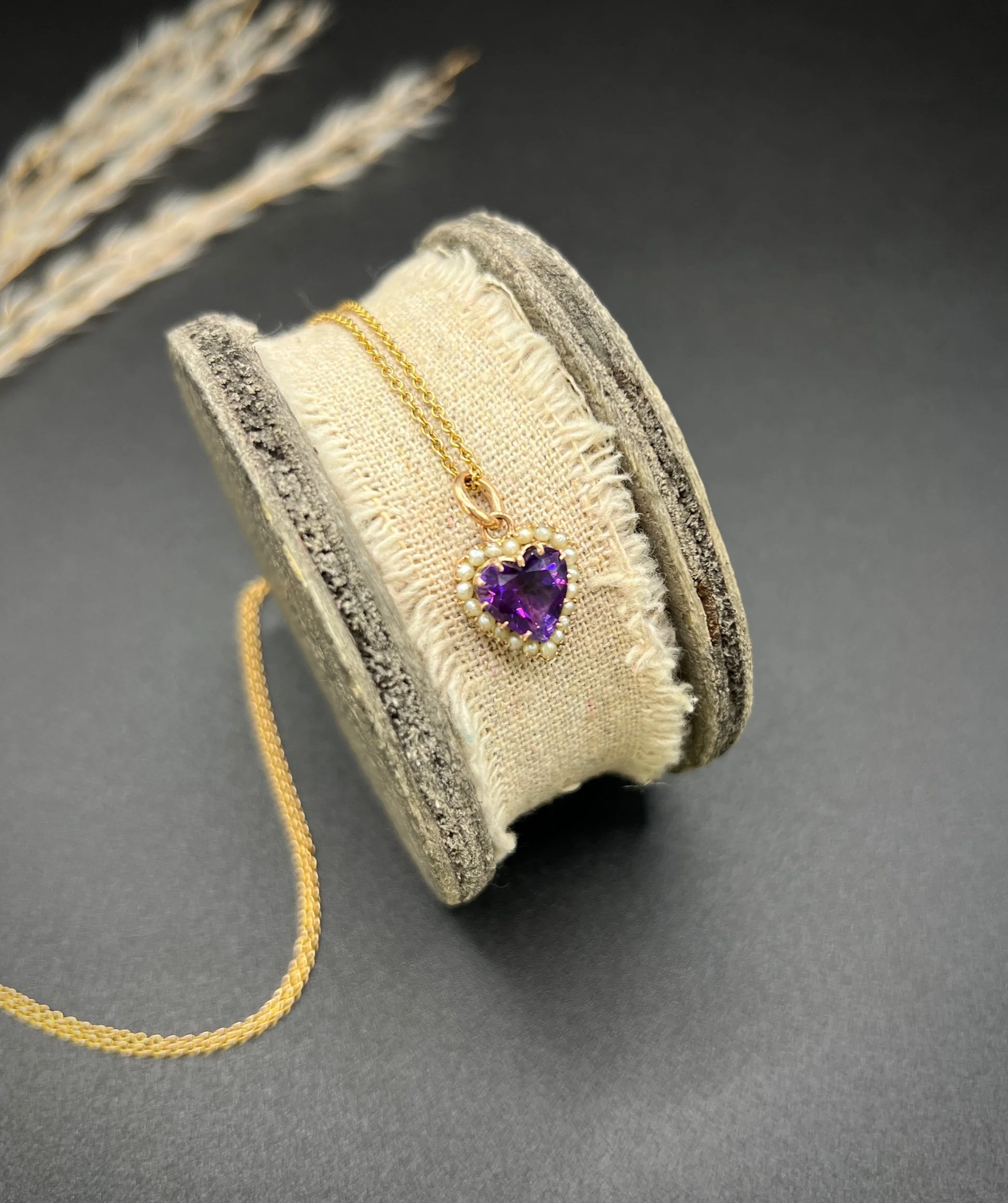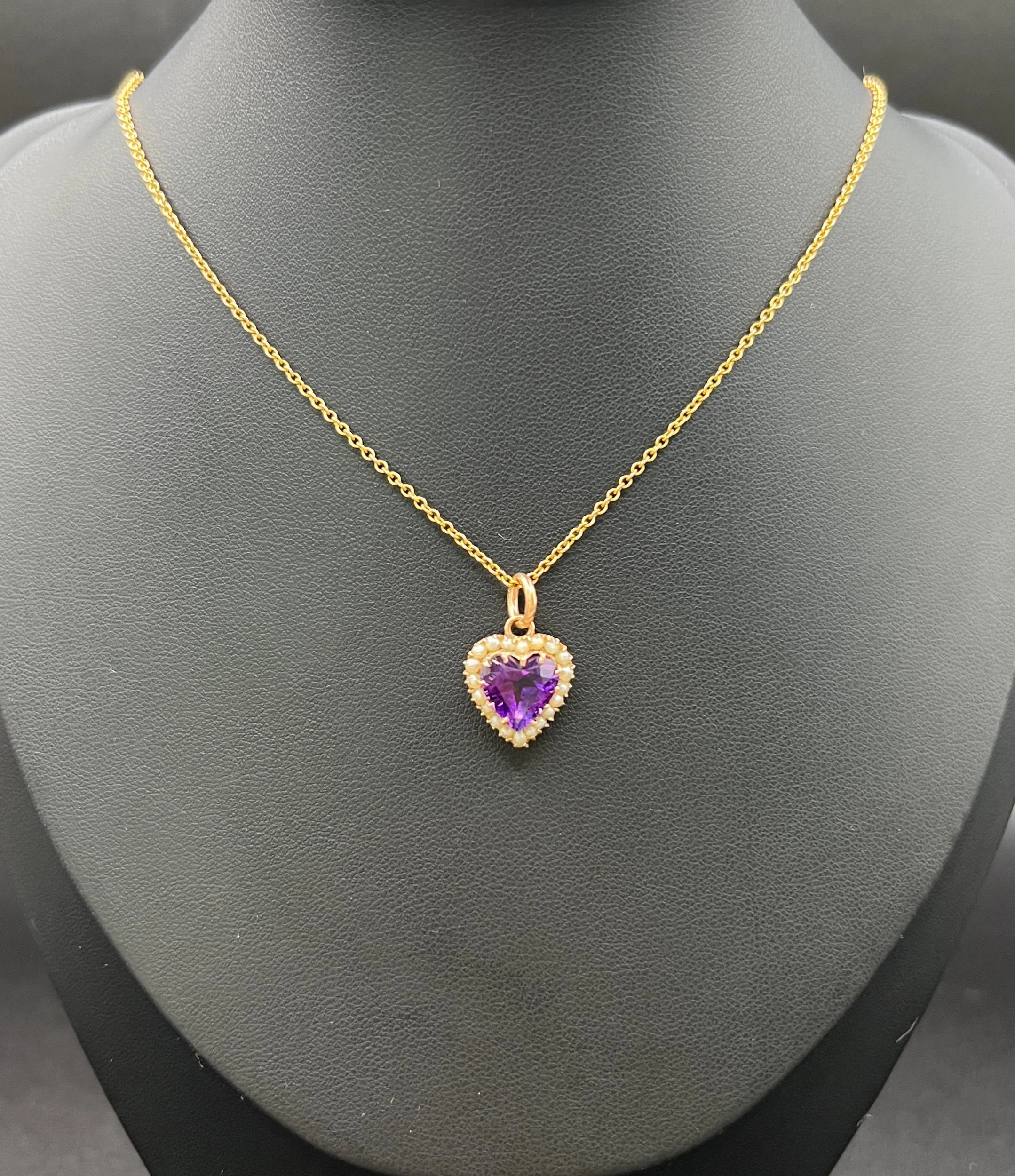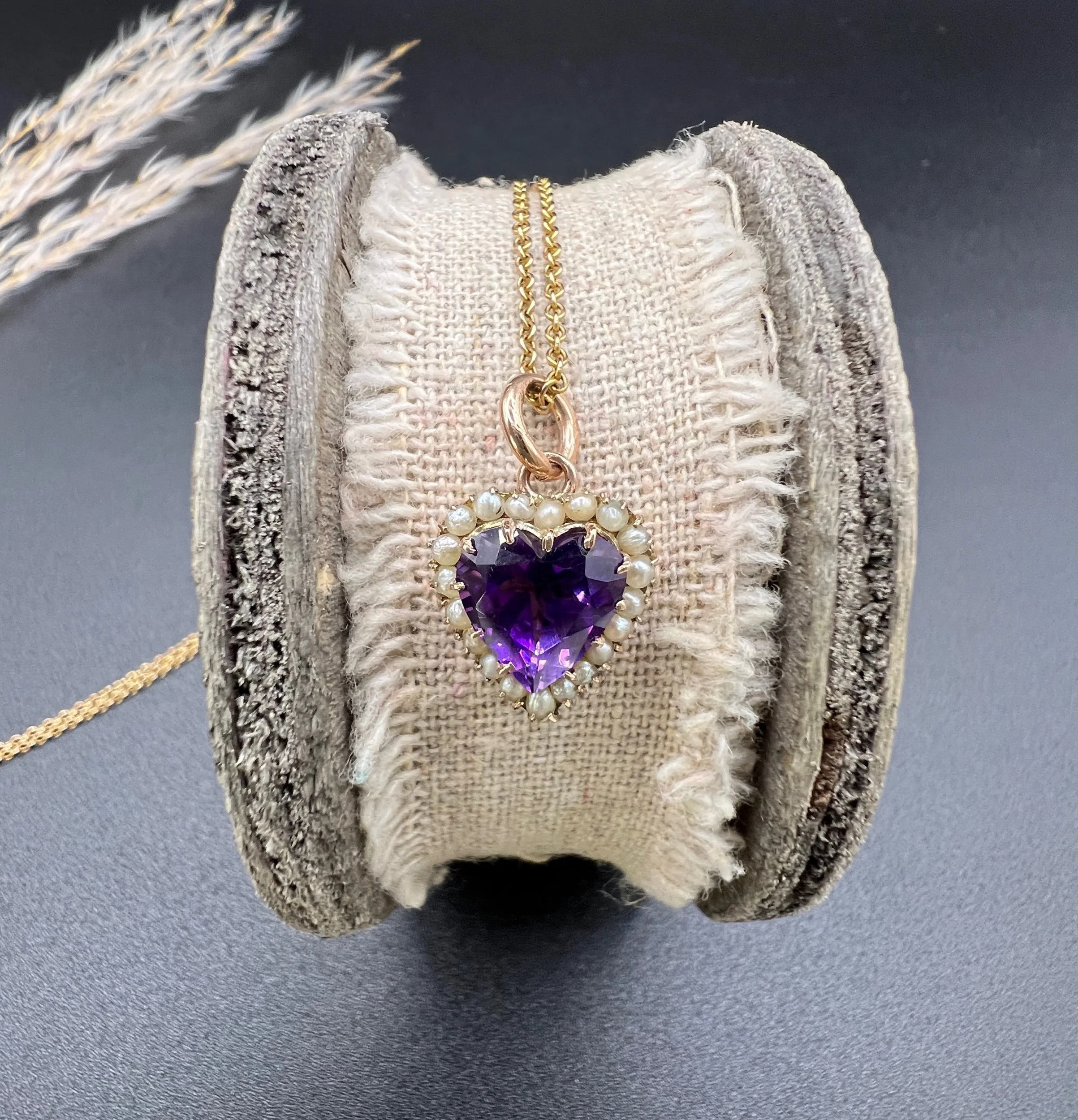 Introducing this exquisite 9ct rose-gold Edwardian heart-shaped pendant, featuring a stunning faceted amethyst heart delicately framed with natural seed pearls. This timeless piece exudes elegance and charm, perfectly capturing the essence of the Edwardian era. It makes a wonderful gift for a loved one or a fabulous addition to your own jewellery collection.