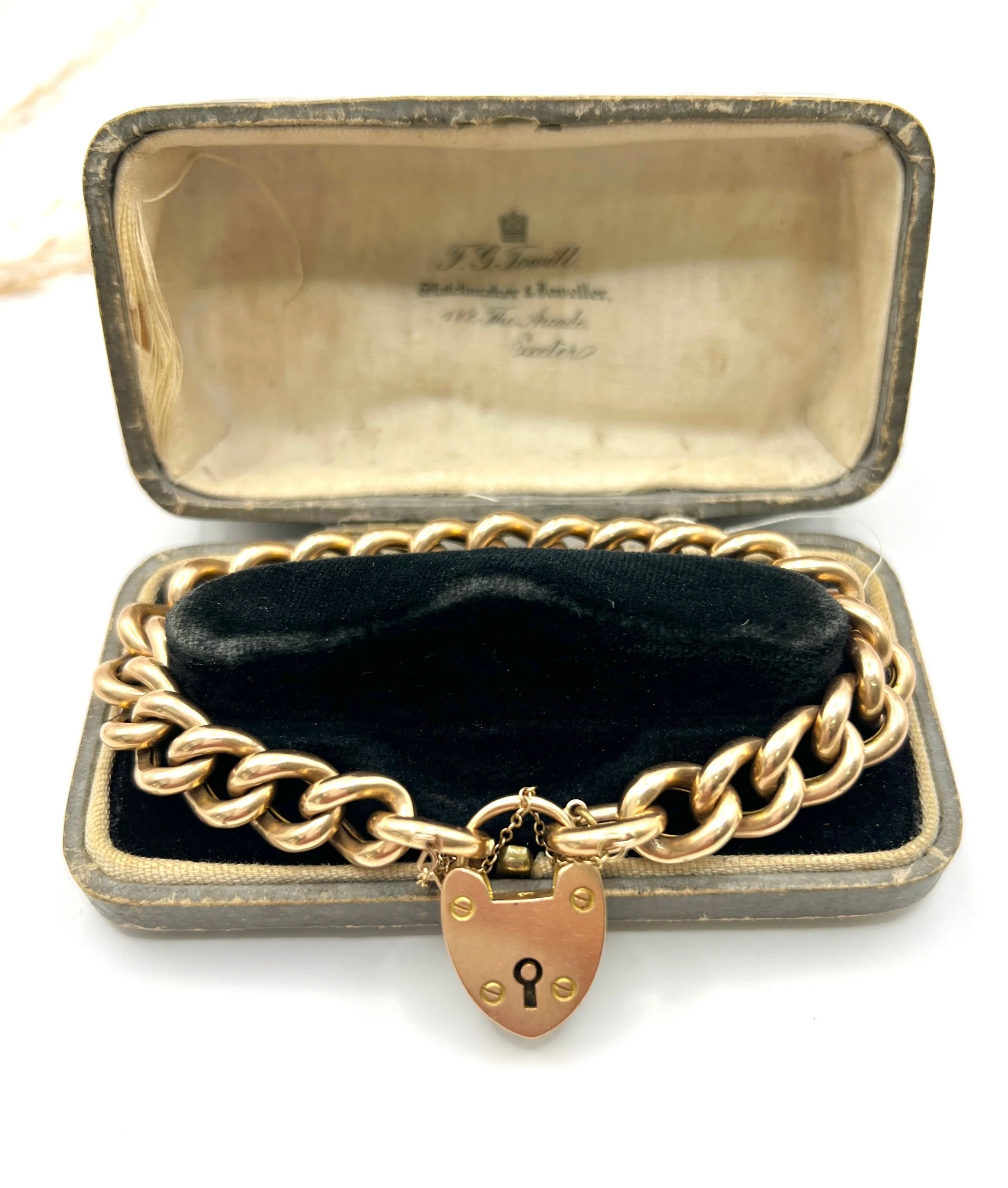 Antique 15ct Rose Gold Stamped, Victorian Curb Link Bracelet with Heart Padlock Clasp