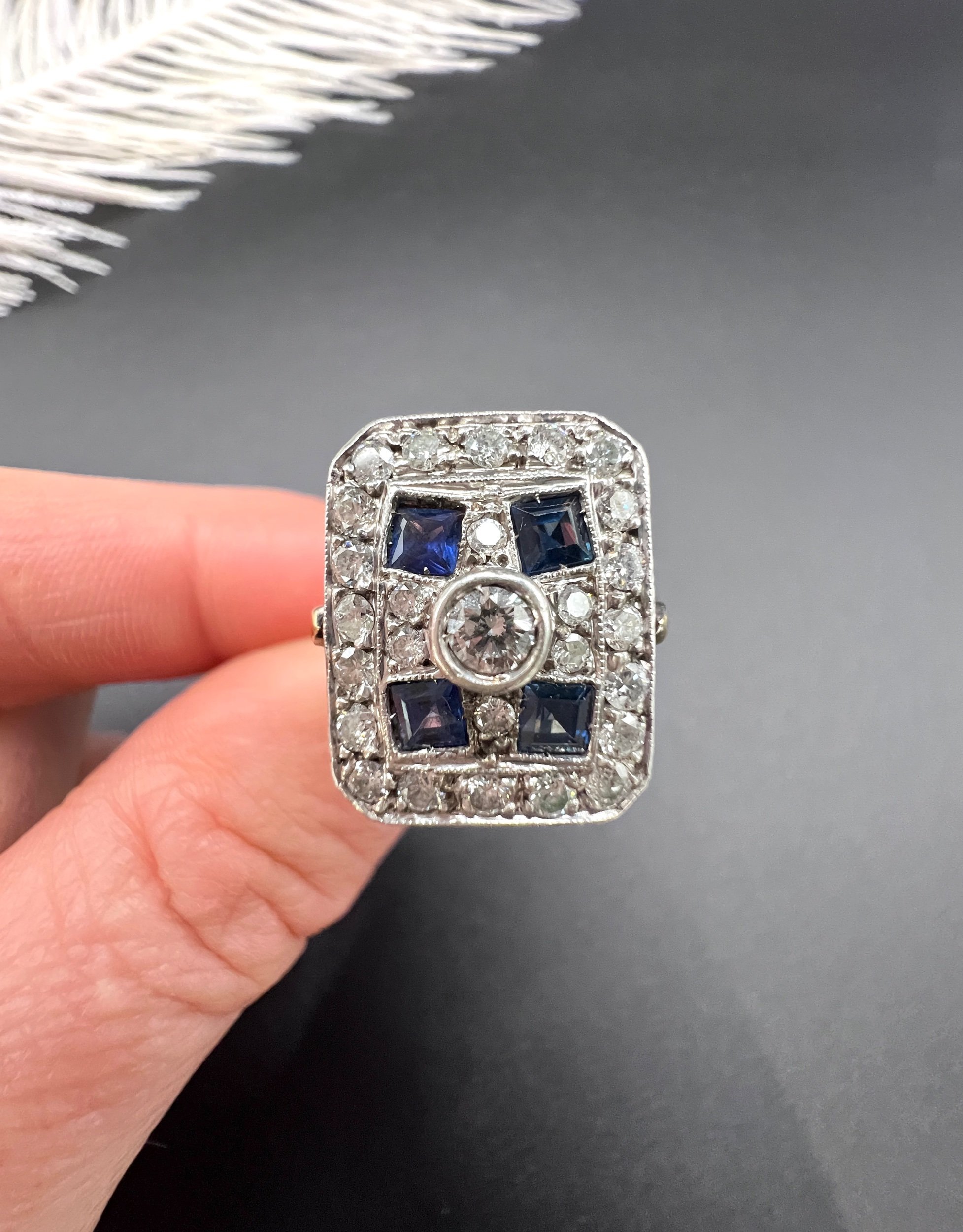 The centrepiece, a bright, sparkling diamond set in a prominent bezel, draws the eye immediately to the heart of the ring. The Sapphires, four deep, velvety blue square-cut sapphires, are precisely calibre-cut to fit the inner frame, providing a rich, royal contrast. The halo of smaller rose-cut and old-cut diamonds fills the rectangular border, accented by delicate milgrain edging for that unmistakable antique texture.