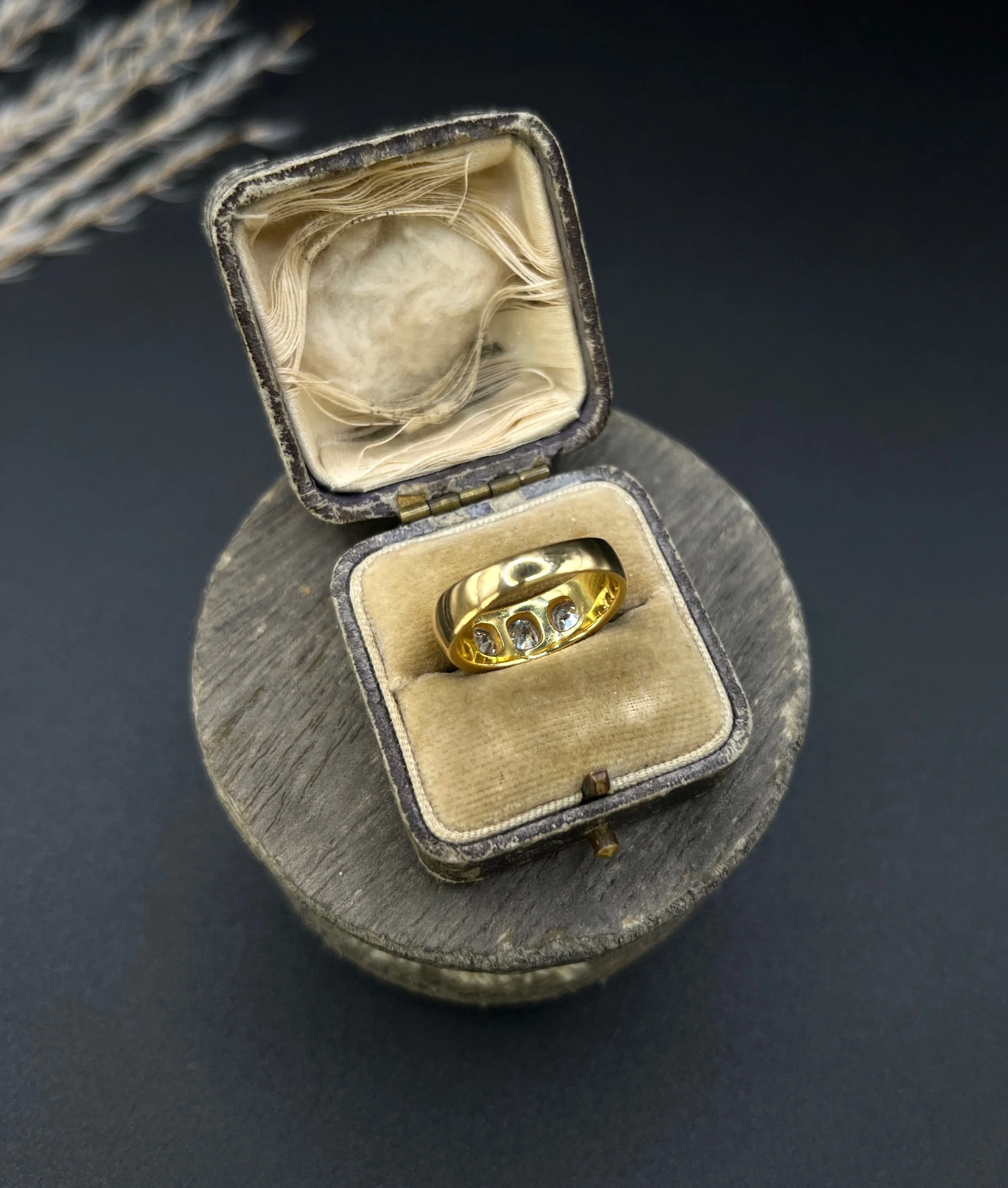 Delve into the elegance of the Edwardian era with this exquisite 18ct yellow gold band ring, showcasing a trio of stunning cushion-cut natural diamonds.