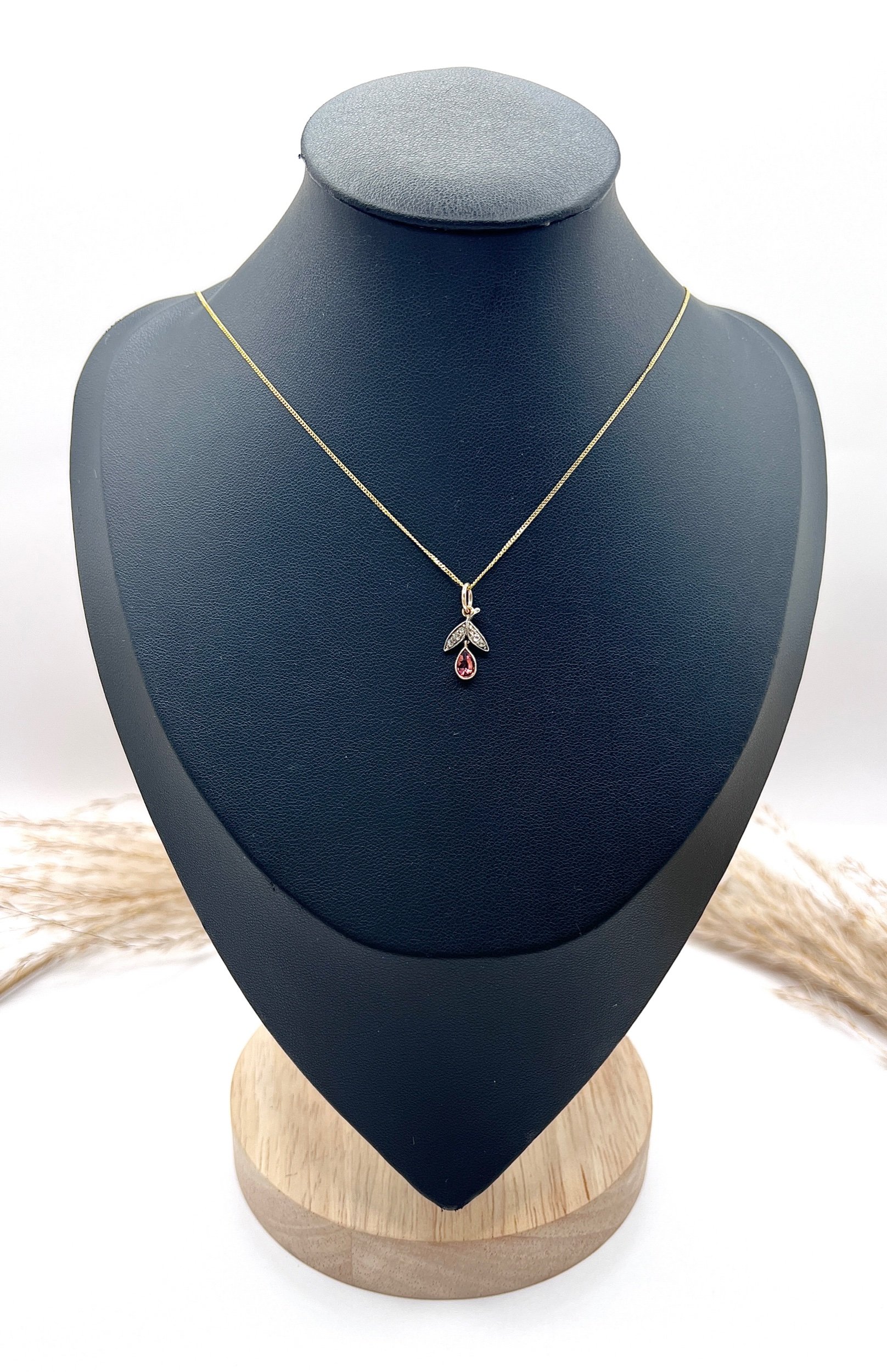 The pendant features two meticulously crafted "petals" or leaves, fashioned in shimmering platinum over 18ct yellow gold to enhance the brilliance of the milgrain-set diamonds. Suspended from this floral bail is a vibrant, pear-cut pink tourmaline, held in a fine bezel setting. The drop is fully articulated, allowing the gemstone to catch the light with every movement.