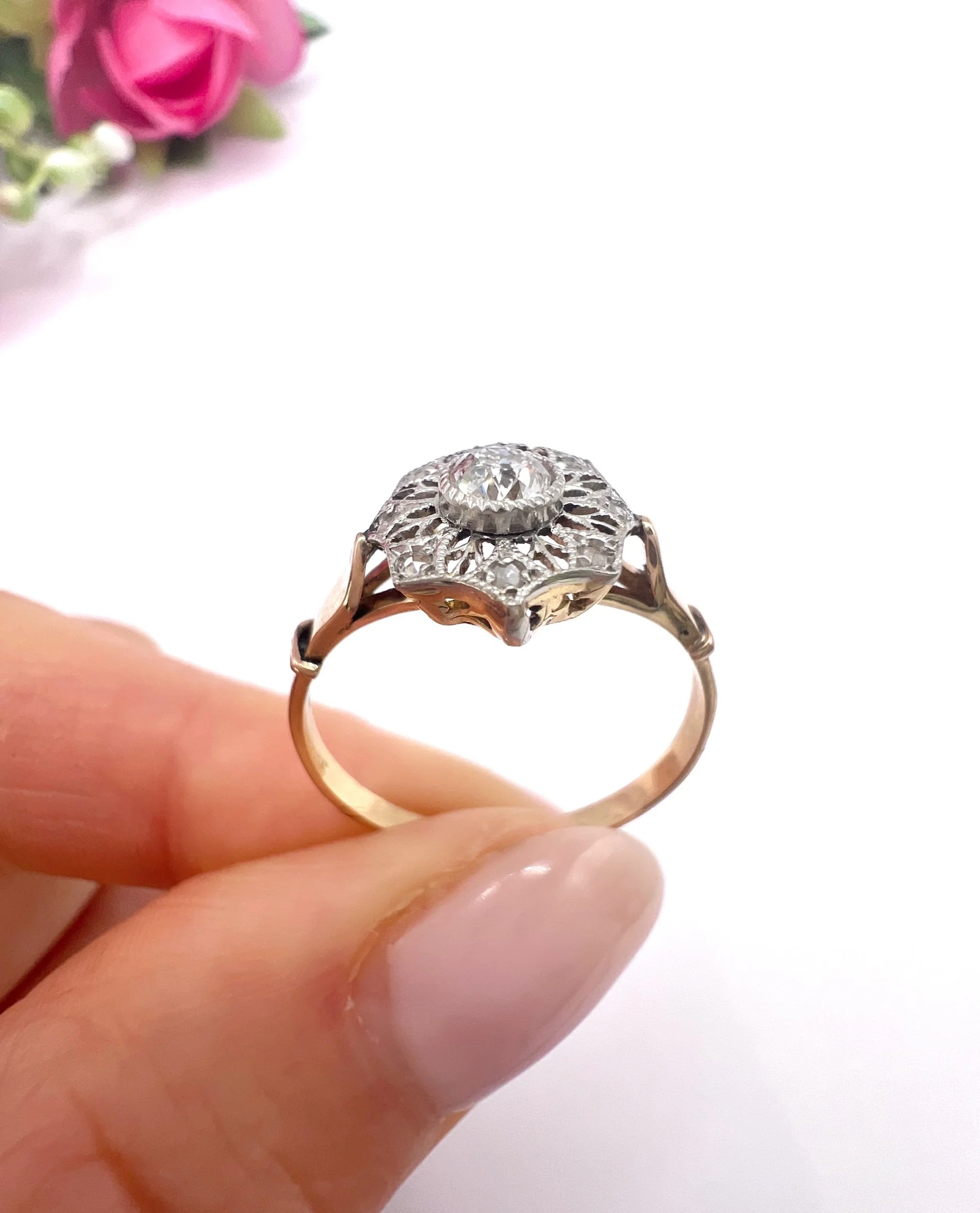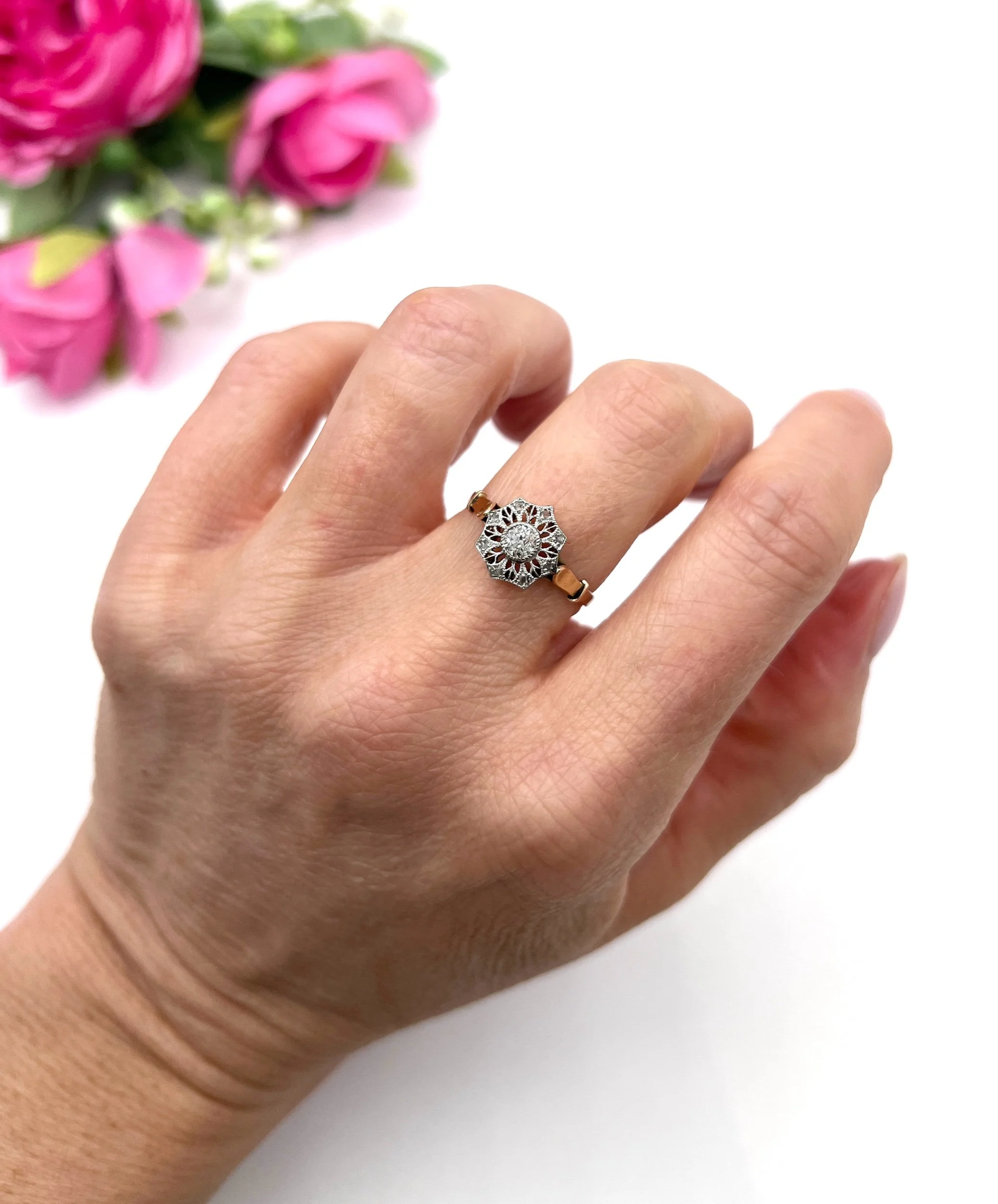 Crafted in rich 18ct gold with a platinum setting, the ring showcases a sparkling old-cut diamond at its centre, encircled by an intricate openwork plaque. The delicate filigree detailing creates a lace-like effect, allowing light to pass through and enhance the brilliance of the stone. The finely pinched shoulders add a graceful taper to the band, drawing the eye toward the central motif and emphasising its refined silhouette.
