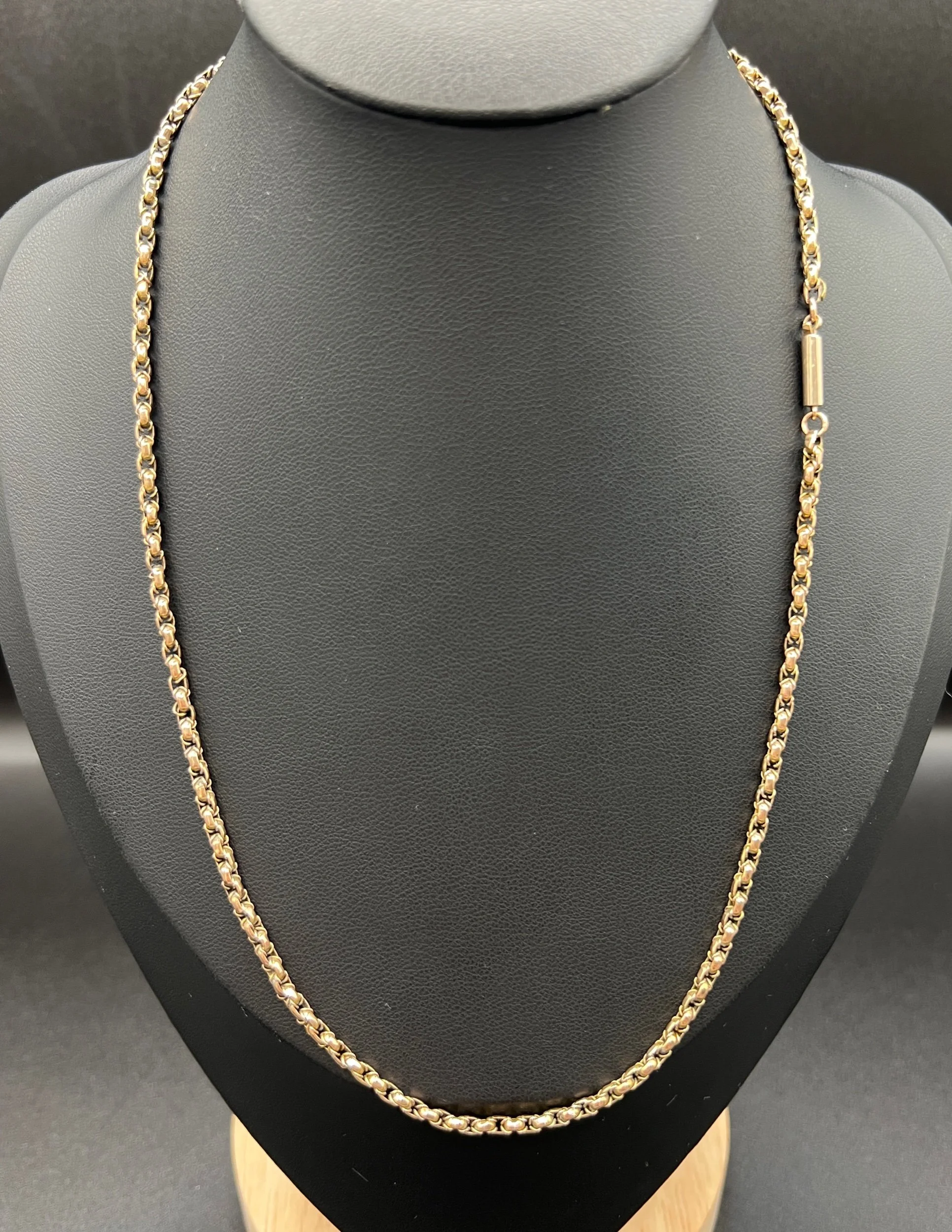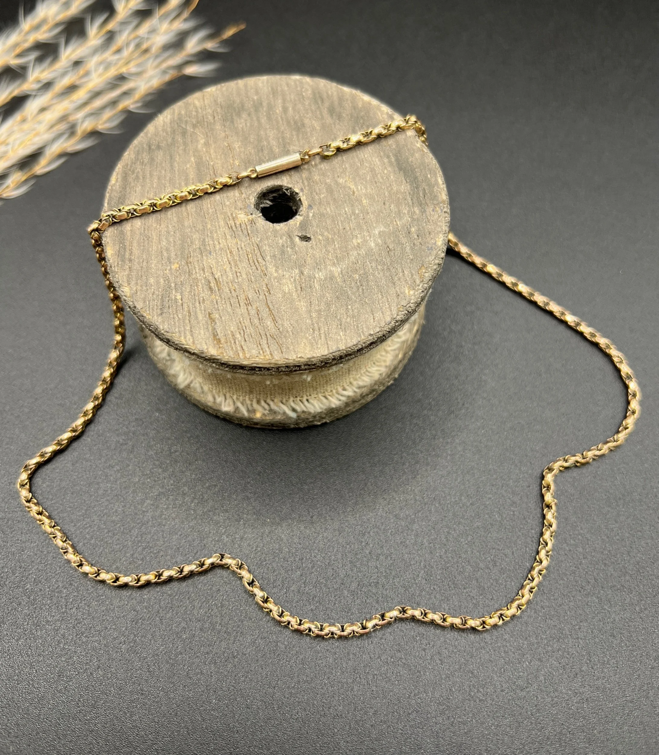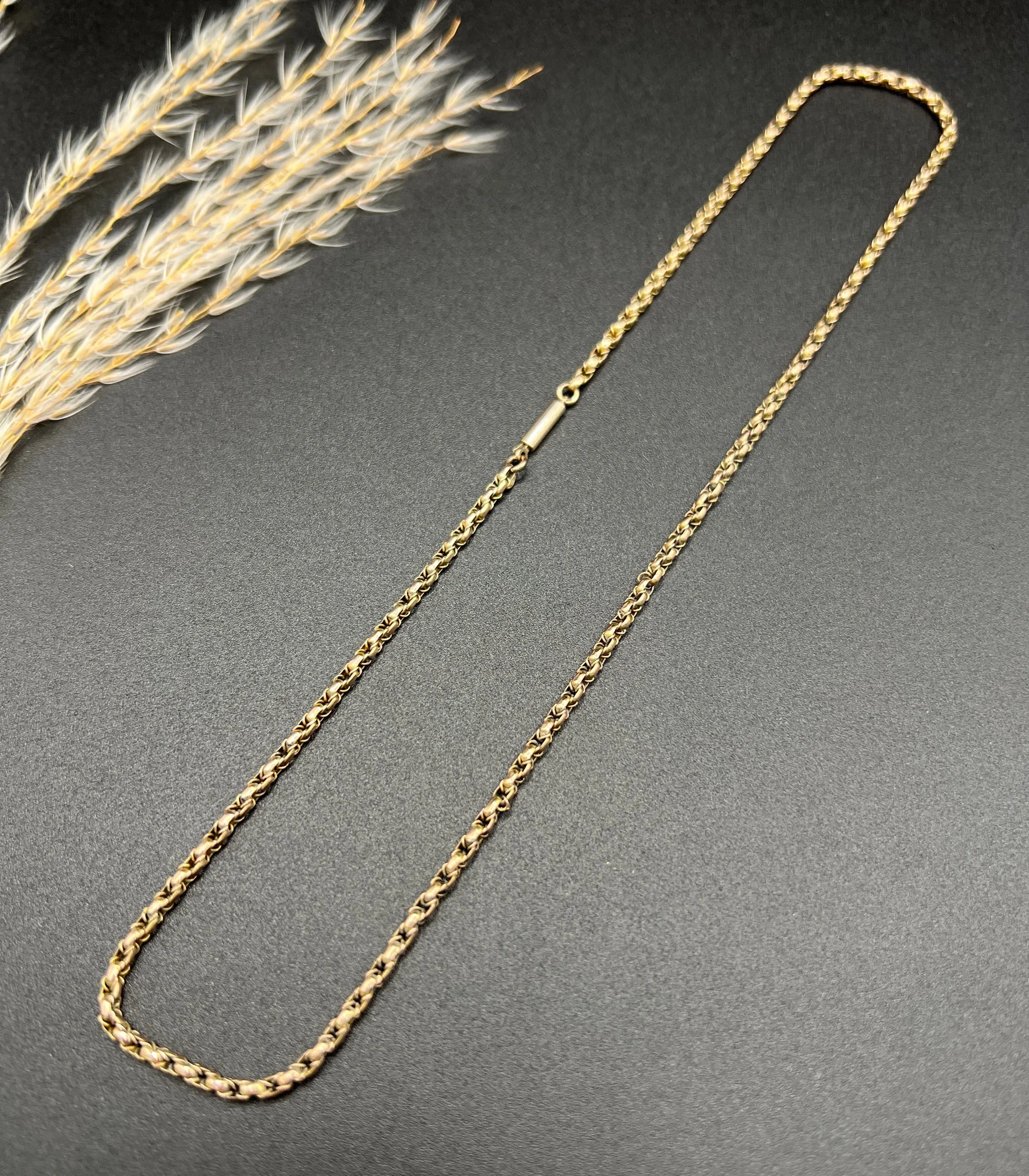 Measuring approximately 17 1/2 inches in length, the chain is perfectly suited for both casual and formal wear. The unique barrel and torpedo clasp adds an extra touch of authenticity and charm. Accompanying the clasp is a delicate 9ct gold tag, further emphasising the quality of this exquisite piece.