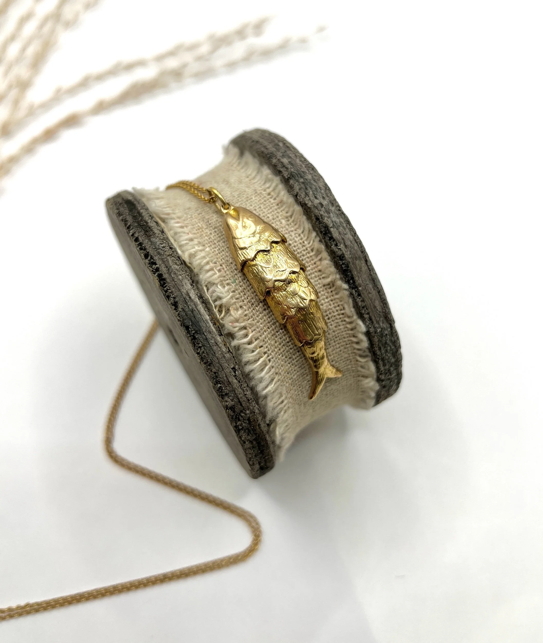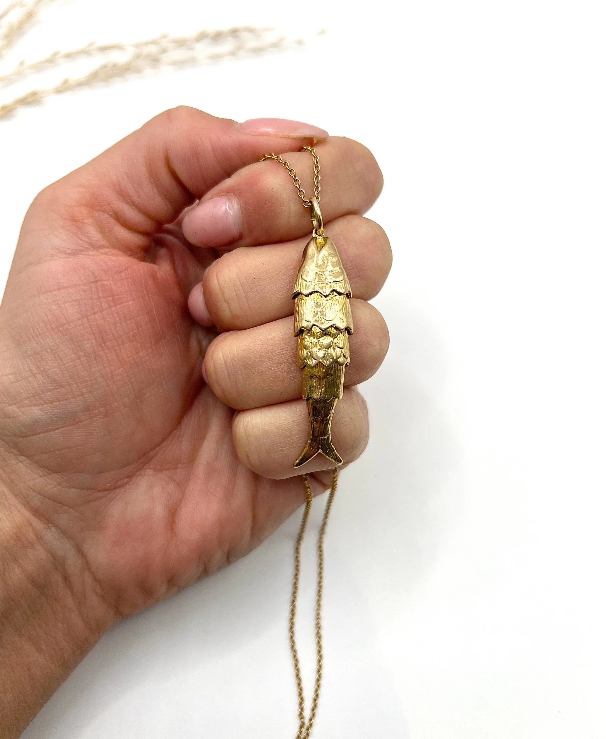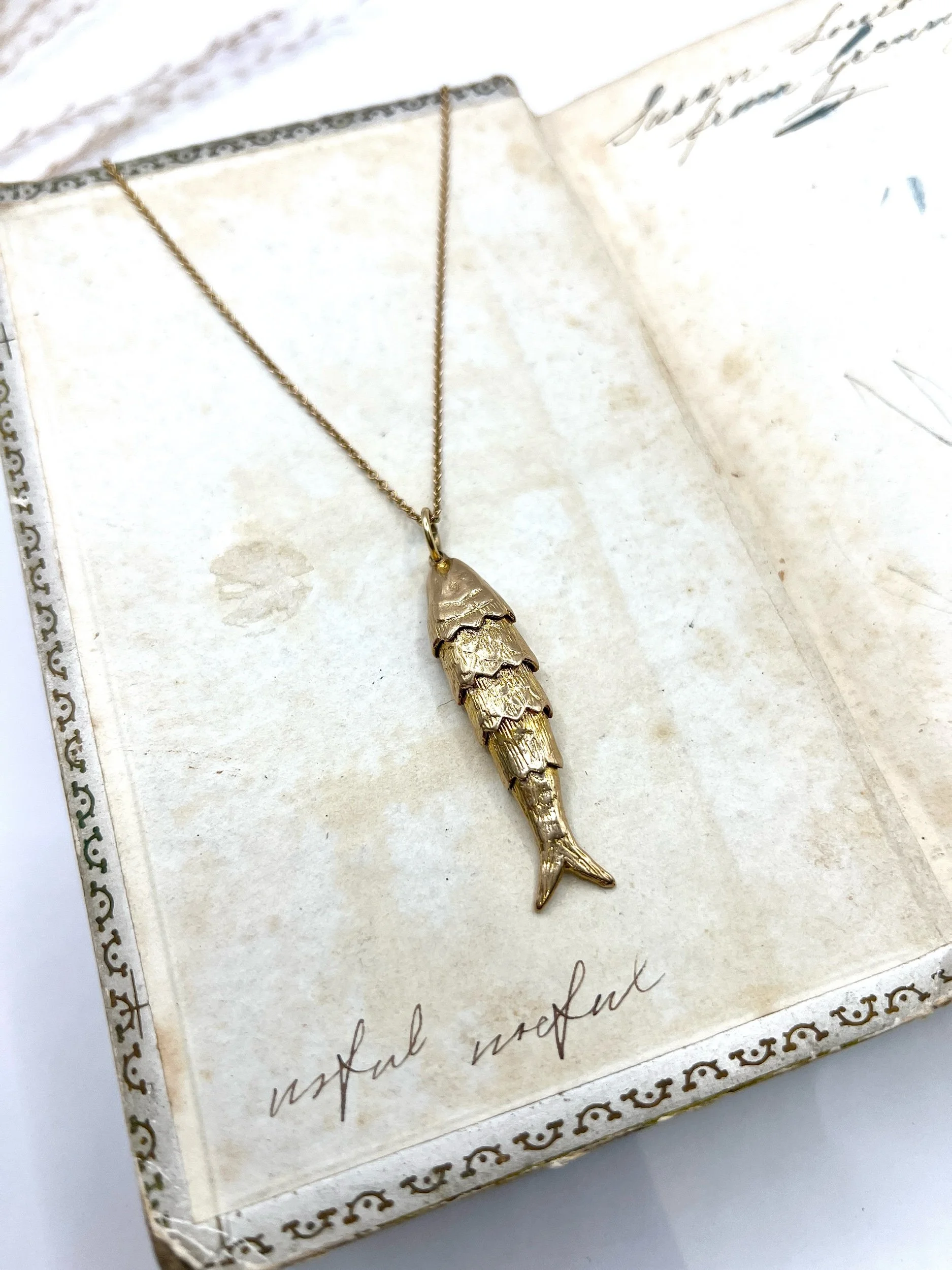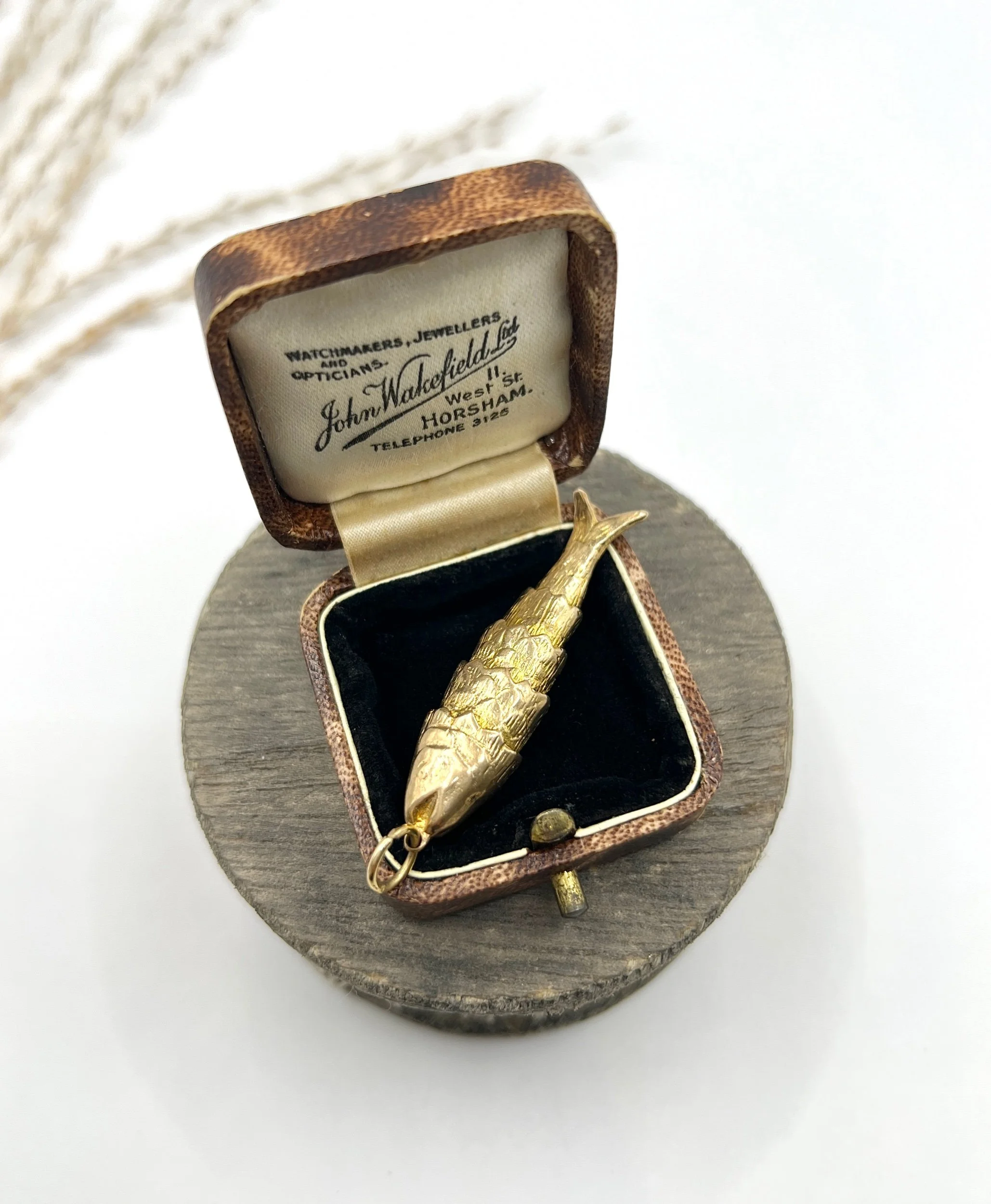 Dive into elegance with our stunning vintage 9ct gold lucky fish pendant, a striking piece that embodies timeless charm. This fabulous pendant showcases a beautifully detailed articulated body, each gill capturing the essence of artistry and craftsmanship from a bygone era.