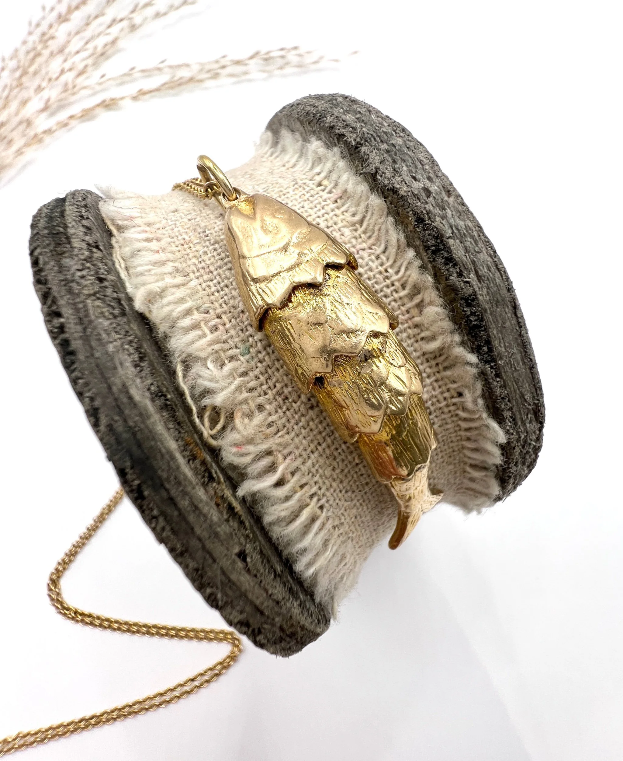 This pendant is designed to make a statement, suspended gracefully from one of our exquisite vintage gold chains. Its intricate design and thoughtful detailing give it a lively, dynamic quality, making it a standout addition to any jewellery collection.