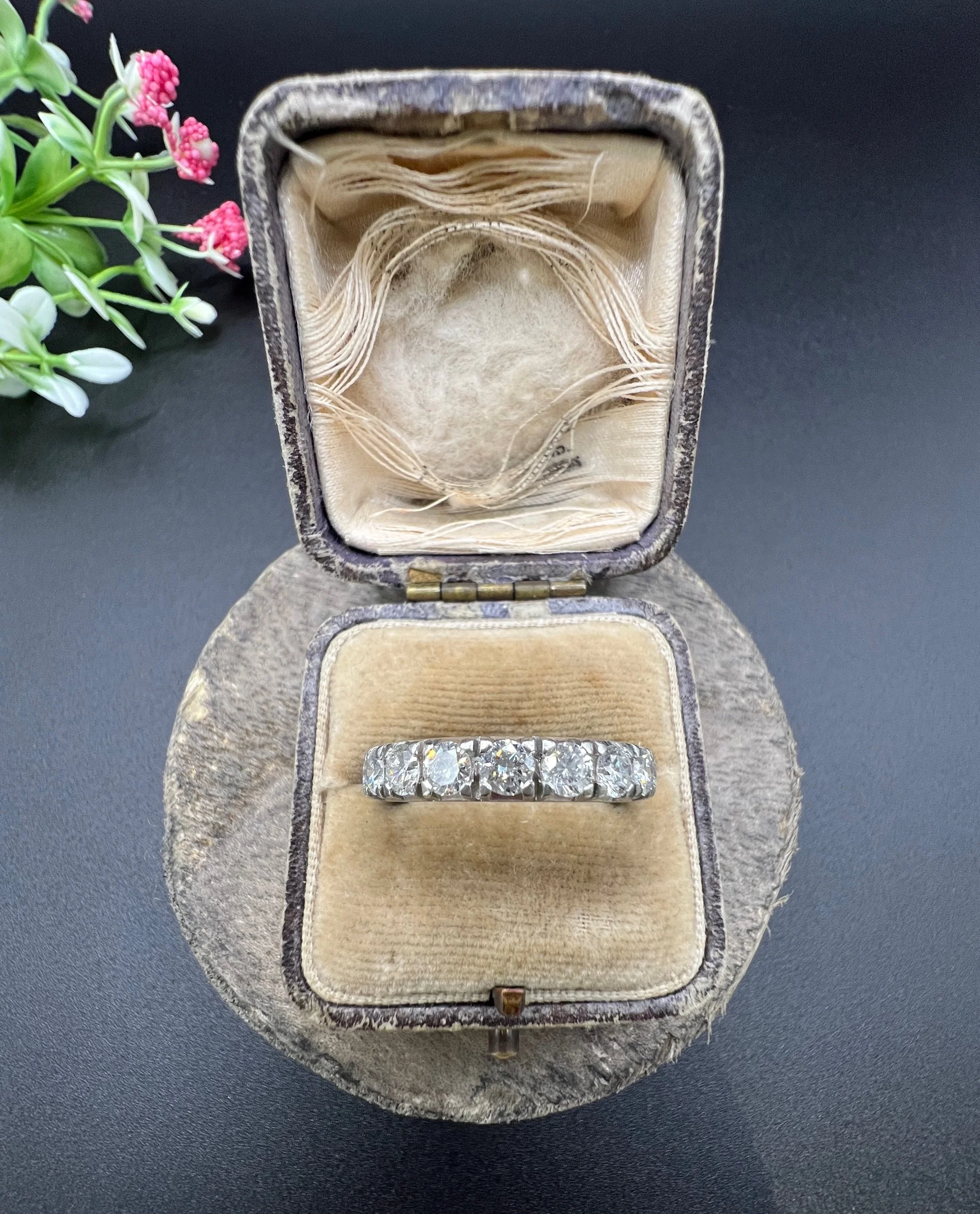 Step back in time with this exquisite 1940s eternity ring, expertly crafted in platinum and adorned with approximately 2.70 carats of high-quality French diamonds. The stunning diamonds are set to create a continuous band of brilliance, symbolising everlasting love and commitment.
