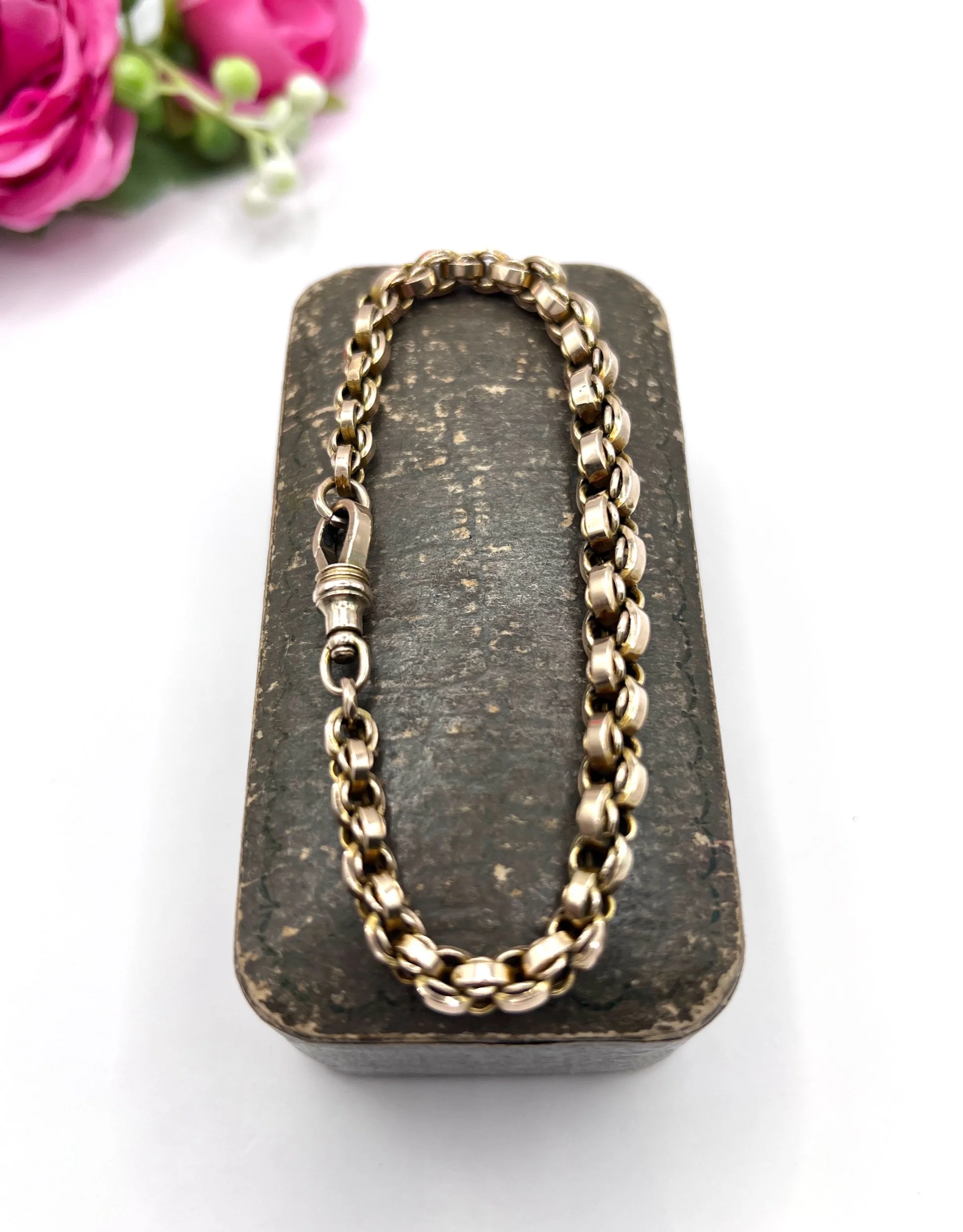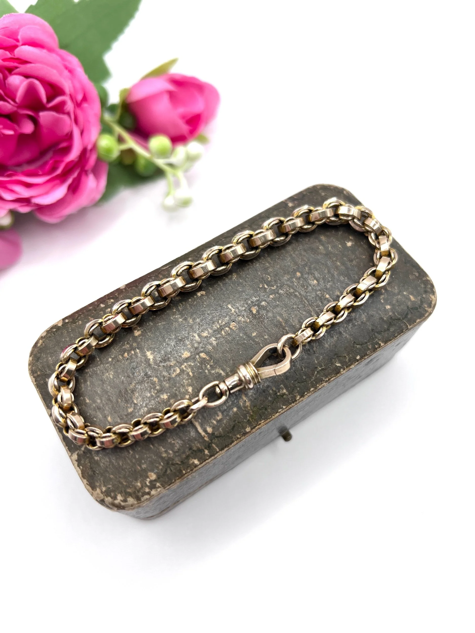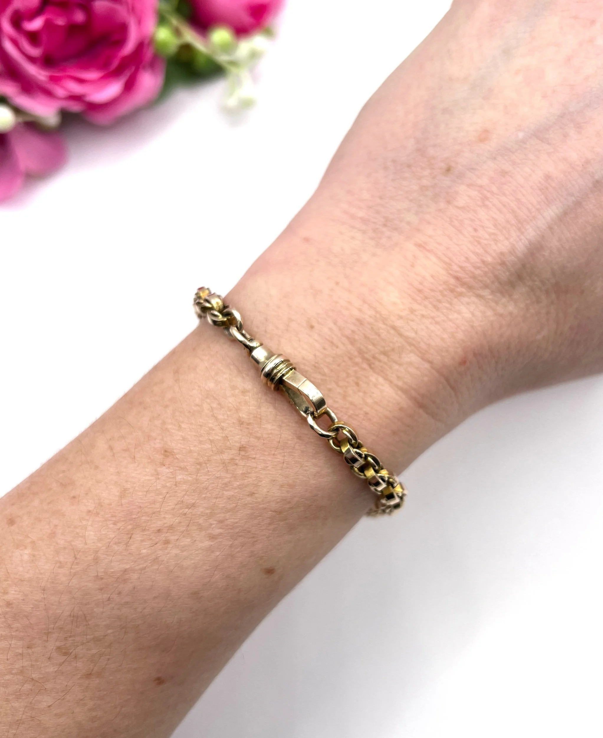 Step back in time with this exquisite Edwardian bracelet, showcasing a stunning fancy rolo-link design. Crafted from luxurious 9ct gold, this piece embodies the elegance of the early 20th century. The graduated links are perfectly interwoven with smaller inner links, creating a captivating visual texture that catches the light beautifully. The bracelet features a reliable swivel clasp for secure wear, ensuring both style and practicality. In our opinion, the colour is a slightly paler rose gold.