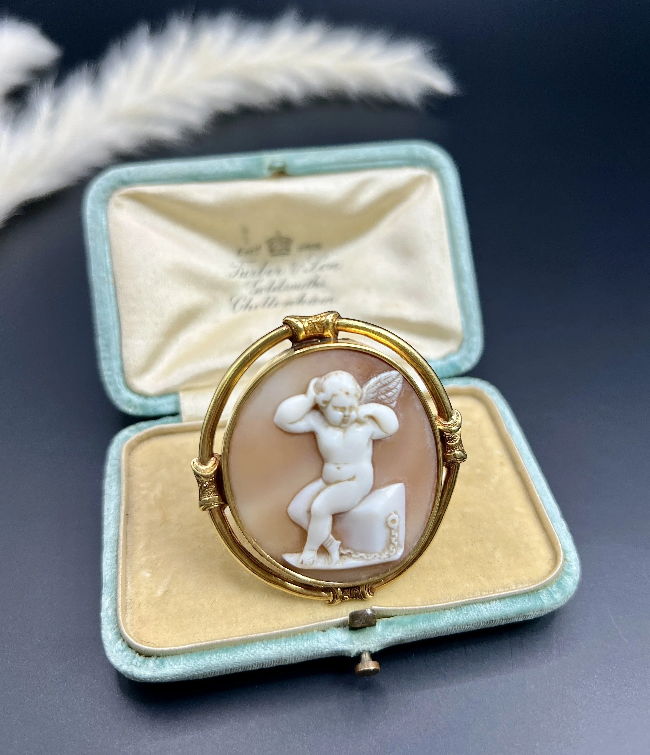 This exquisite brooch showcases a charming cherub intricately carved from shell, encased in a stunning 15ct yellow gold frame. This piece beautifully captures the artistry and craftsmanship of the early Victorian era.