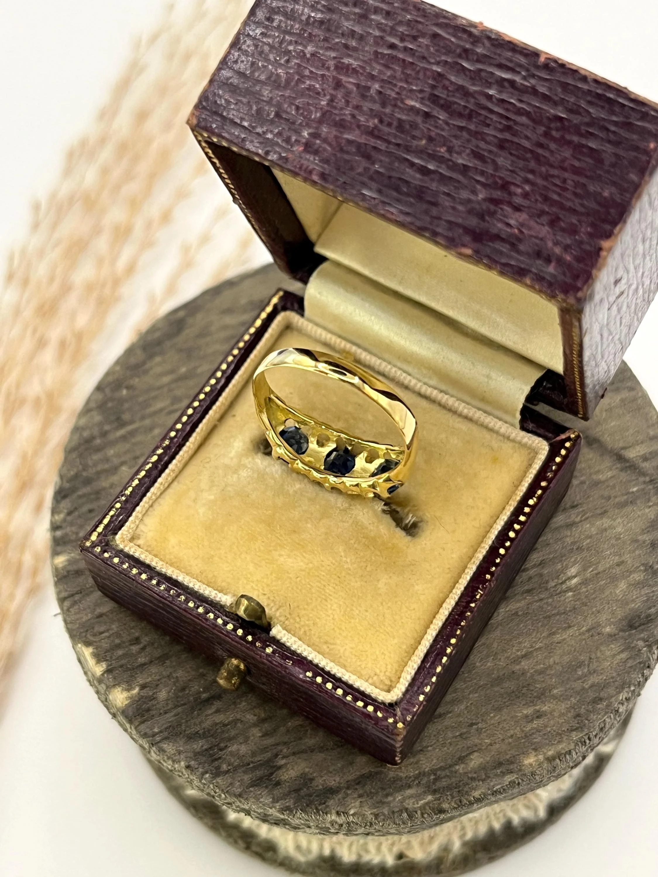 Gorgeous Victorian Gypsy Ring. Set with Six Natural Seed Pearls, Two Rubies & Pretty Carved Shoulders.