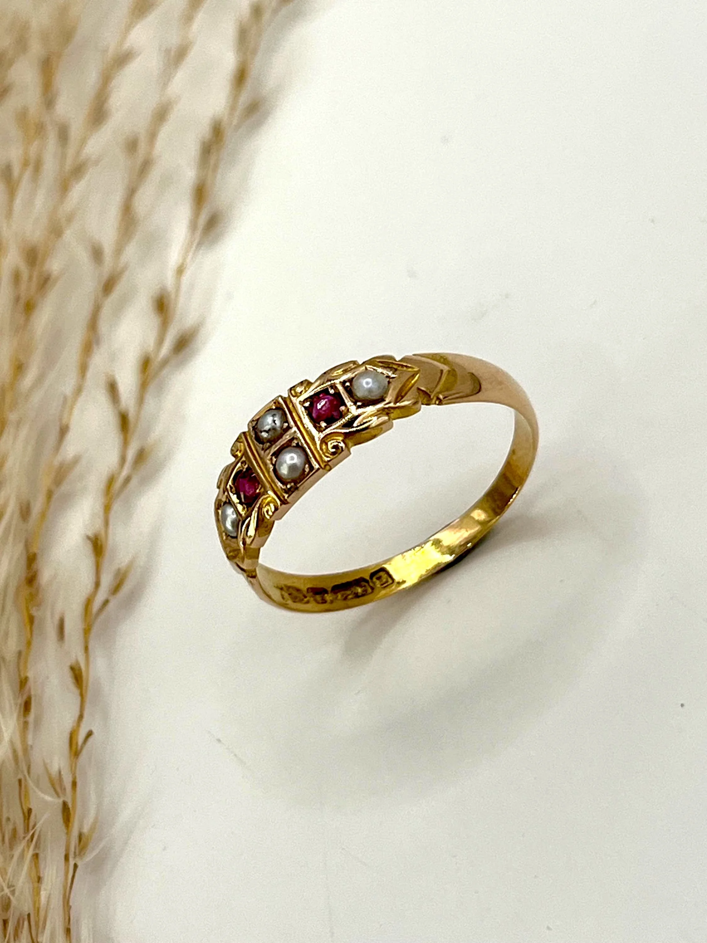 Antique 15ct Gold, Victorian Ruby & Pearl Ring With Pretty Carved Shoulders, Hallmarked Chester 1886