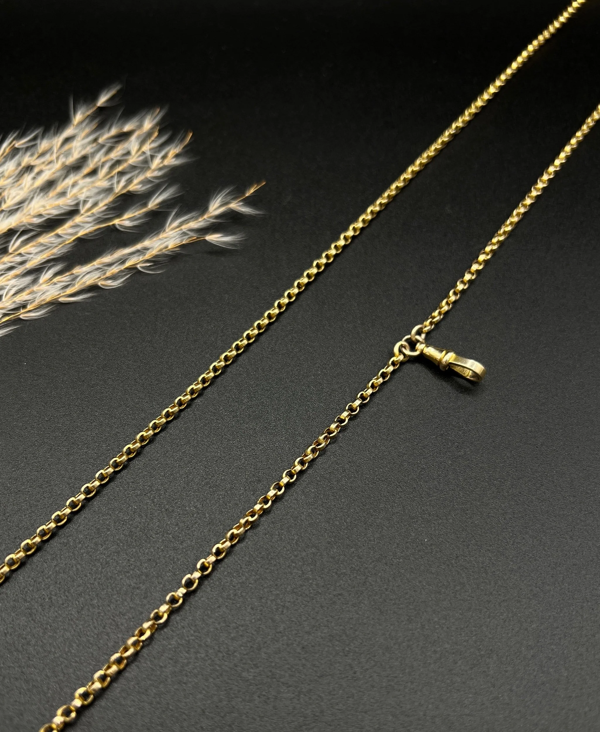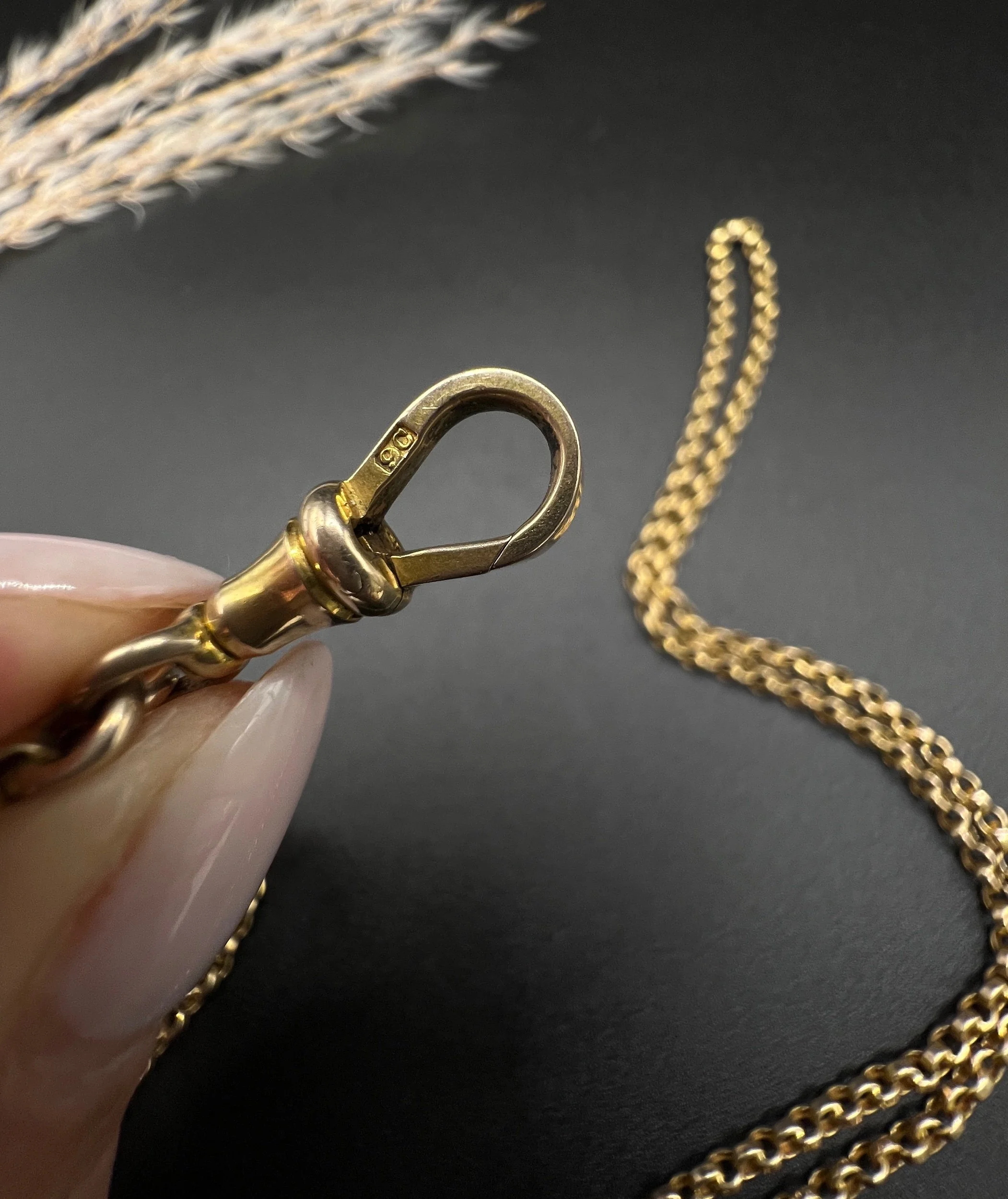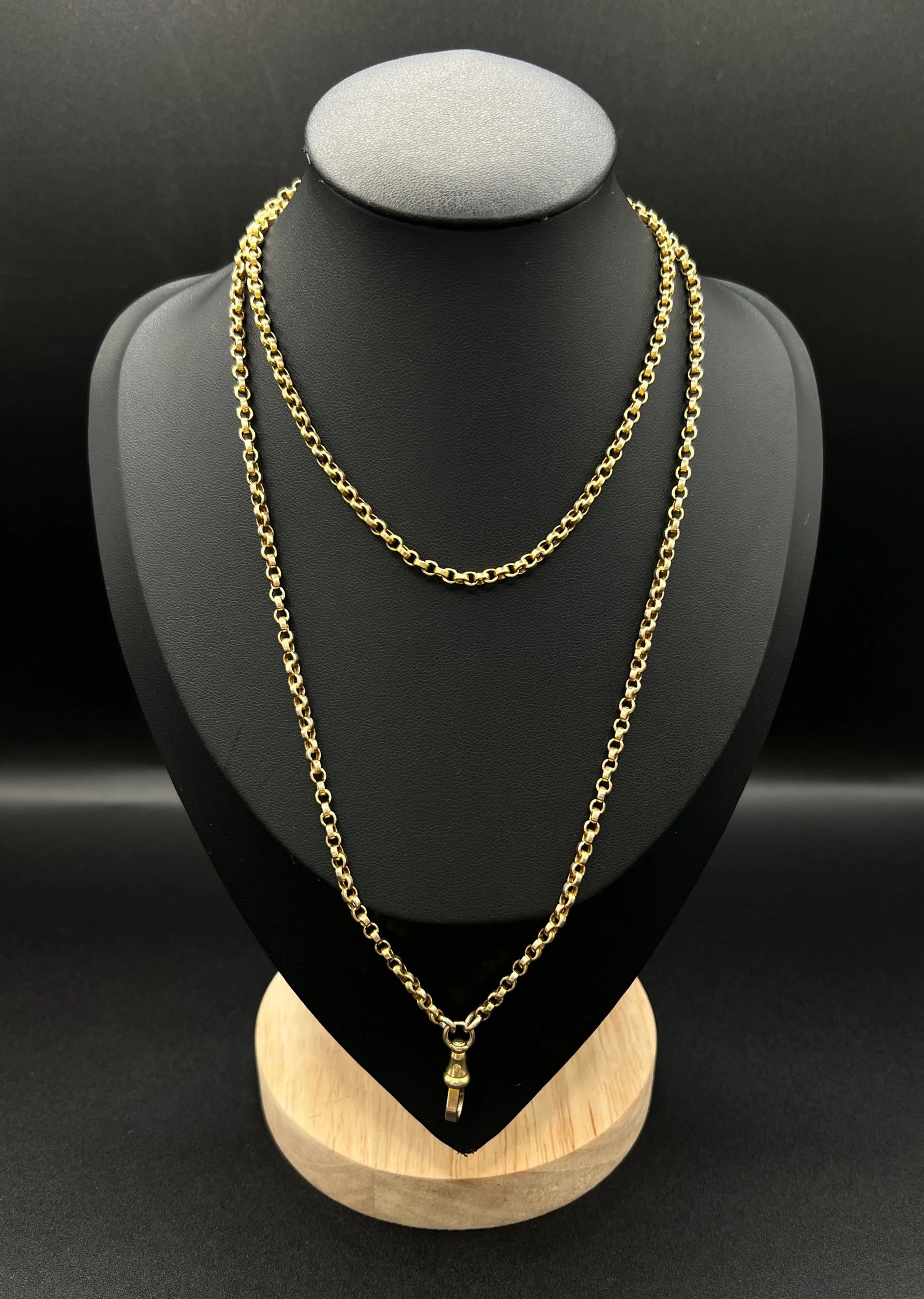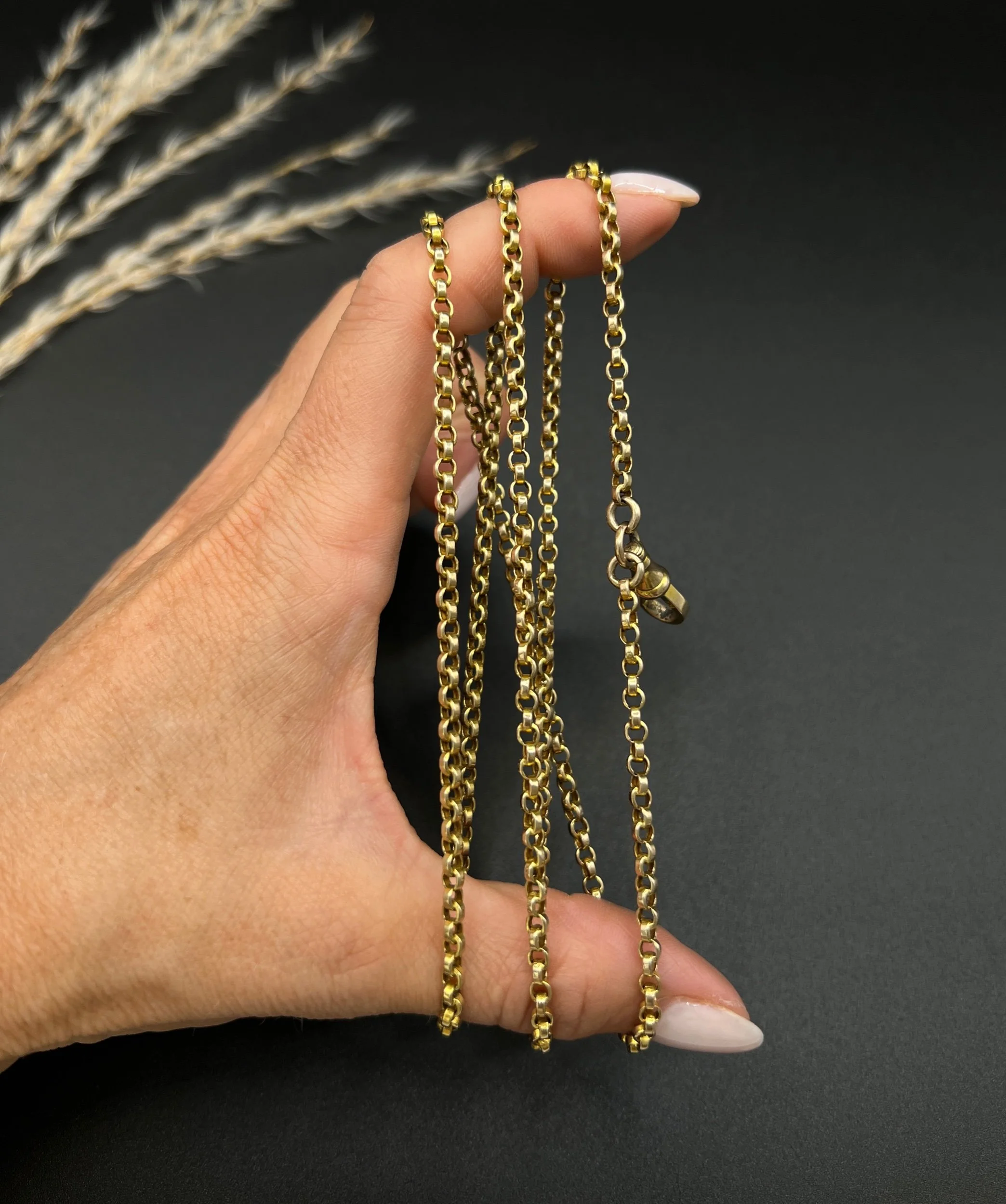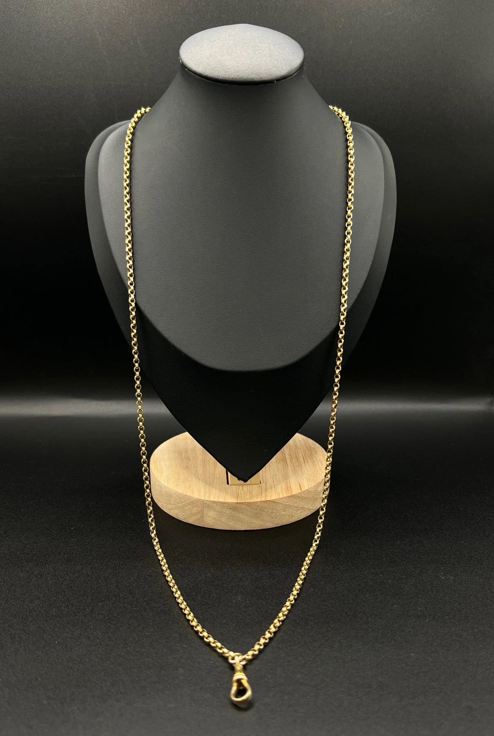 This exquisite Edwardian rolo link chain, stamped 9ct is a true masterpiece that will enhance any outfit. The chain measures approximately 30 1/2 inches in length and features a swivel clip, perfect for attaching fobs or charms. With a width of 3mm, it is ideal for layering with other gold chains or wearing alone as a statement piece.
