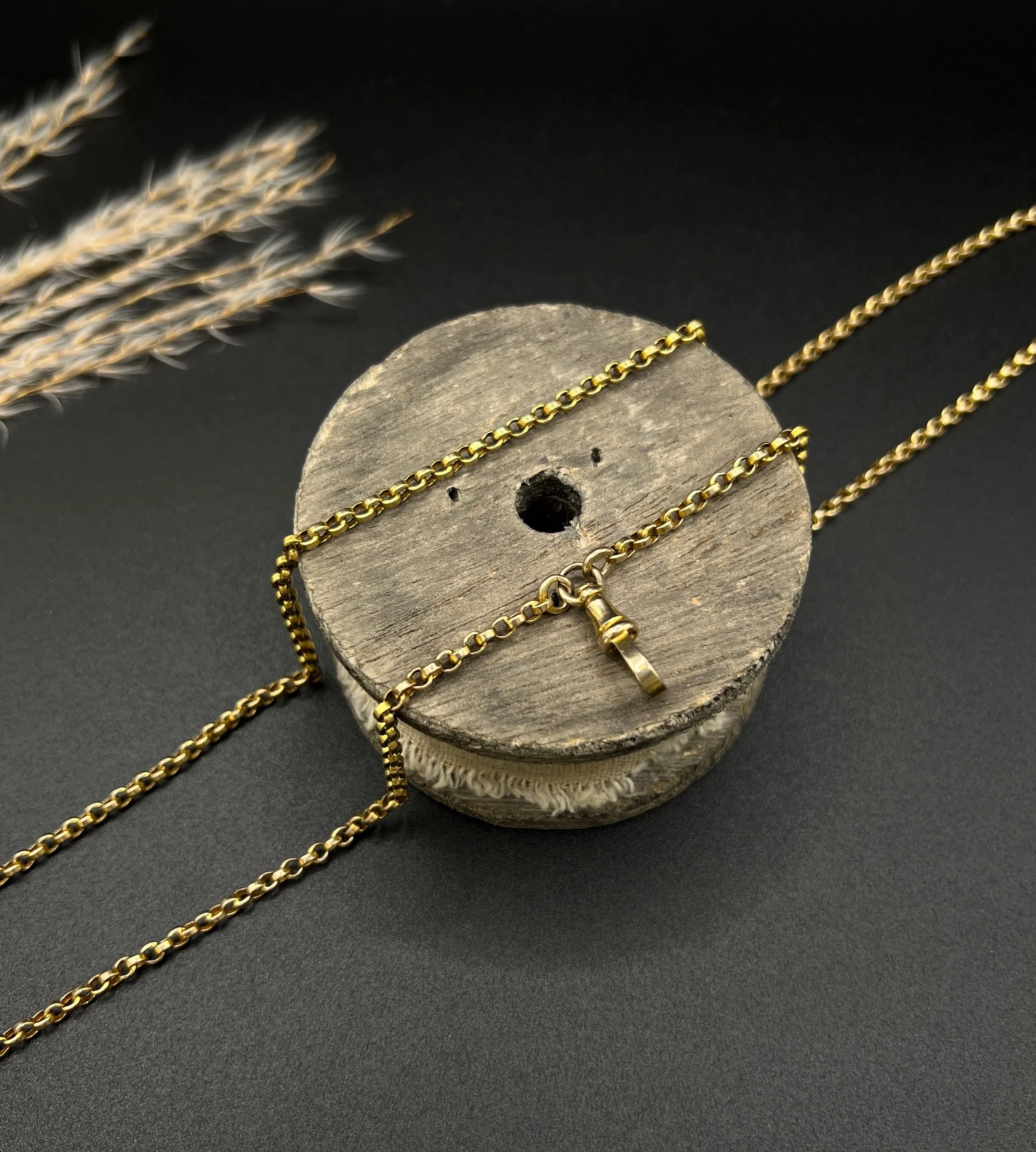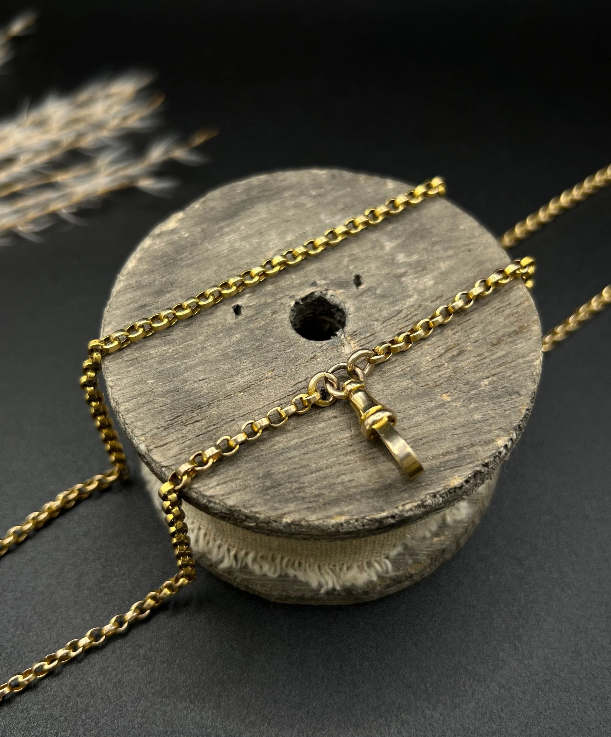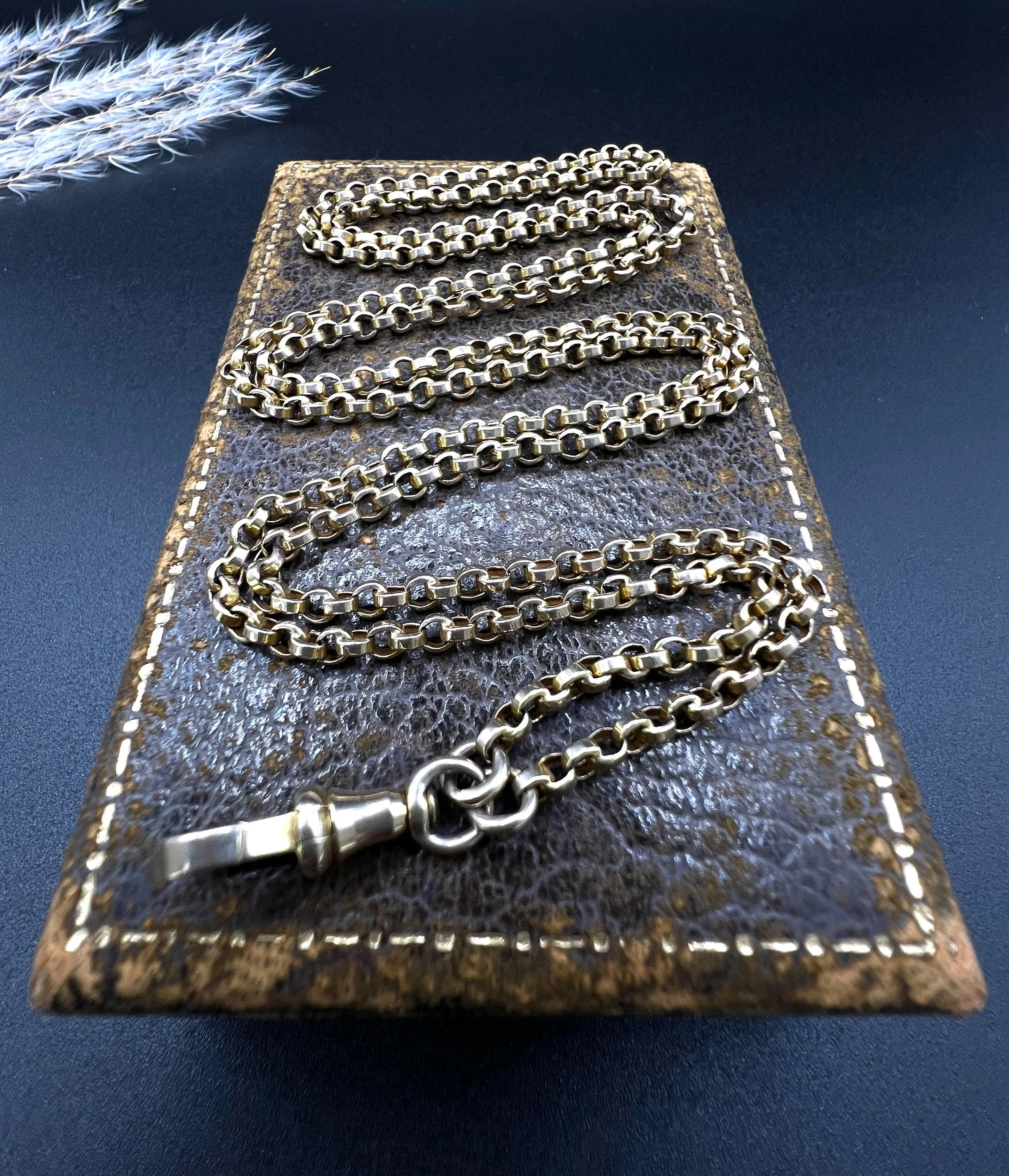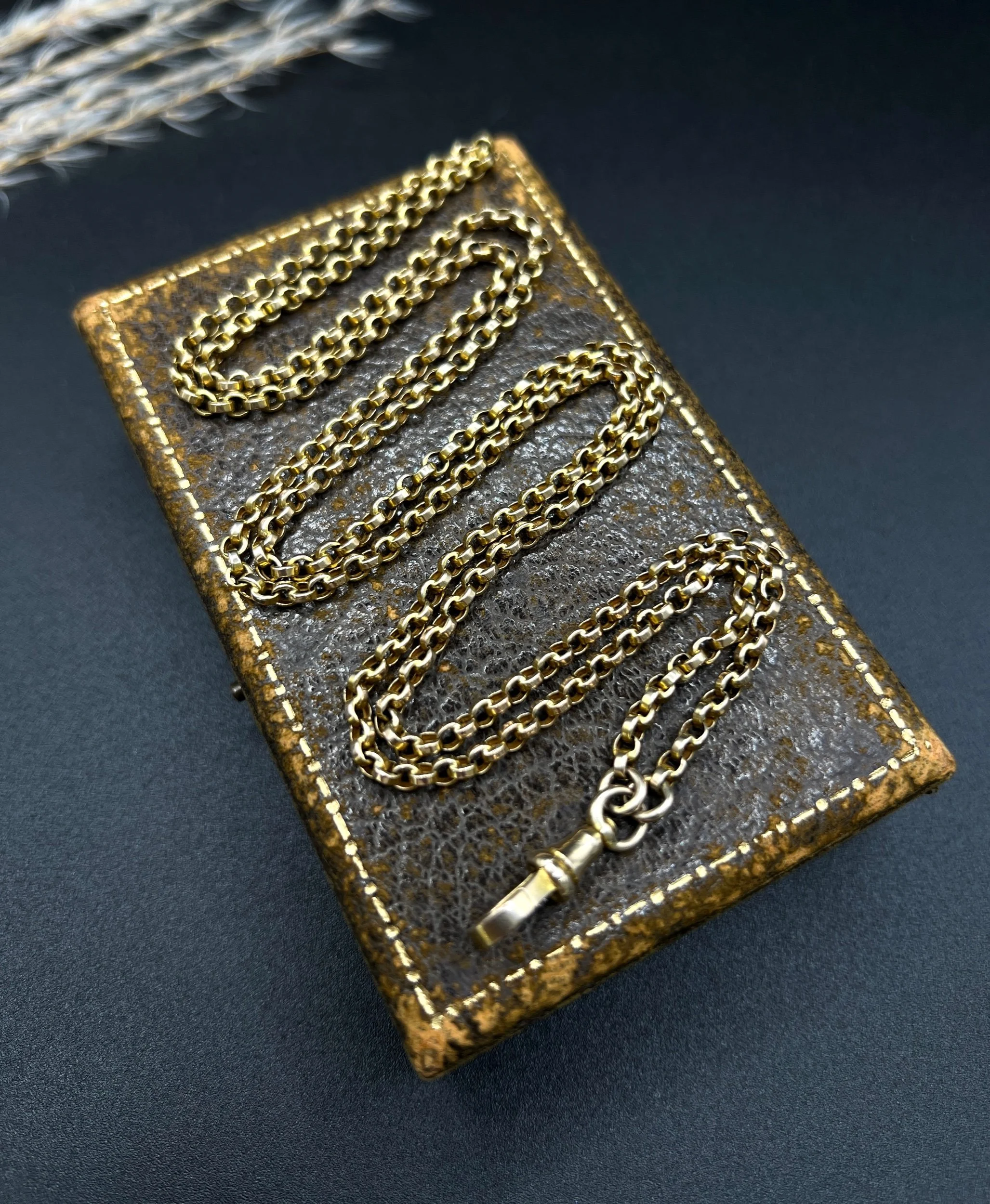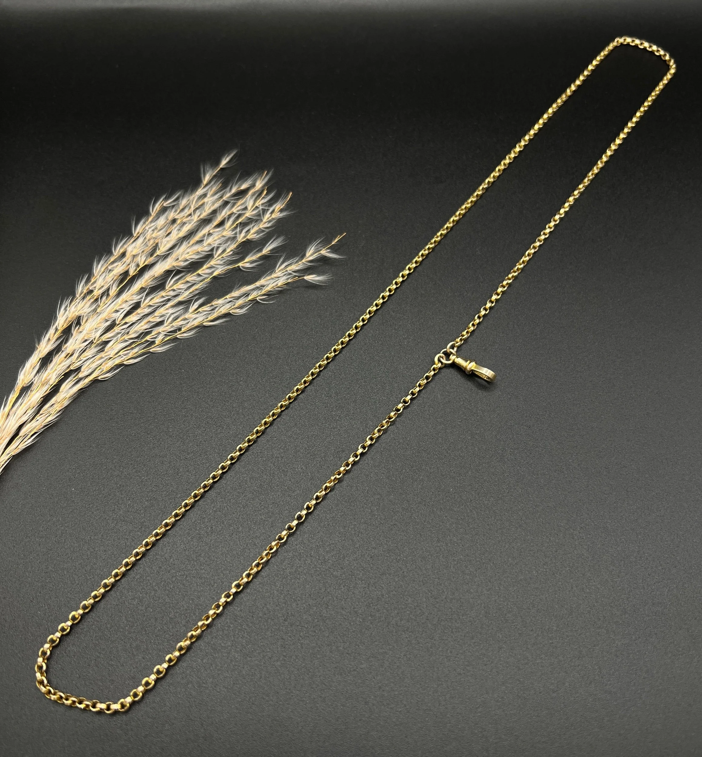 This exquisite Edwardian rolo link chain, stamped 9ct is a true masterpiece that will enhance any outfit. The chain measures approximately 30 1/2 inches in length and features a swivel clip, perfect for attaching fobs or charms. With a width of 3mm, it is ideal for layering with other gold chains or wearing alone as a statement piece.