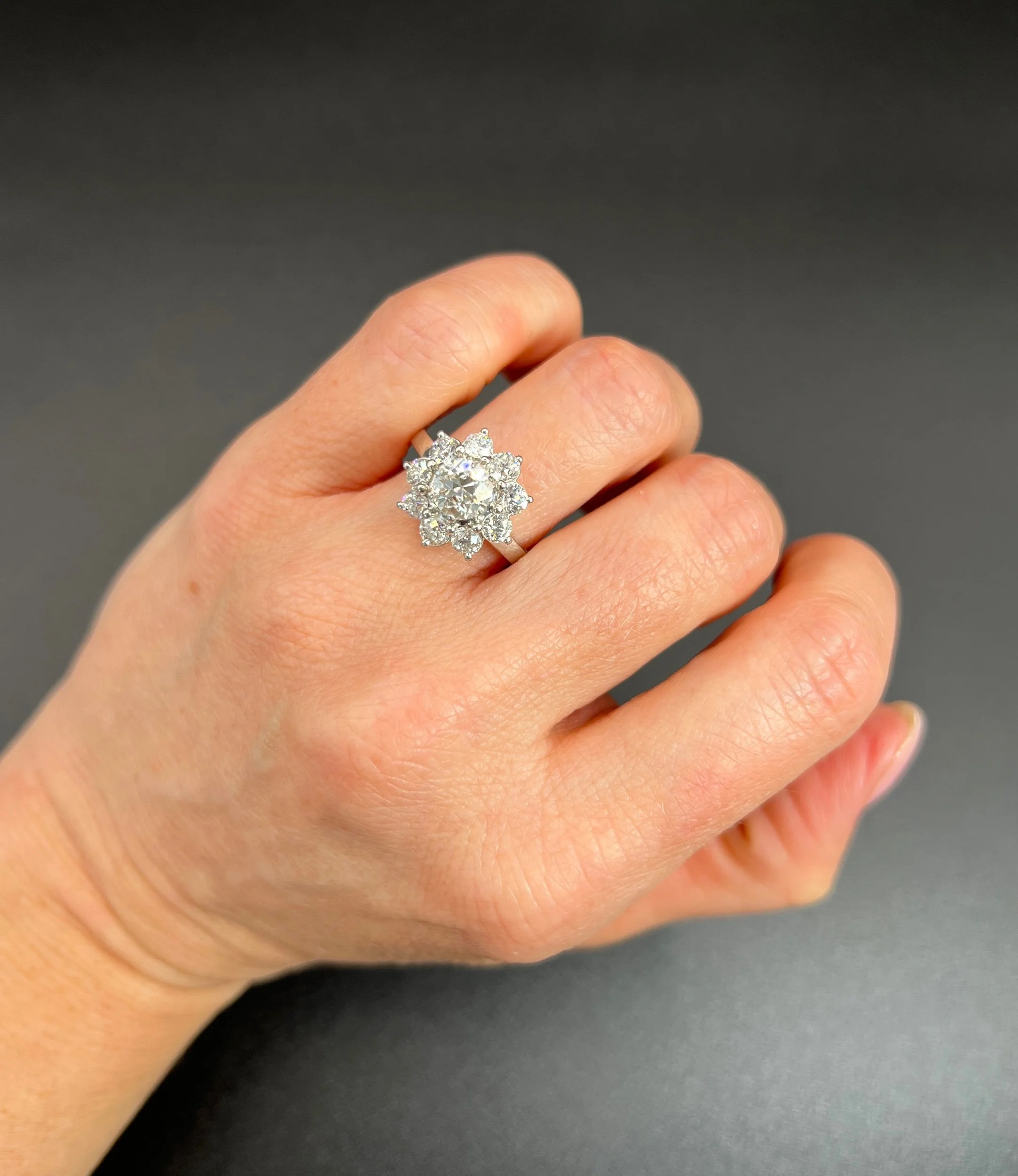 Vintage Platinum, 1980s 2.20 Carat Diamond Daisy Cluster Ring, Vintage Engagement Ring