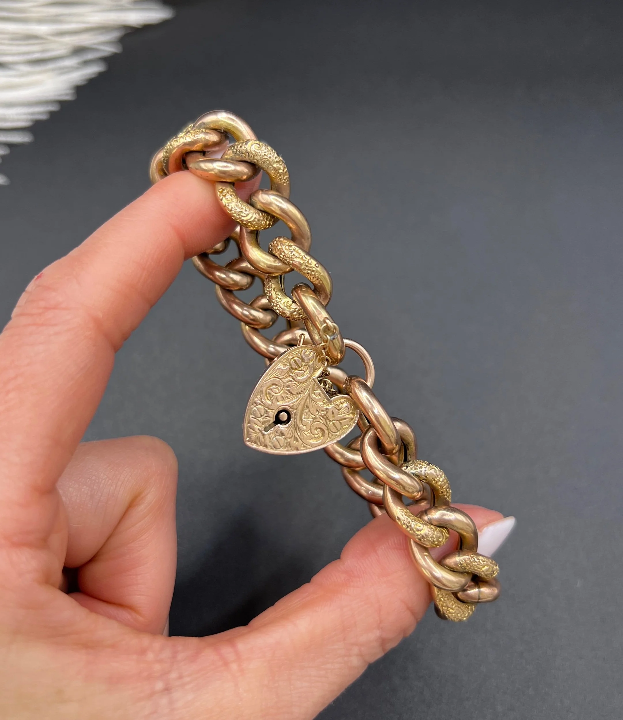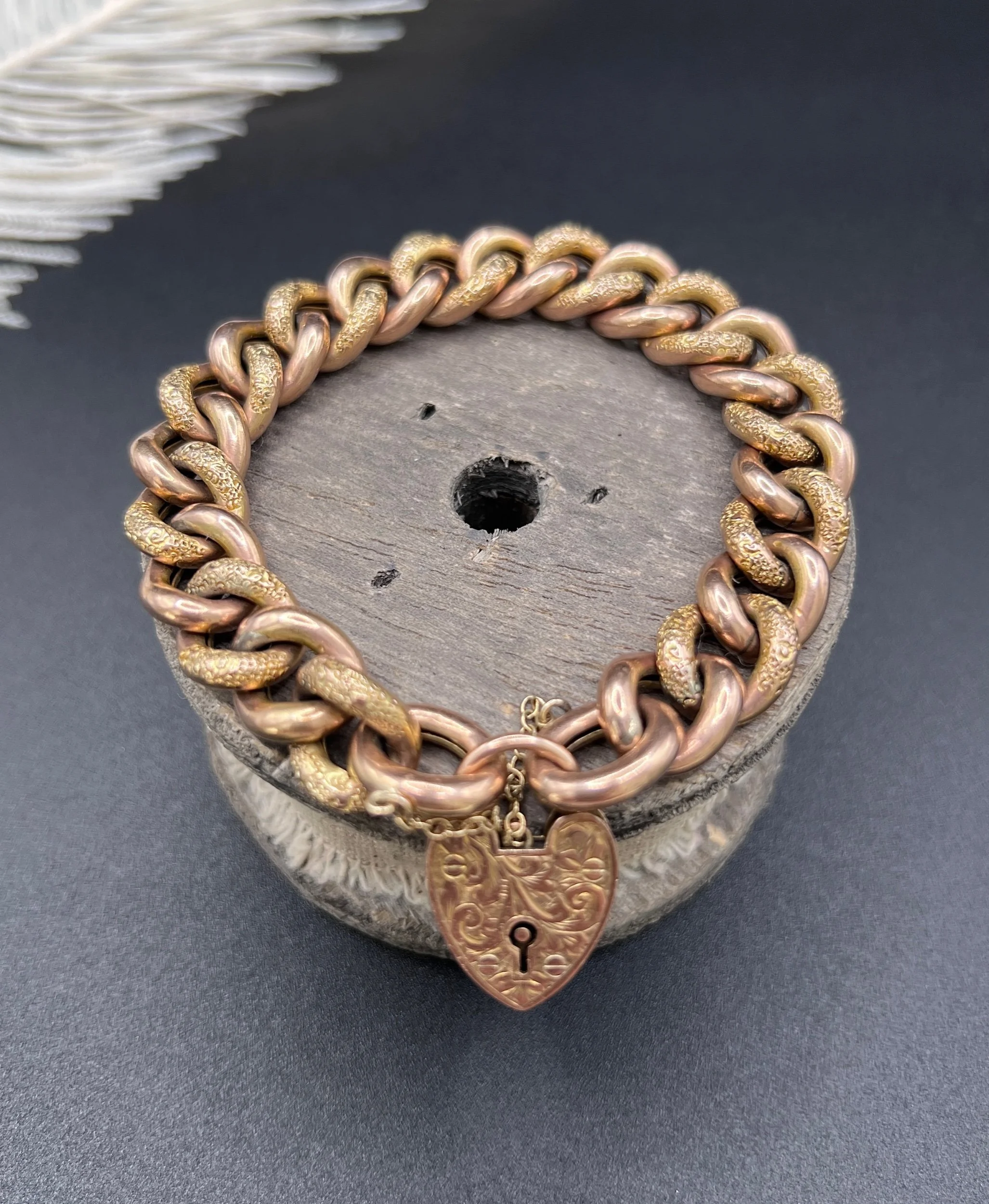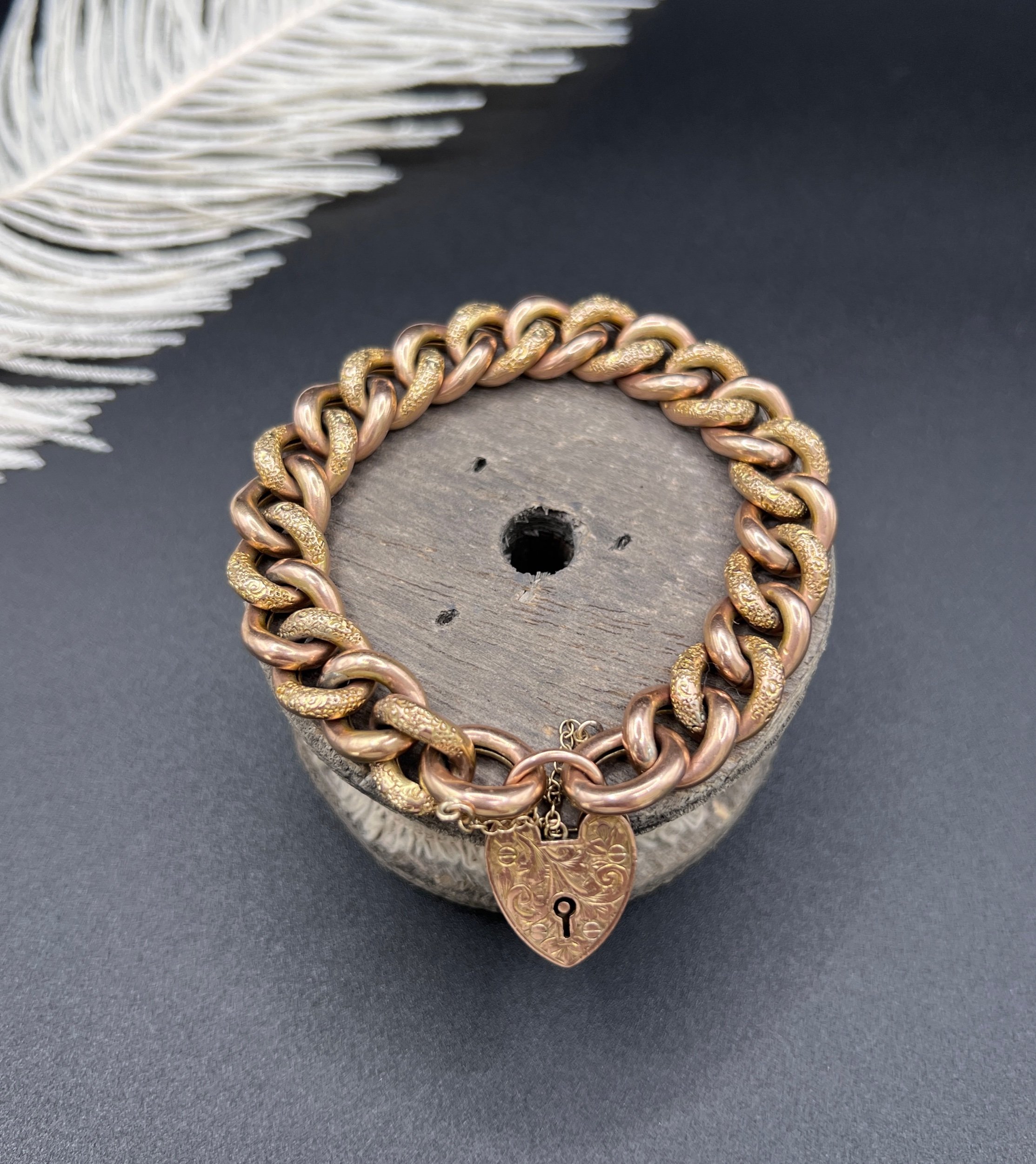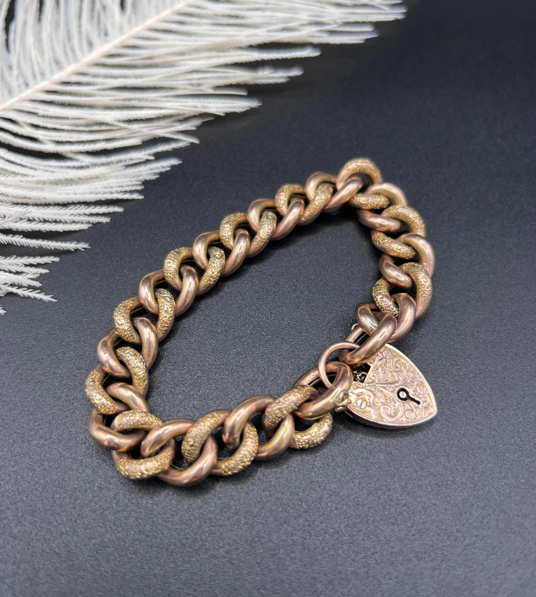 This stunning Victorian curb bracelet radiates beauty and elegance. Crafted from 9ct rose gold, it features a unique "night and day" design, alternating between floral-patterned and plain links. Each link is stamped with a 9ct marking on the reverse side. The heart padlock clasp adds a touch of sophistication, decorated with a paisley pattern and is also stamped with a 9ct marking, and the makers mark DB. This antique jewellery piece is truly a treasure and would make a wonderful addition to any collection.
