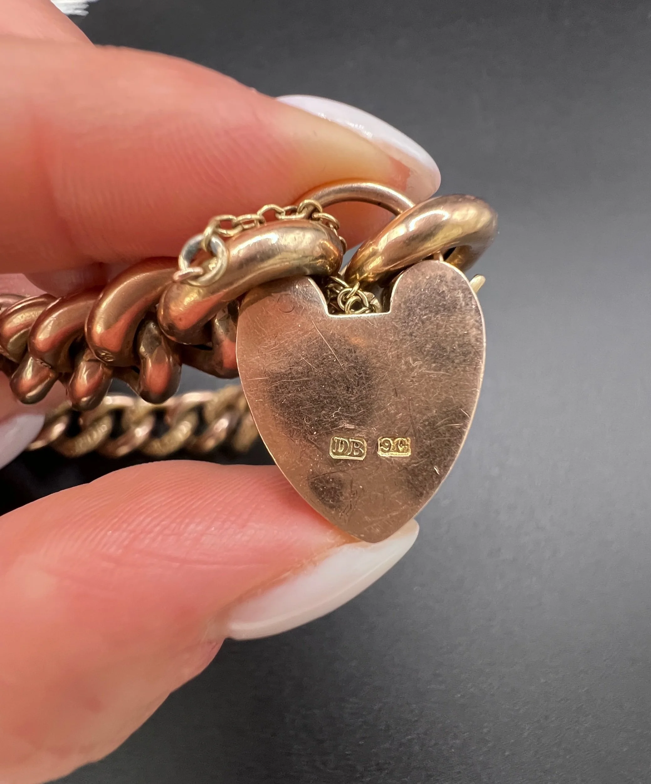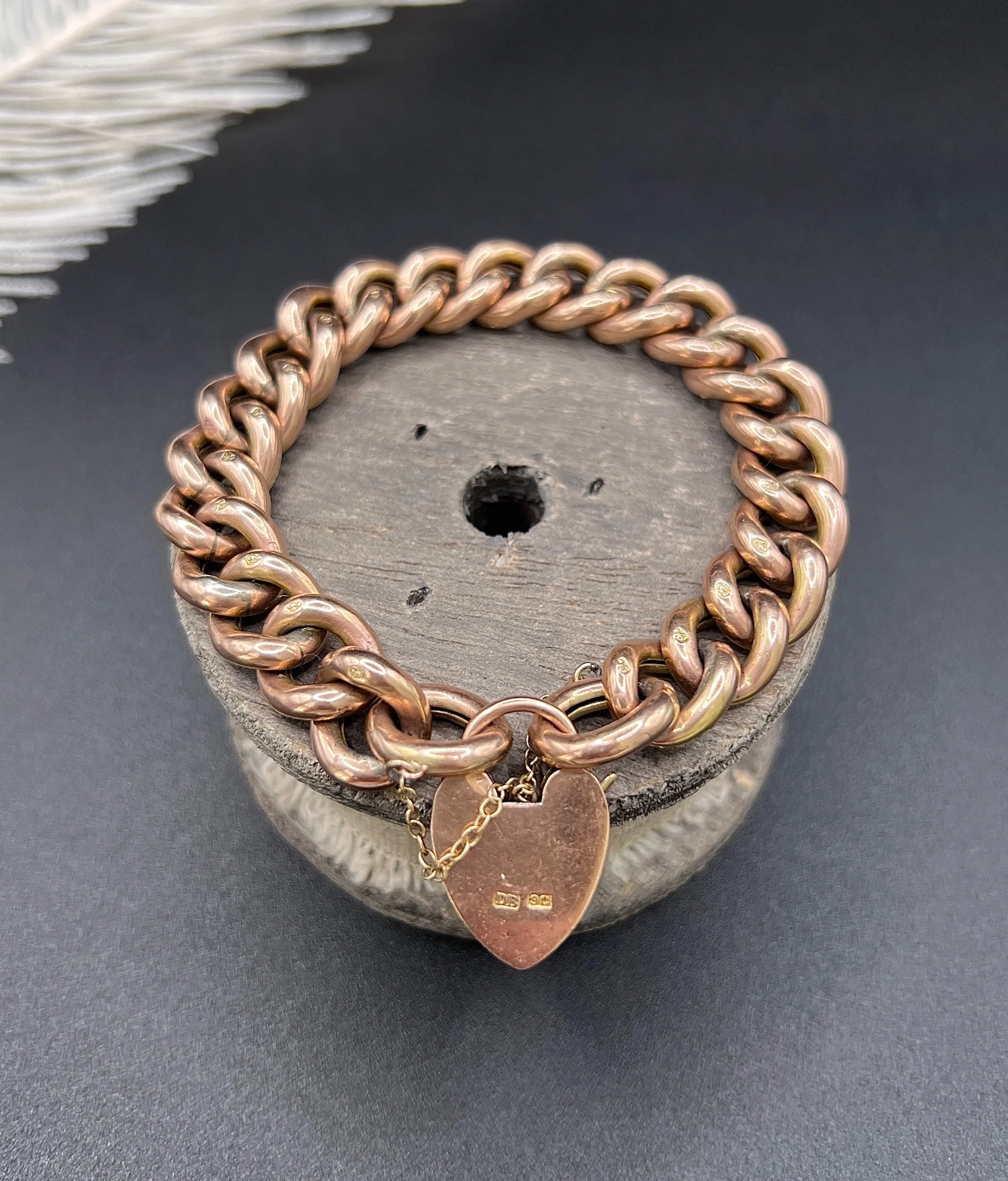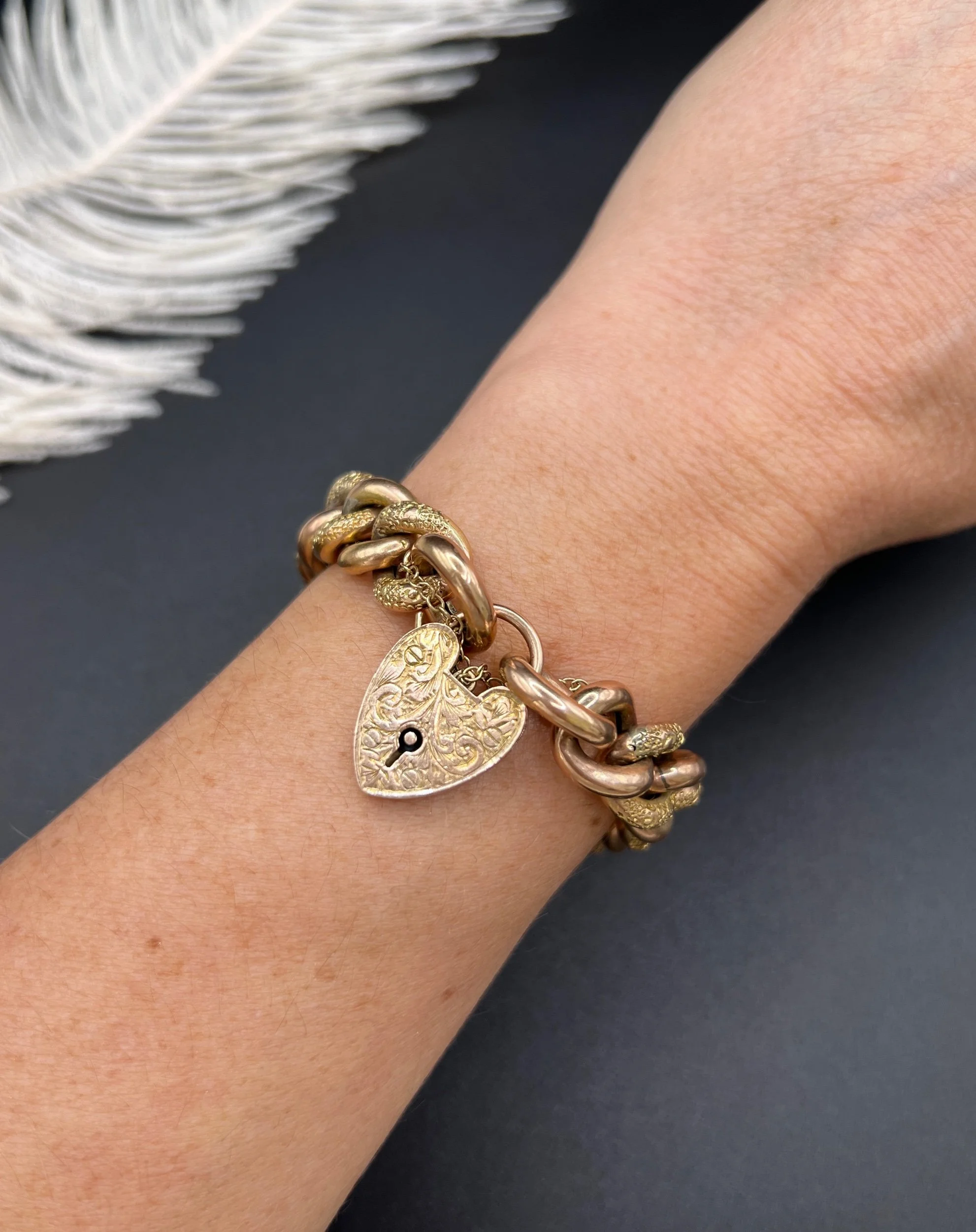 Antique 9ct Rose Gold Curb Bracelet: Victorian Night & Day Heart Padlock
