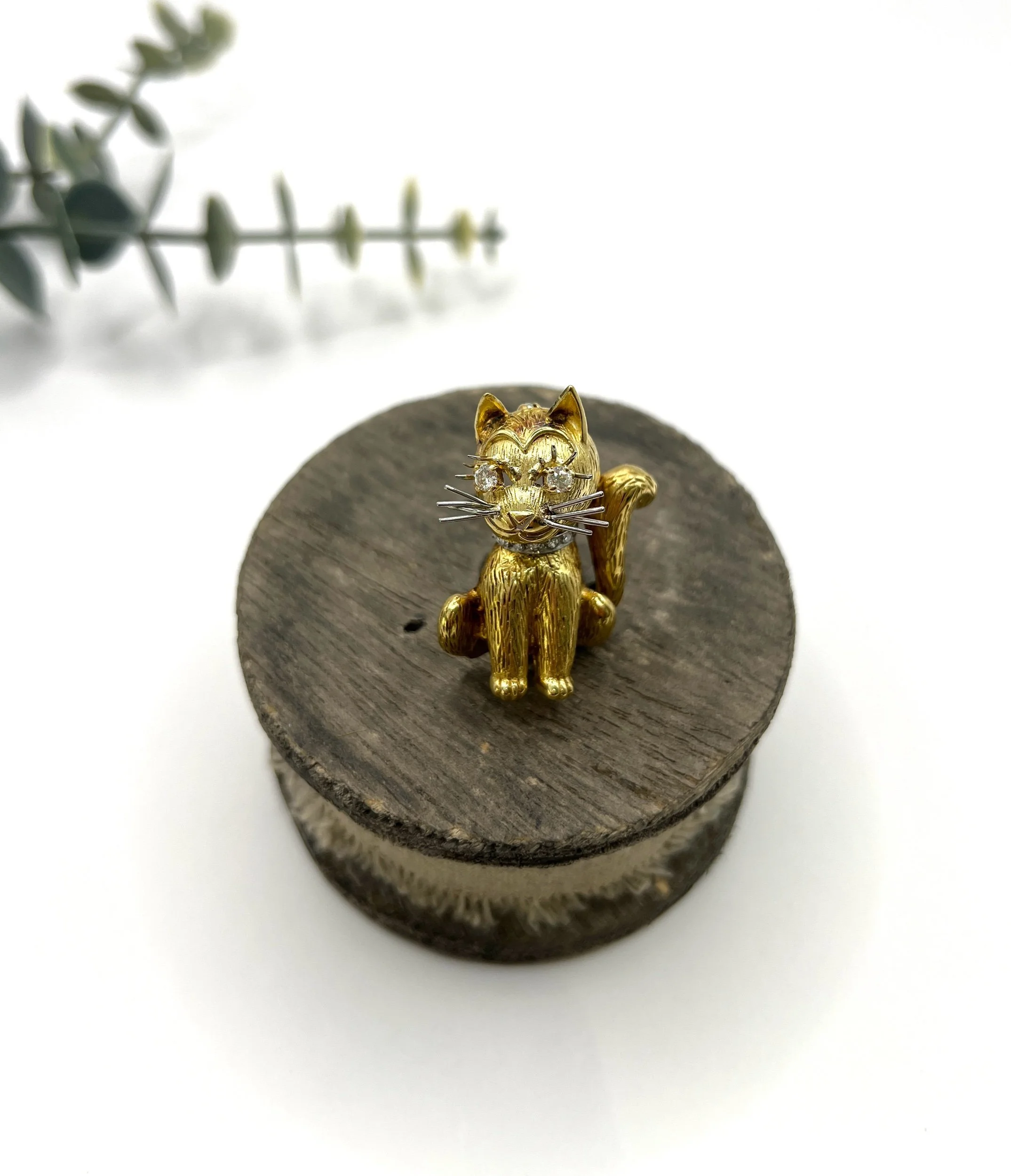 Vintage 18ct Gold, Cat Brooch with Natural Diamond Eyes & Collar, Hallmarked London 1962