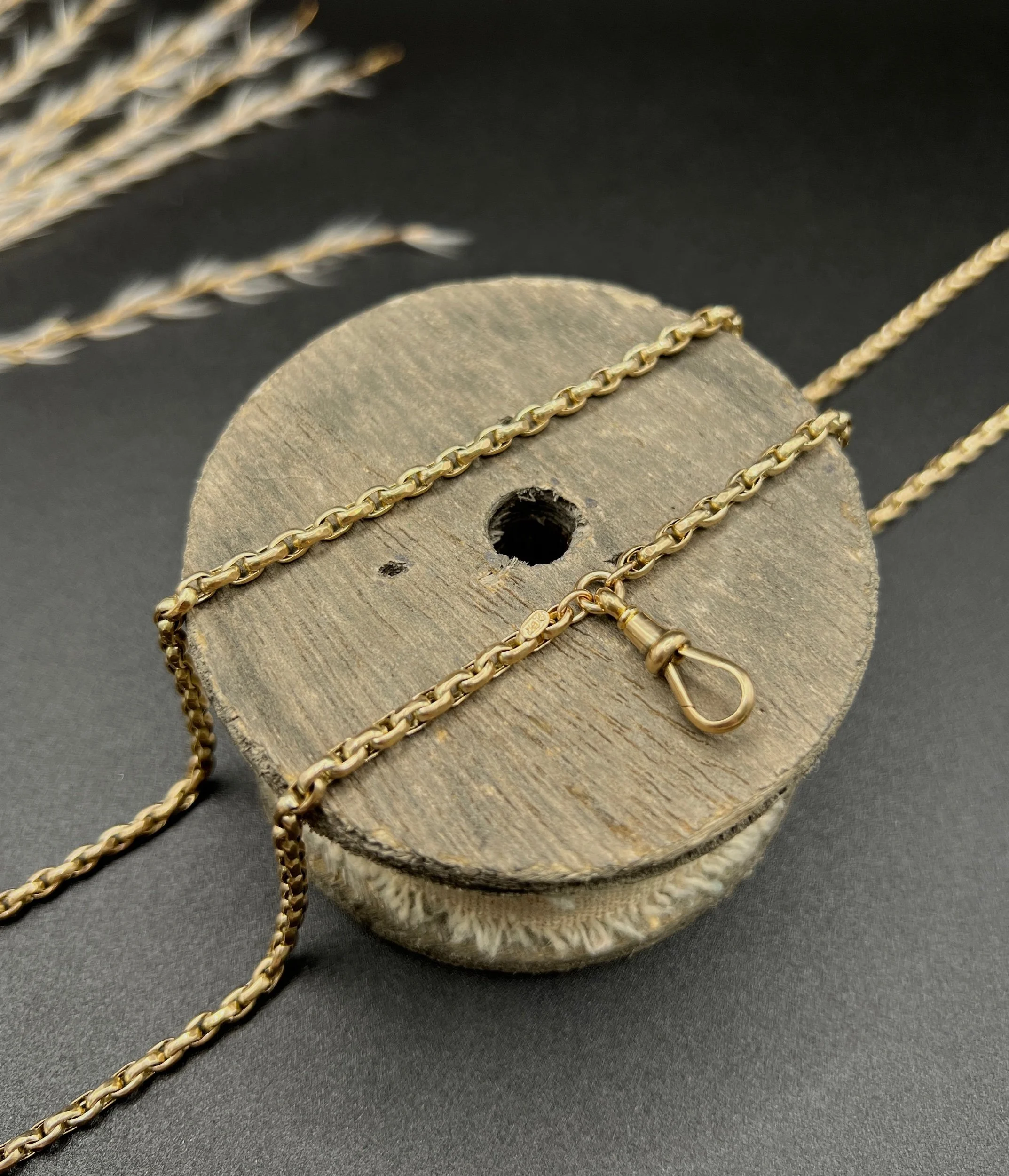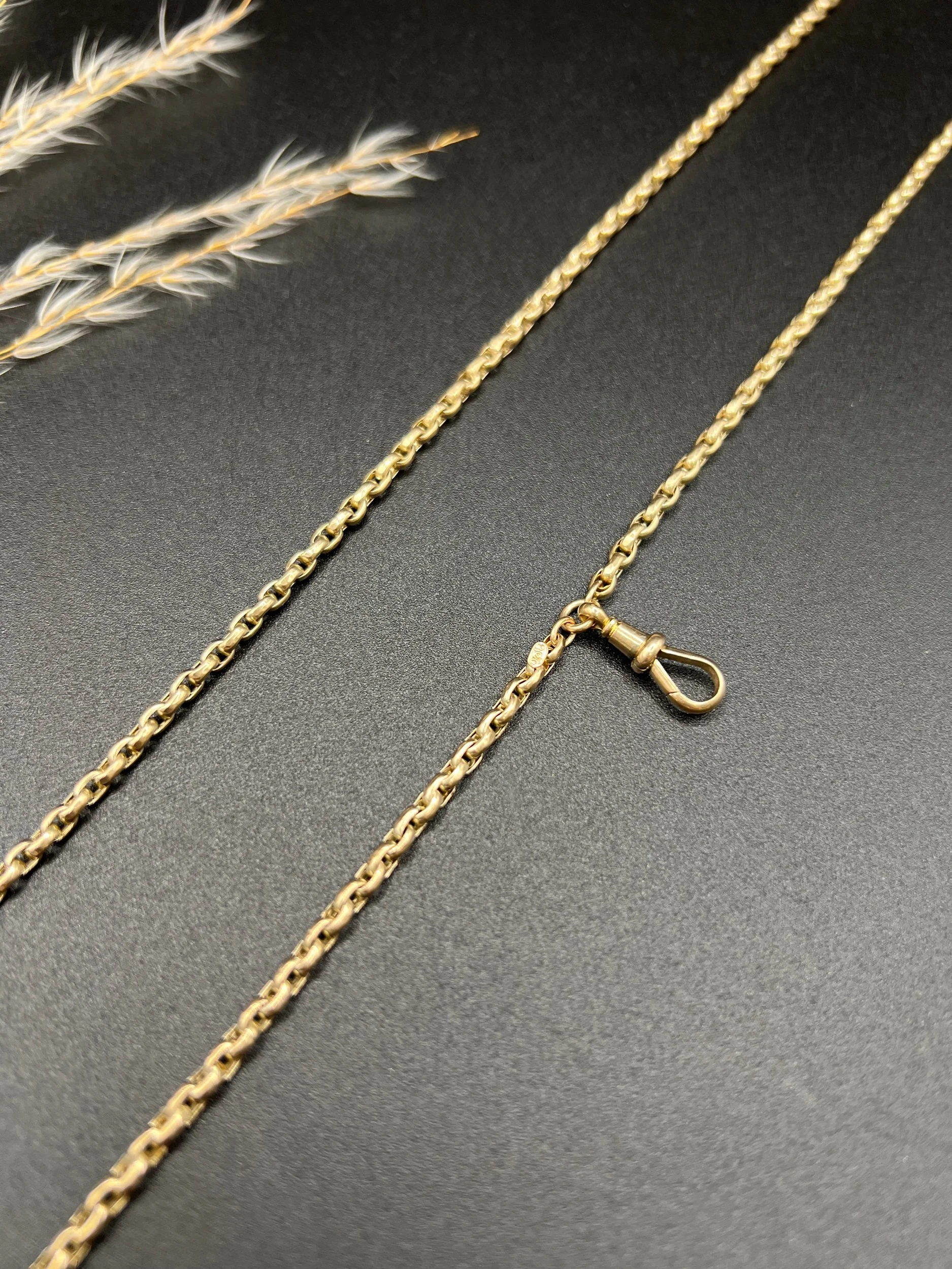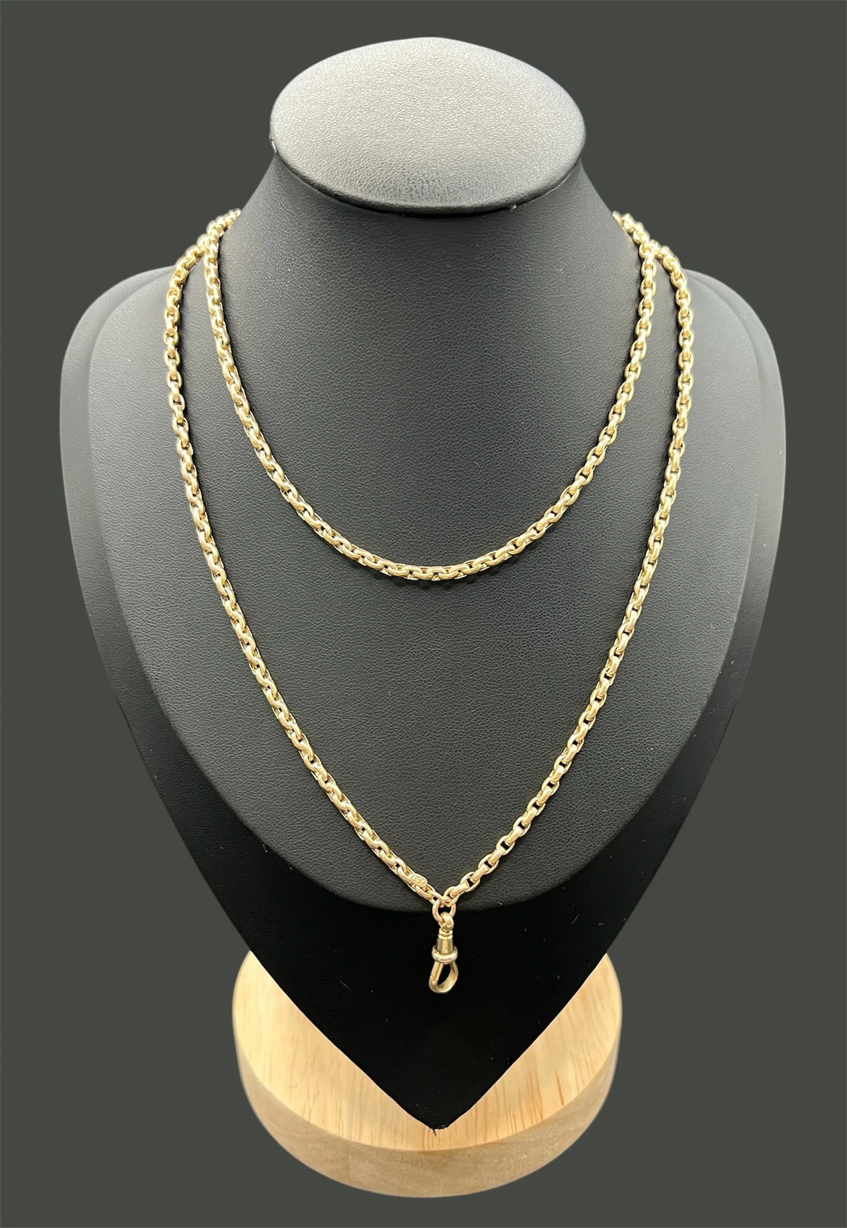 This stunning Edwardian belcher link chain is made of a pale 9ct rose gold and dates back to the early 1900s. The beauty of this piece lies in its simplicity, with each link featuring a beautiful faceted surface that catches the light beautifully. The chain measures a total length of 29 1/2 Inches and is finished with a swivel dog clip, perfect for attaching fobs, charms or pendants. This antique belcher chain is a timeless piece of jewellery that will never go out of style.