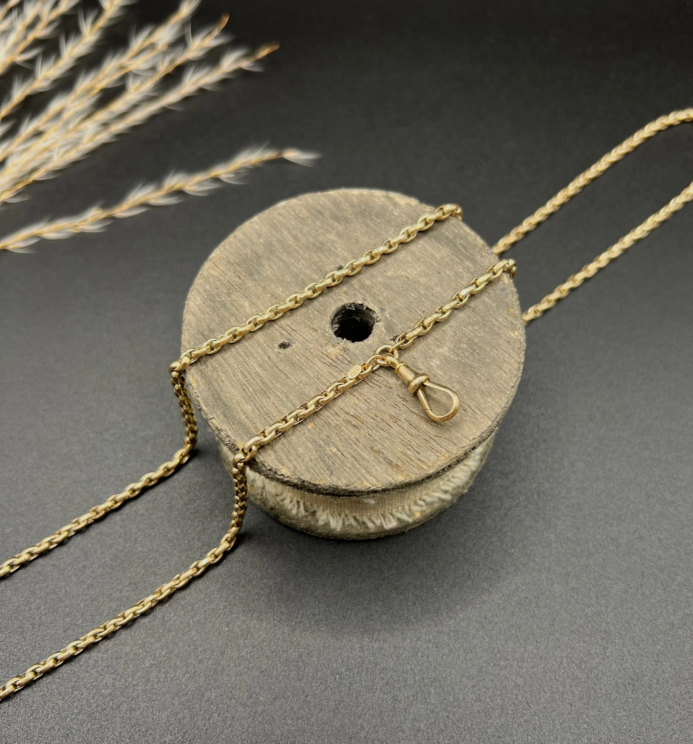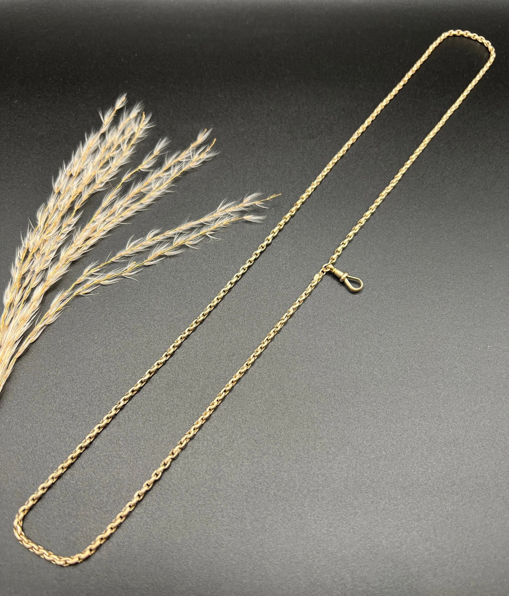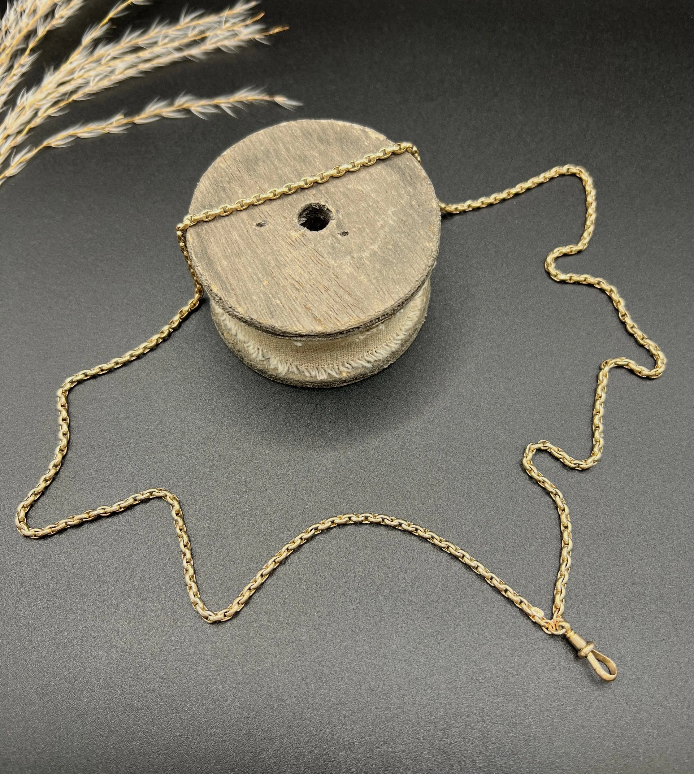 This stunning Edwardian belcher link chain is made of a pale 9ct rose gold and dates back to the early 1900s. The beauty of this piece lies in its simplicity, with each link featuring a beautiful faceted surface that catches the light beautifully. The chain measures a total length of 29 1/2 Inches and is finished with a swivel dog clip, perfect for attaching fobs, charms or pendants. This antique belcher chain is a timeless piece of jewellery that will never go out of style.