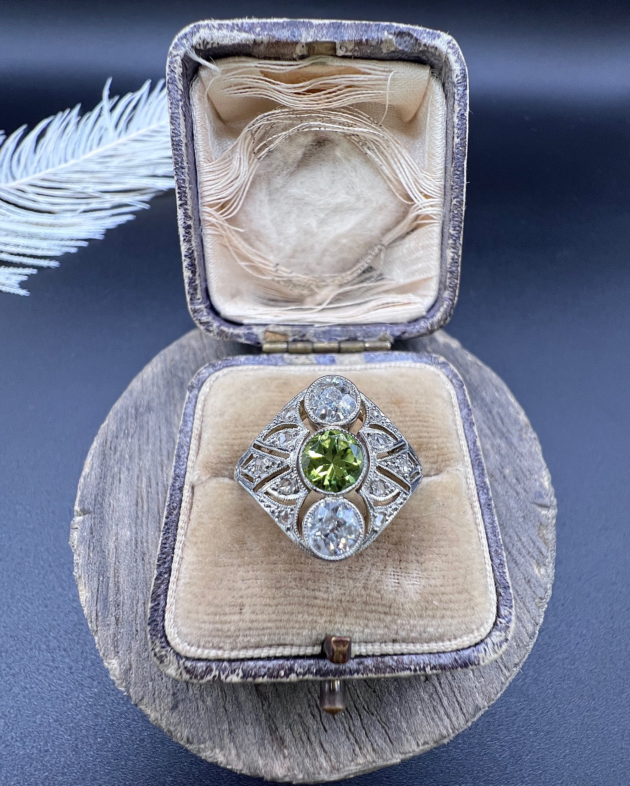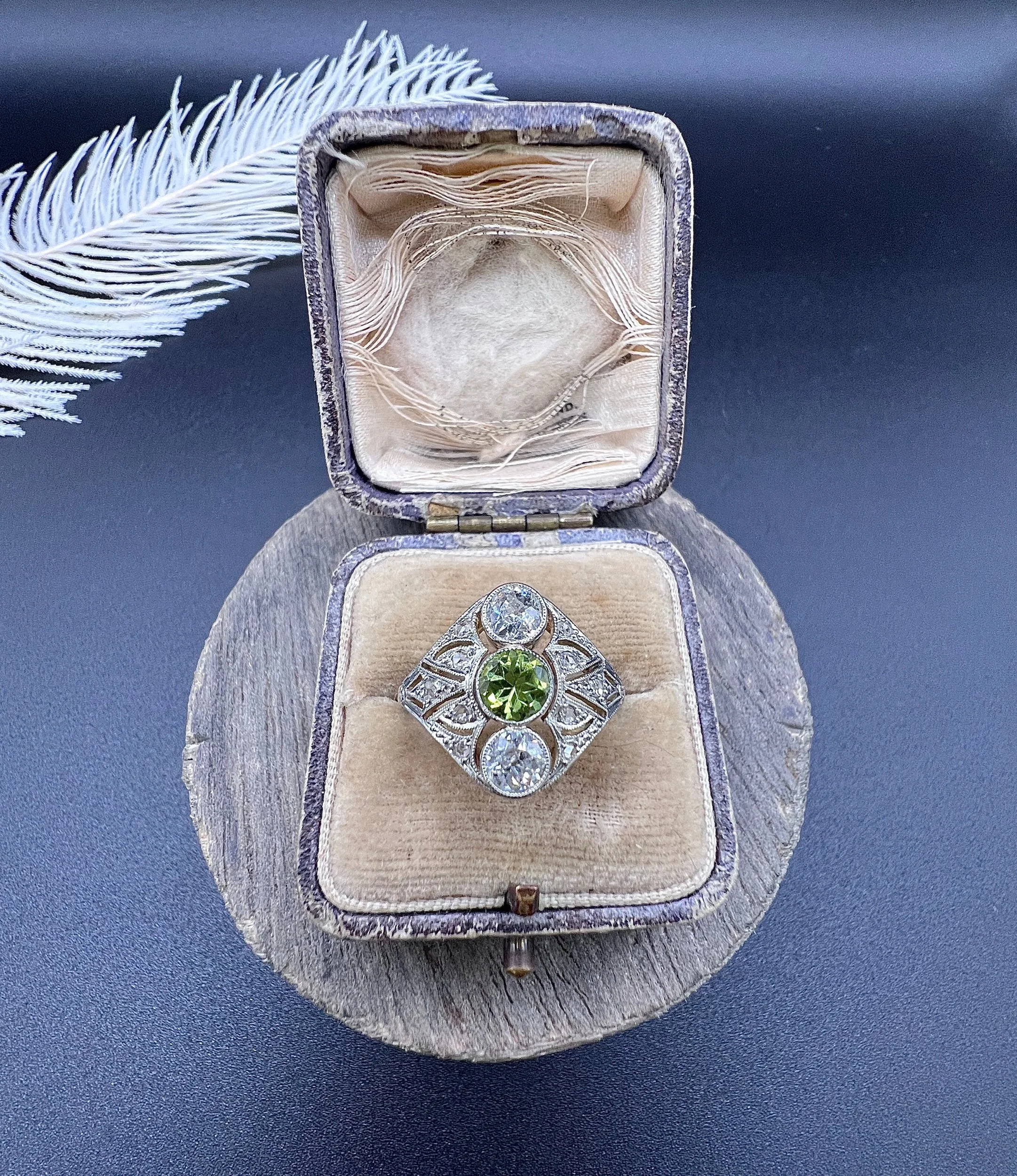 Introducing an exquisite 18ct yellow gold and platinum Edwardian-era ring, a stunning example of vintage elegance. This ring features a slightly domed, openwork design that showcases a vibrant centre peridot, beautifully nestled between two sparkling natural diamonds, creating an enchanting trilogy effect.