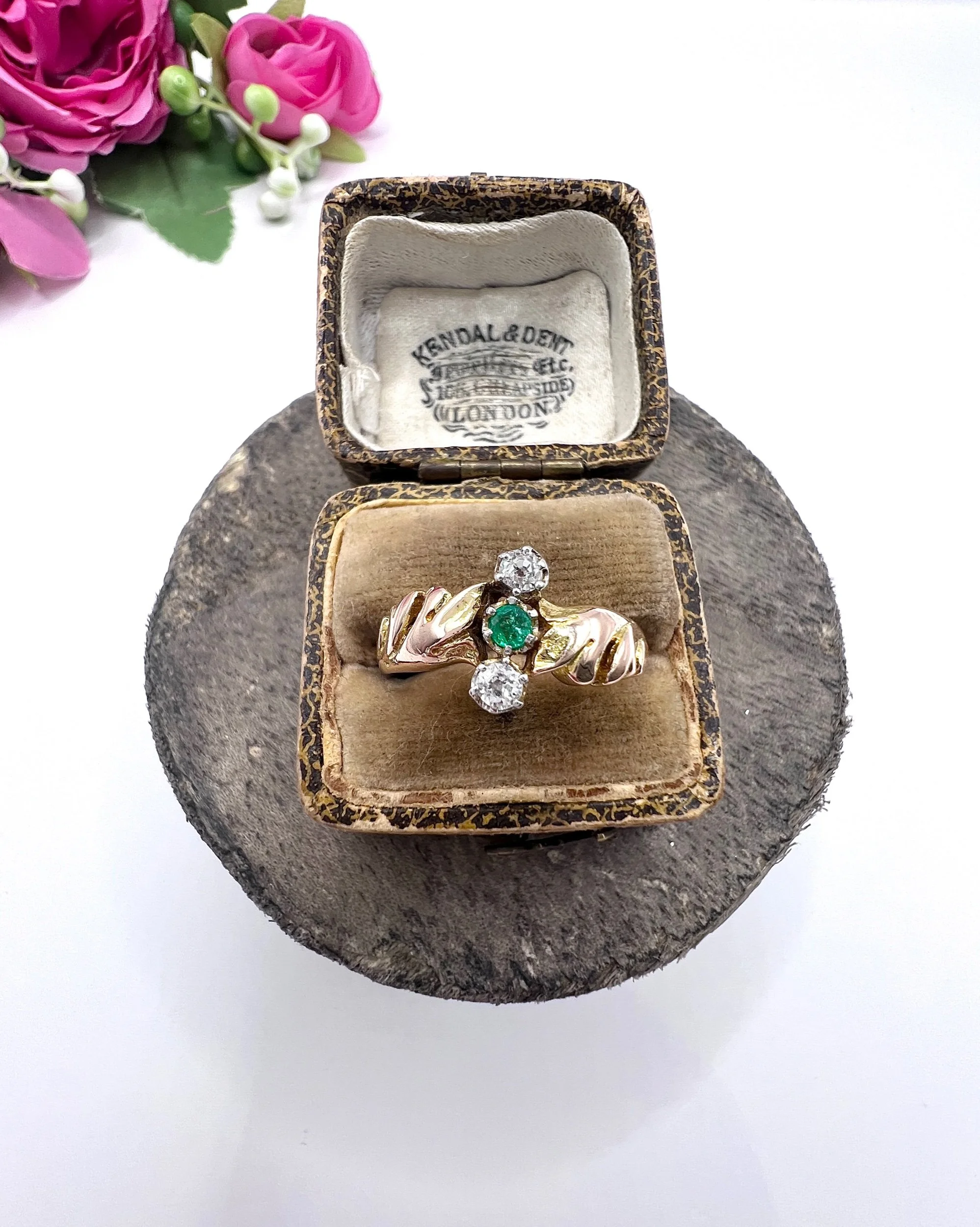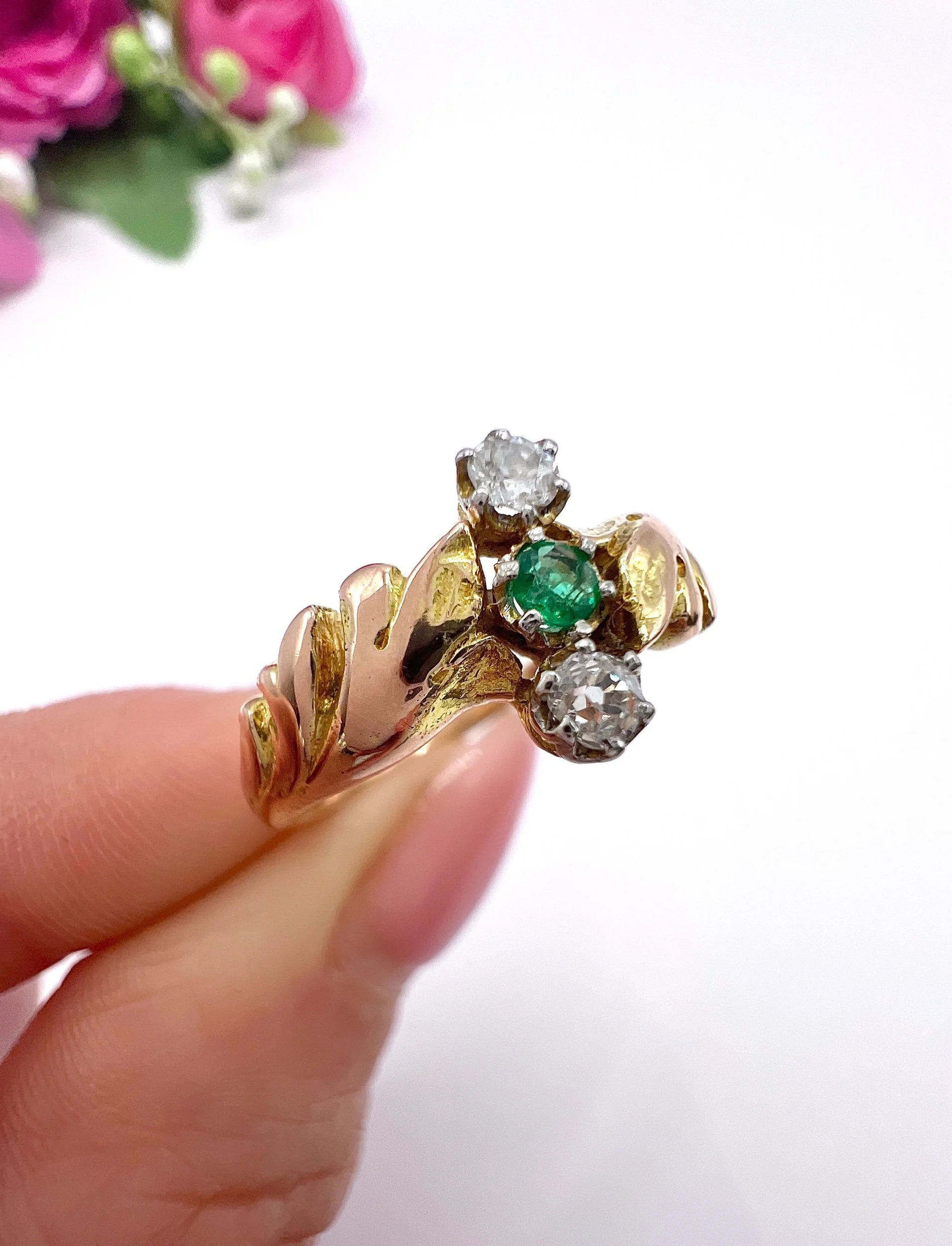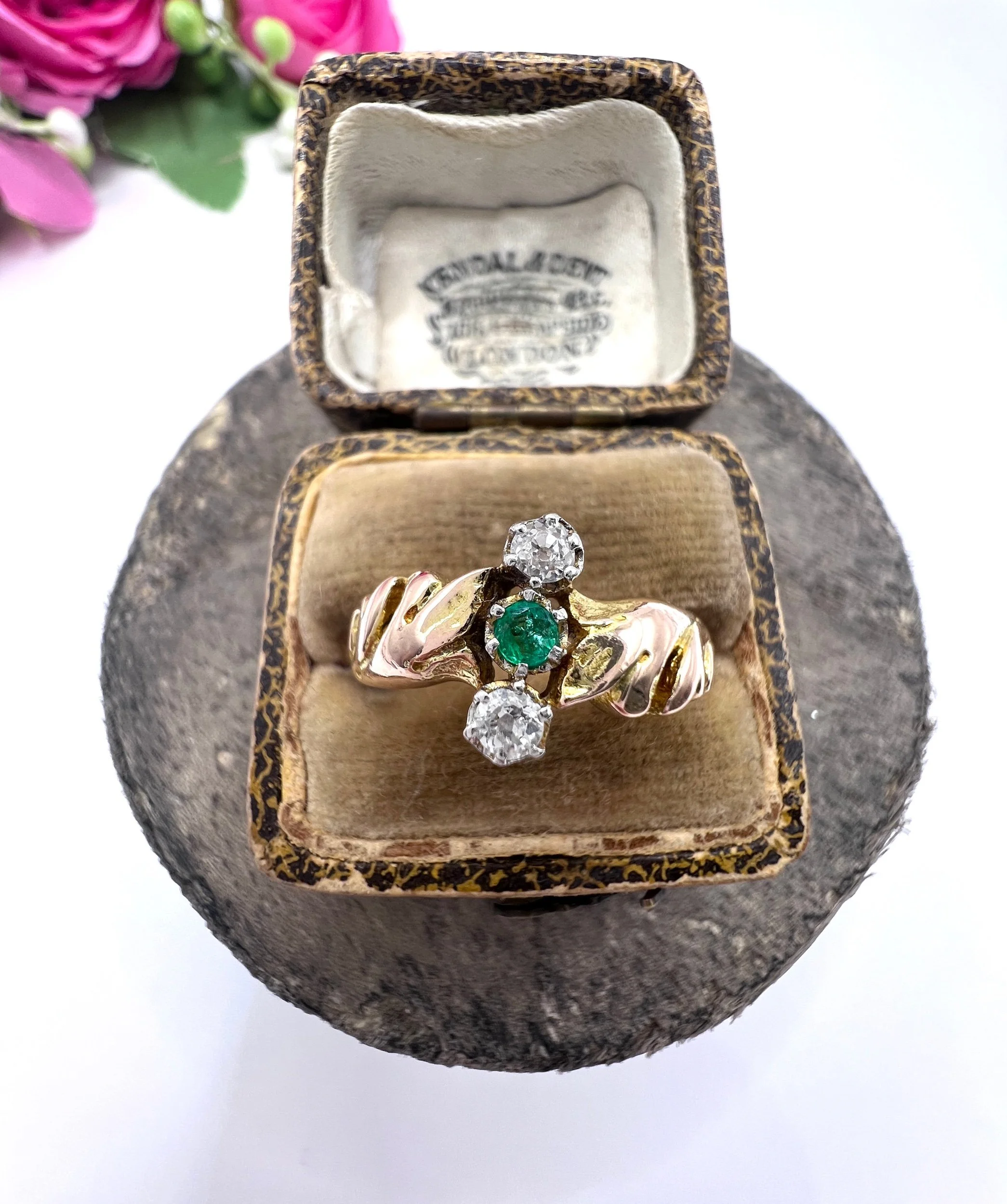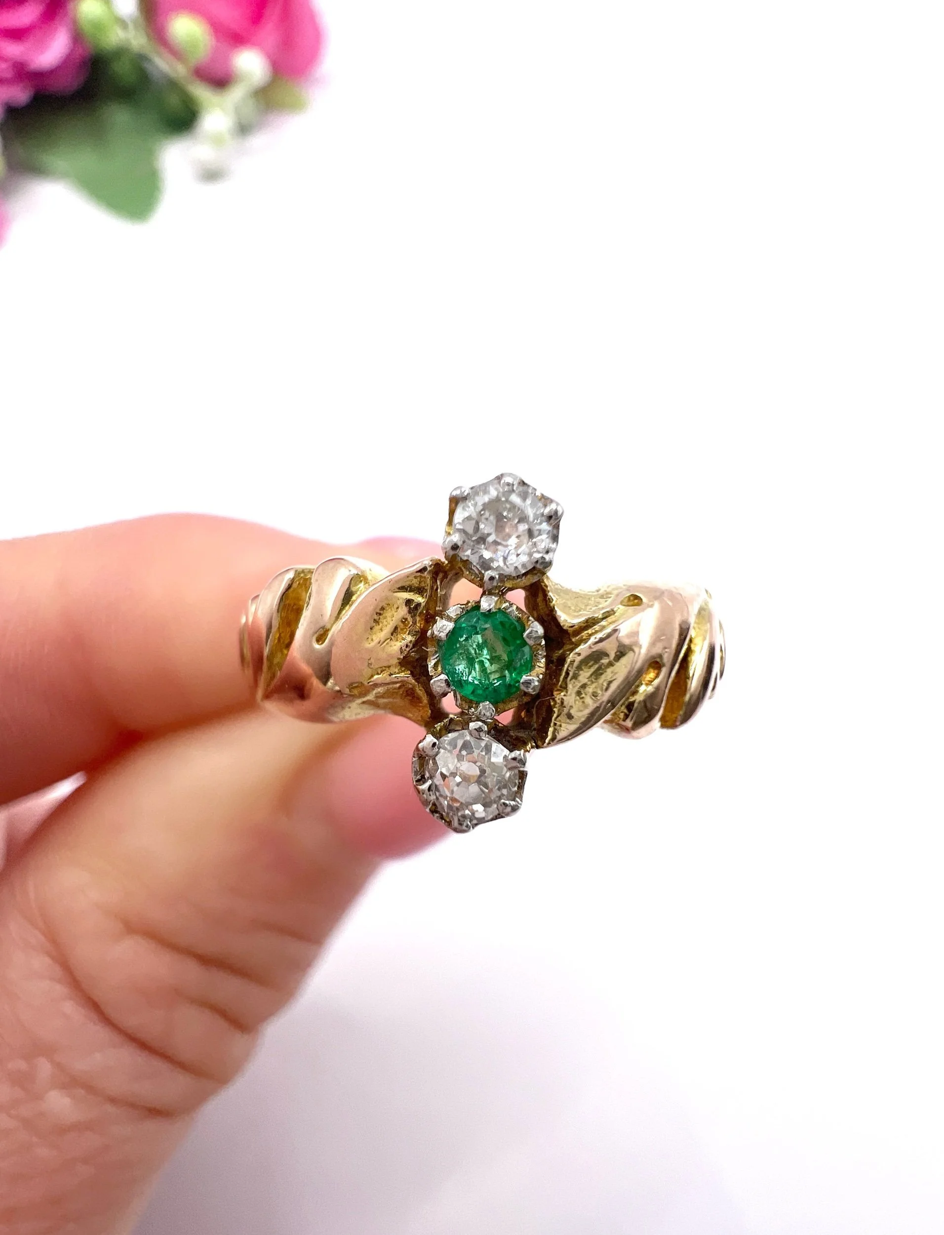 Antique 18ct Gold, Art Nouveau Three Stone Emerald & Diamond Ring