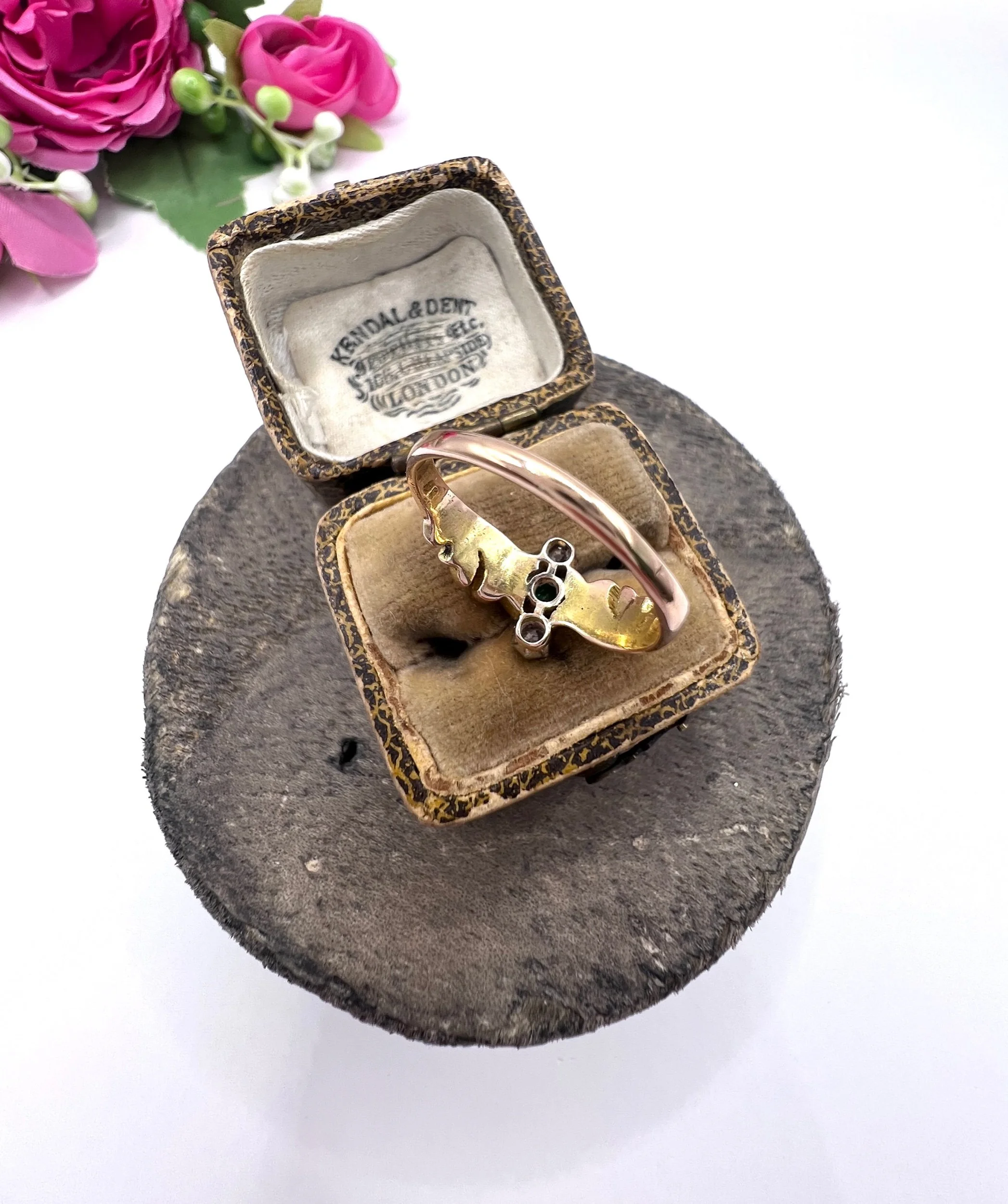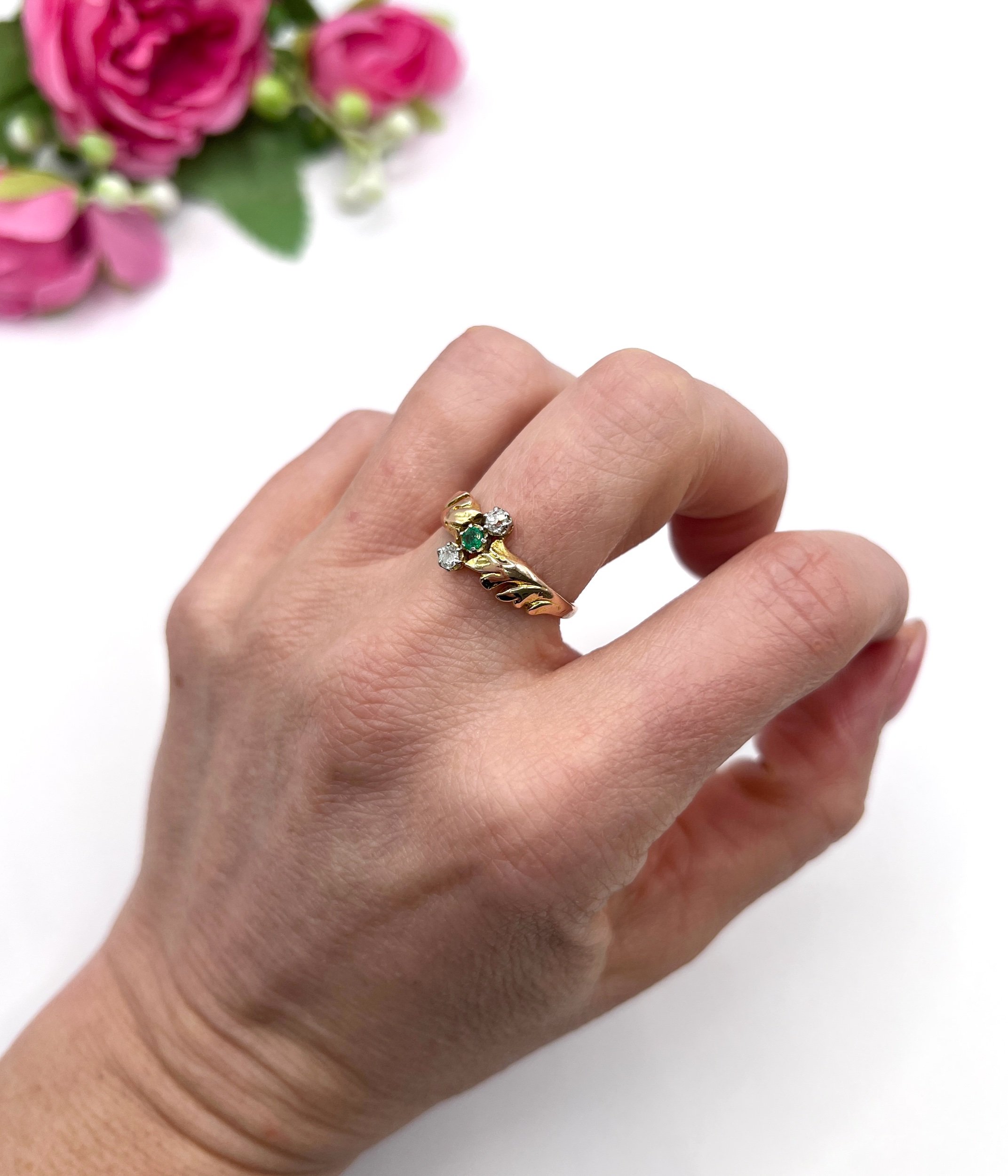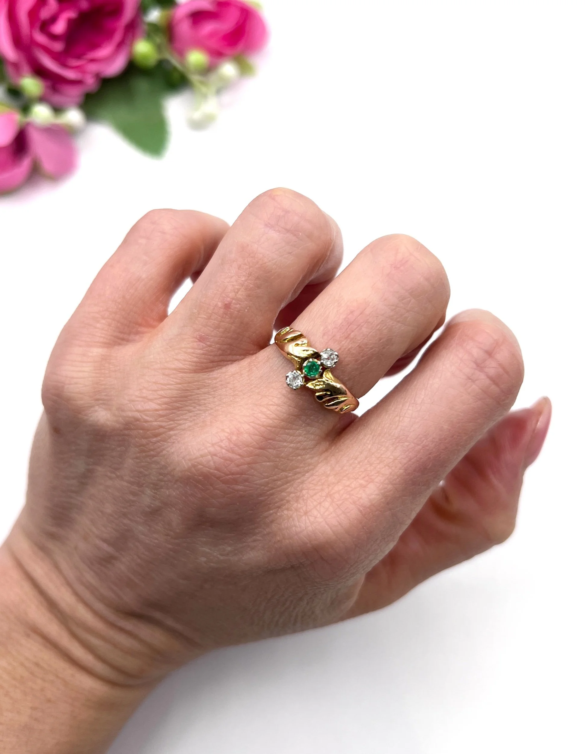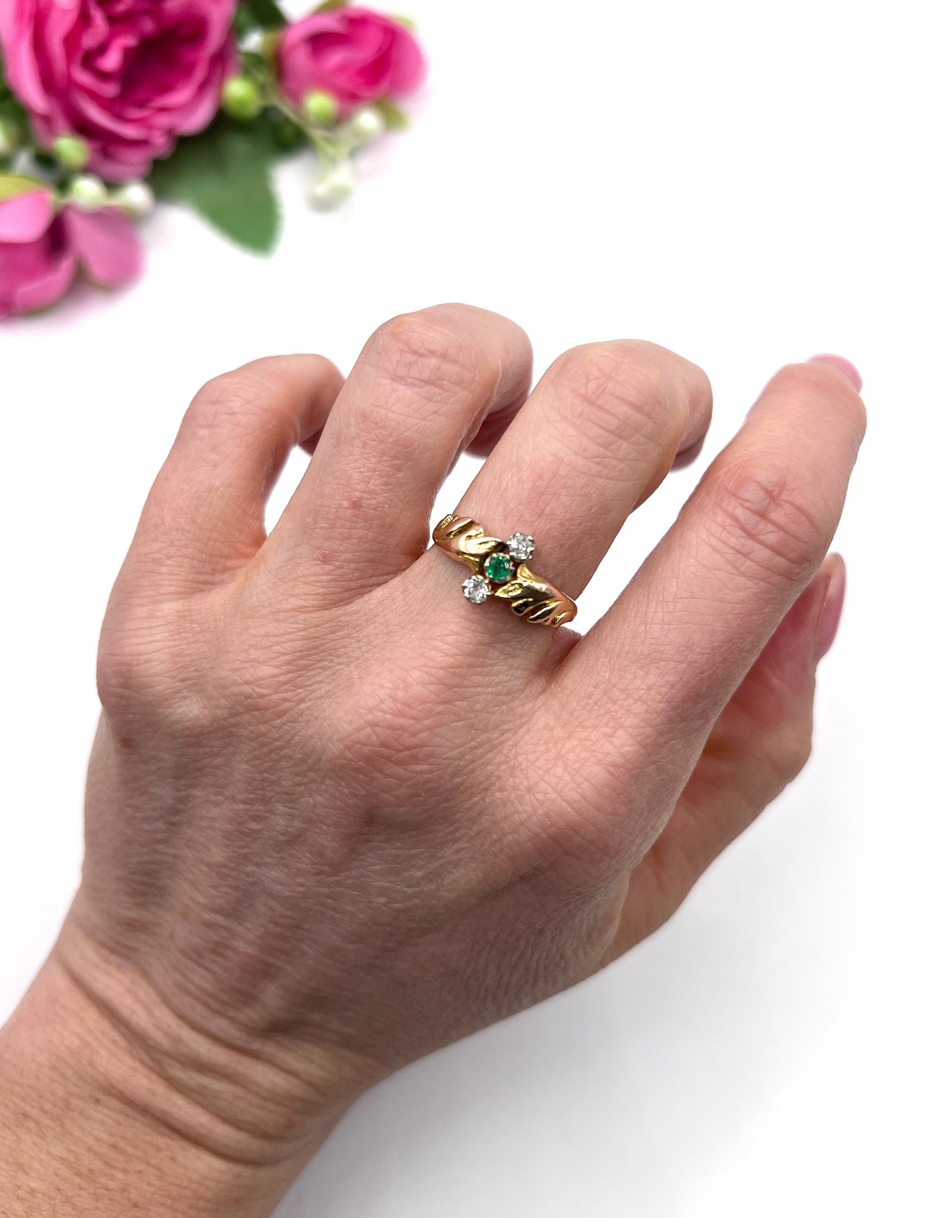 Antique 18ct Gold, Art Nouveau Three Stone Emerald & Diamond Ring