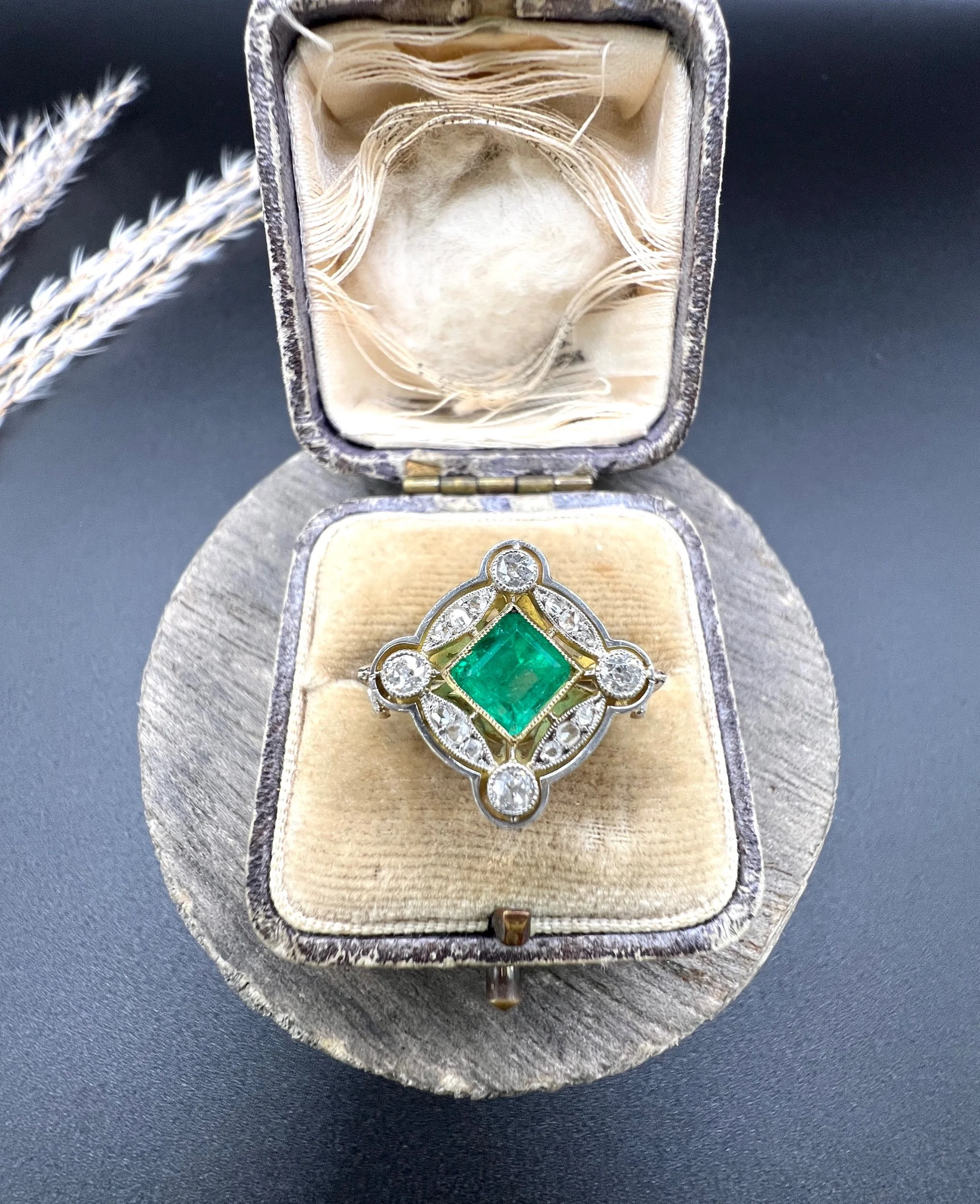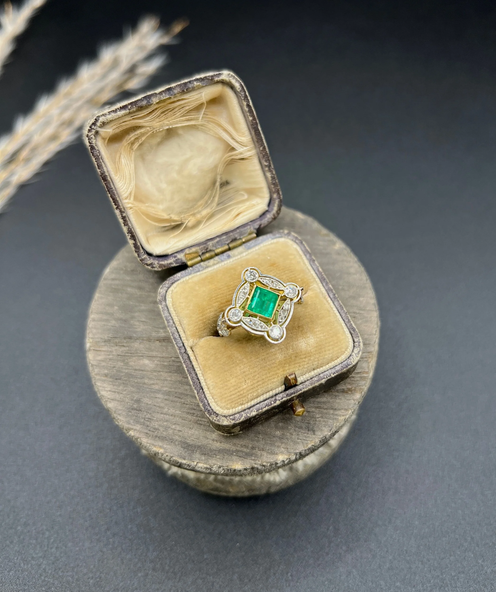 Antique 18ct Yellow Gold & Platinum, Edwardian era Emerald and Diamond Halo Ring