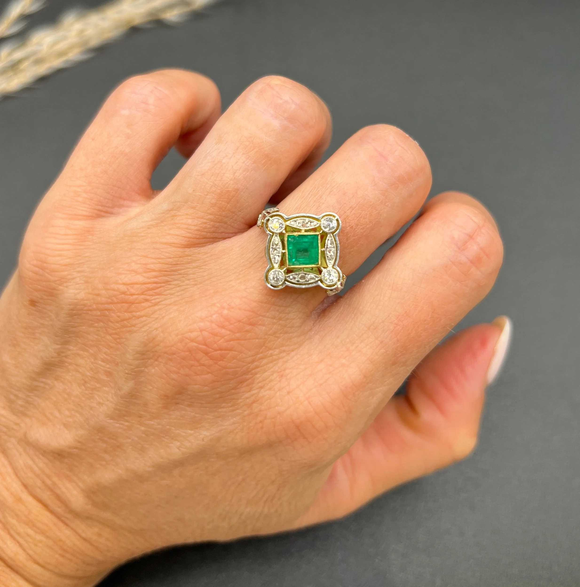 Step into the elegance of the Edwardian era with this exquisite 18ct gold ring. At its heart lies a stunning square-cut natural emerald, radiating a deep, rich green hue that captures the essence of timeless beauty. This captivating gemstone is elegantly framed by an open-work design, showcasing intricate detailing that adds a touch of sophistication.