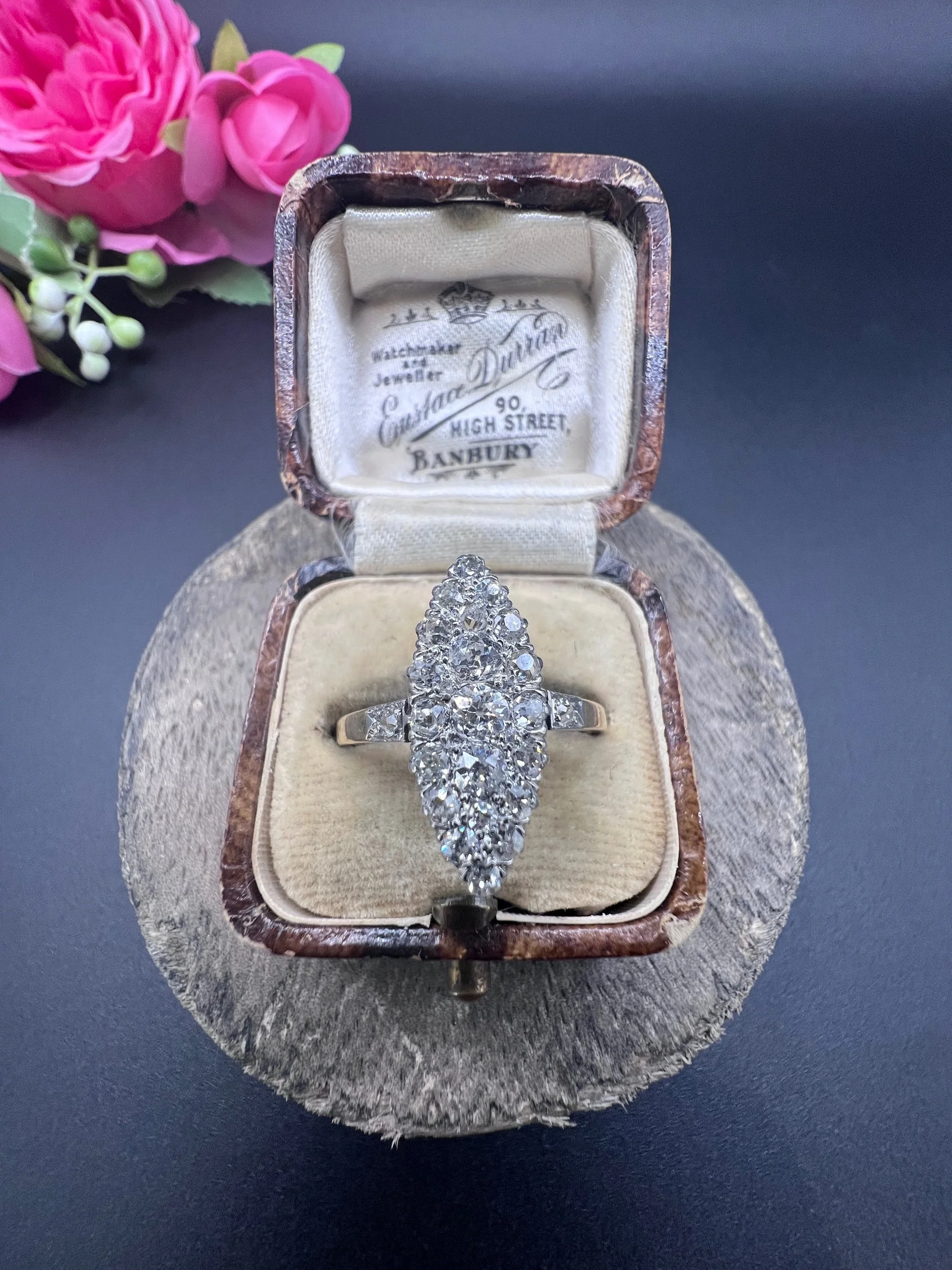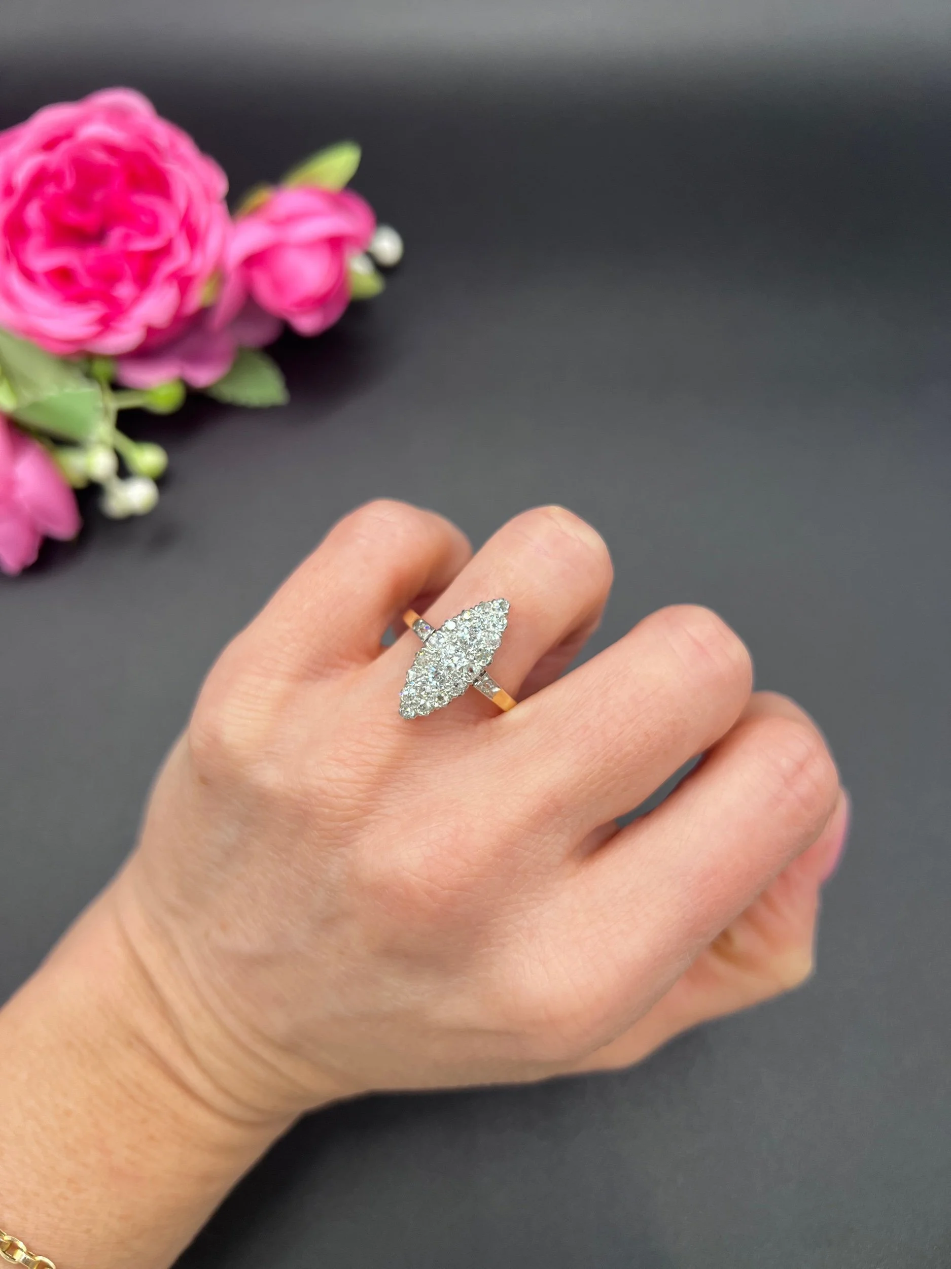 Step into elegance with this stunning Edwardian ring, featuring a captivating marquise-shaped cluster of Old Brilliant cut diamonds meticulously set in a classic claw setting. The estimated total diamond weight is approximately 0.90 carats, showcasing the exquisite brilliance and timeless beauty of these vintage gems.