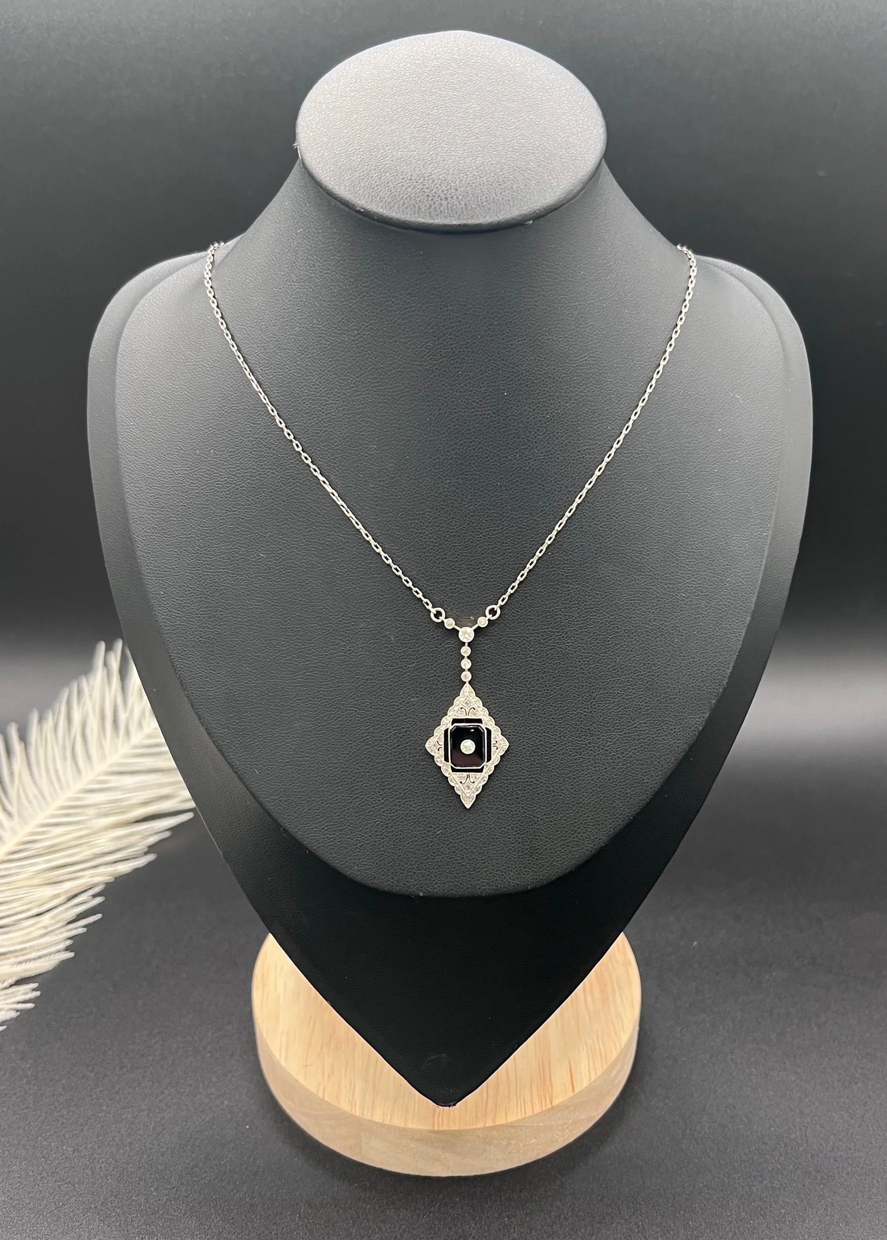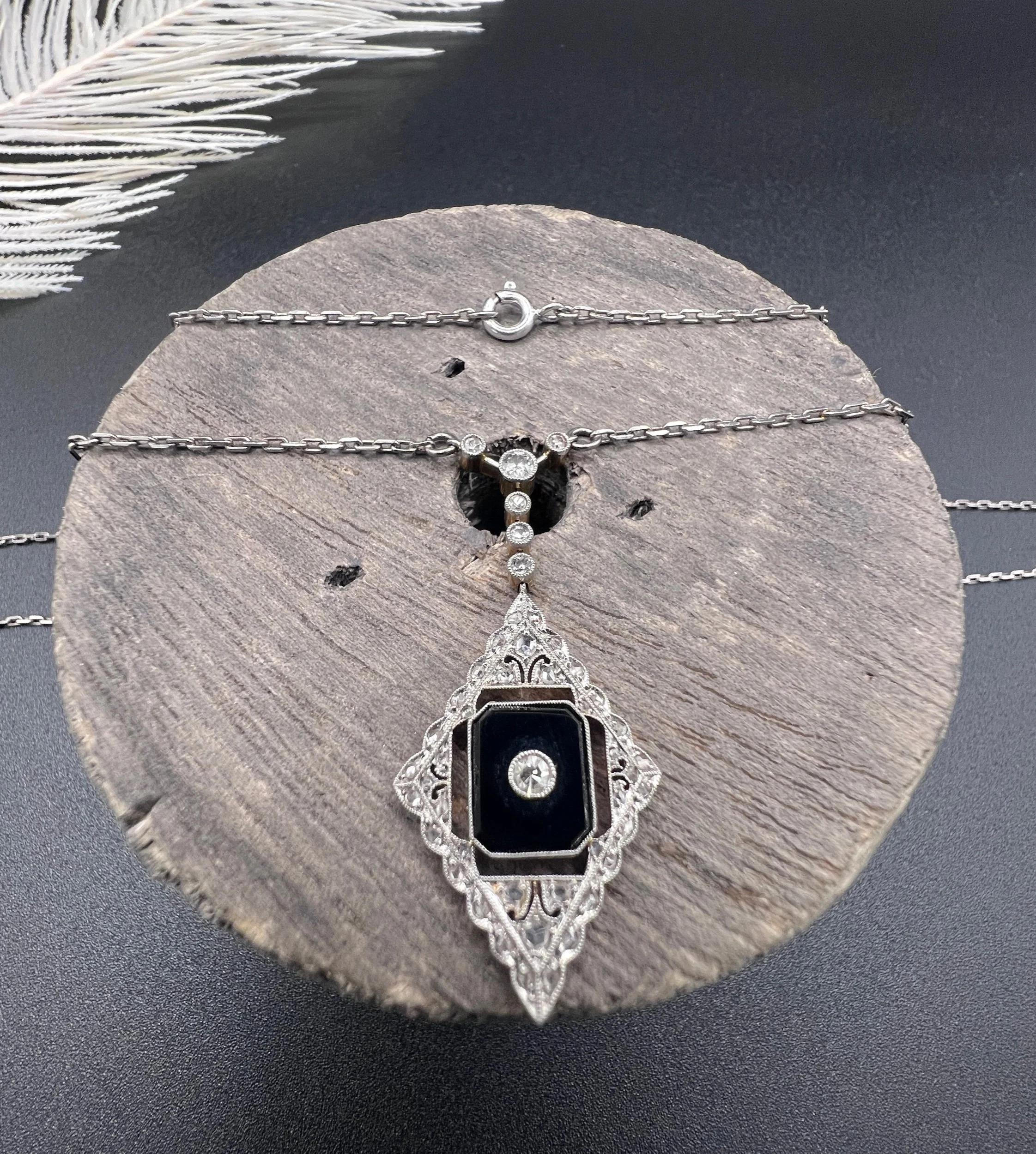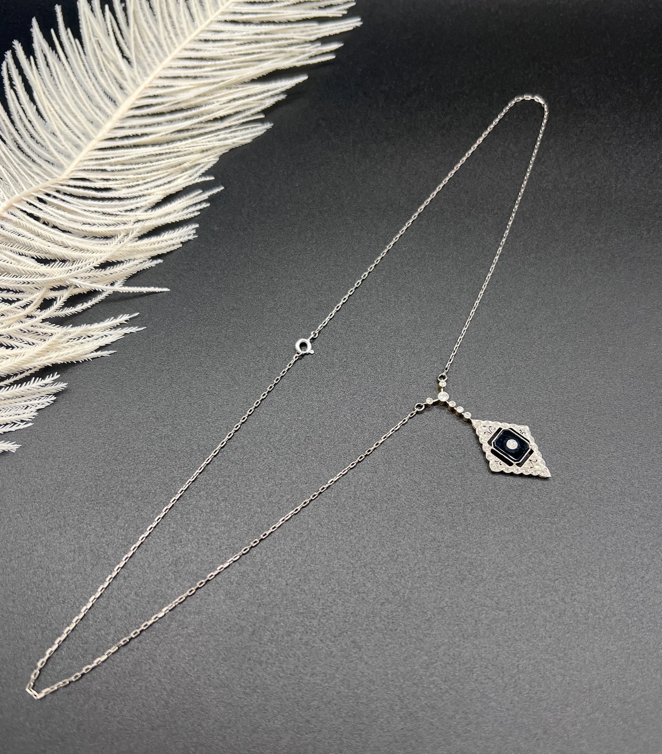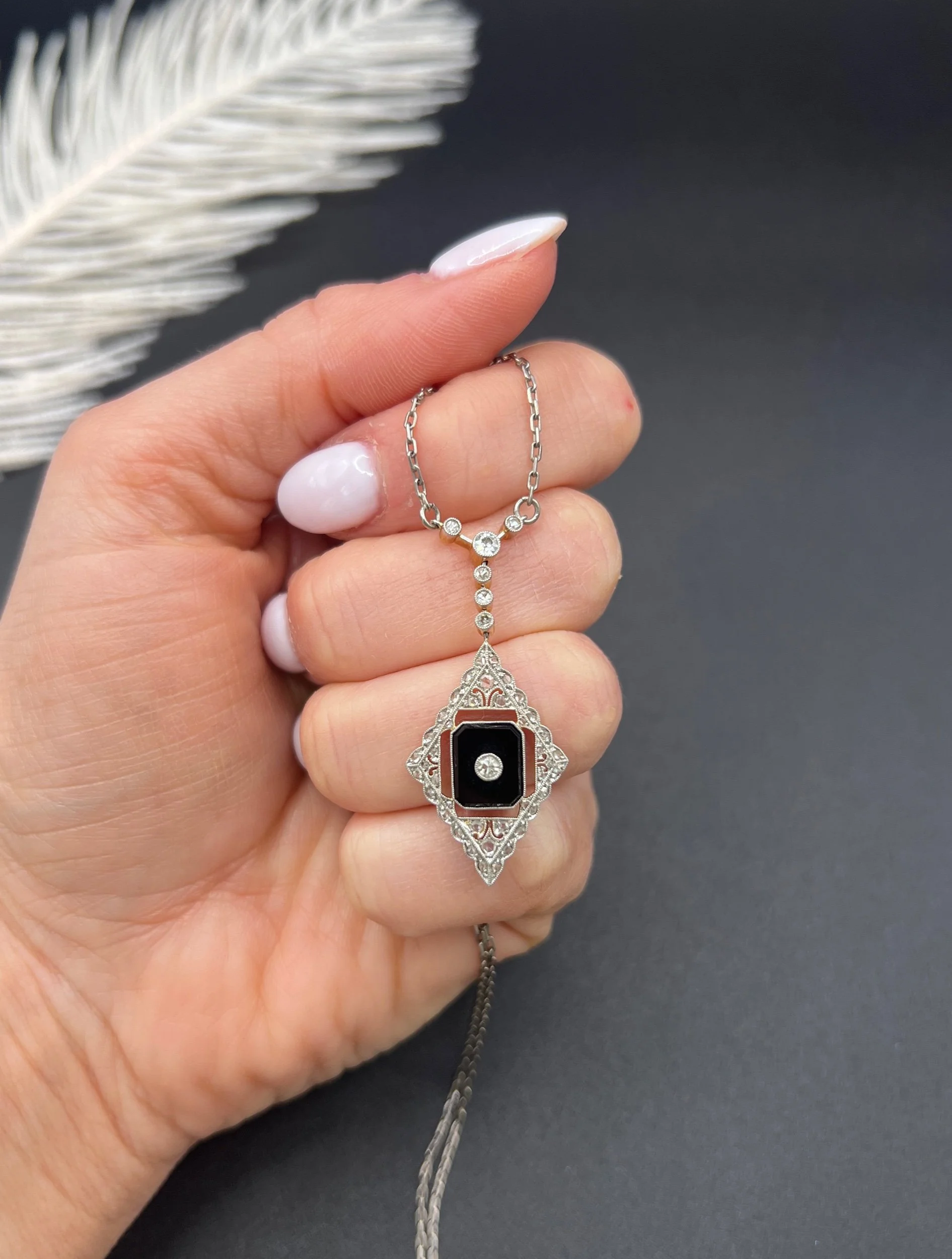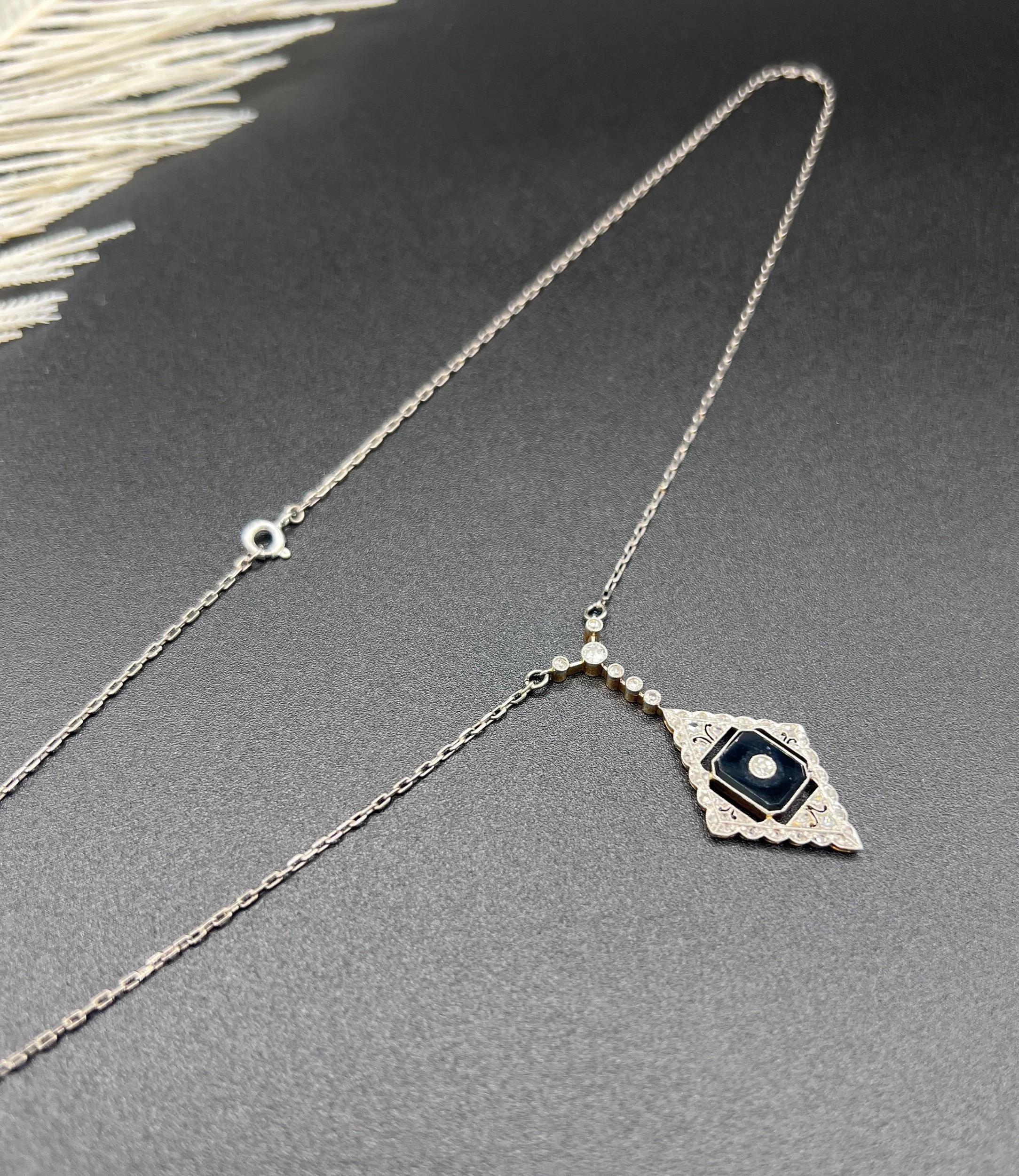 The pendant features a striking geometric composition, centered around a polished onyx panel that provides a rich, inky contrast to the brilliance of the natural diamonds. At its heart, a delicate diamond is set within the onyx, drawing the eye and adding a subtle sparkle. Above, a graceful line of old-cut diamonds connects the pendant to the chain, enhancing its sense of movement and fluidity.