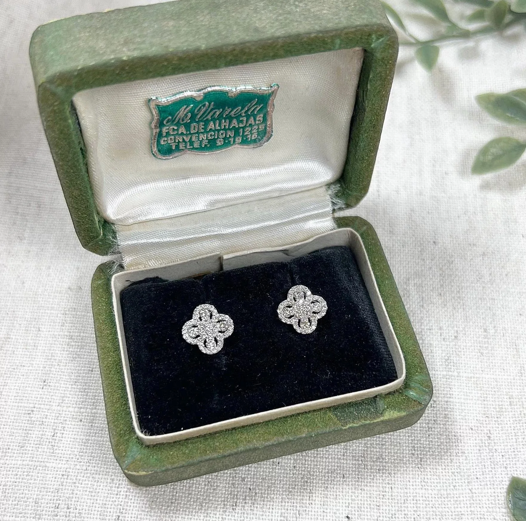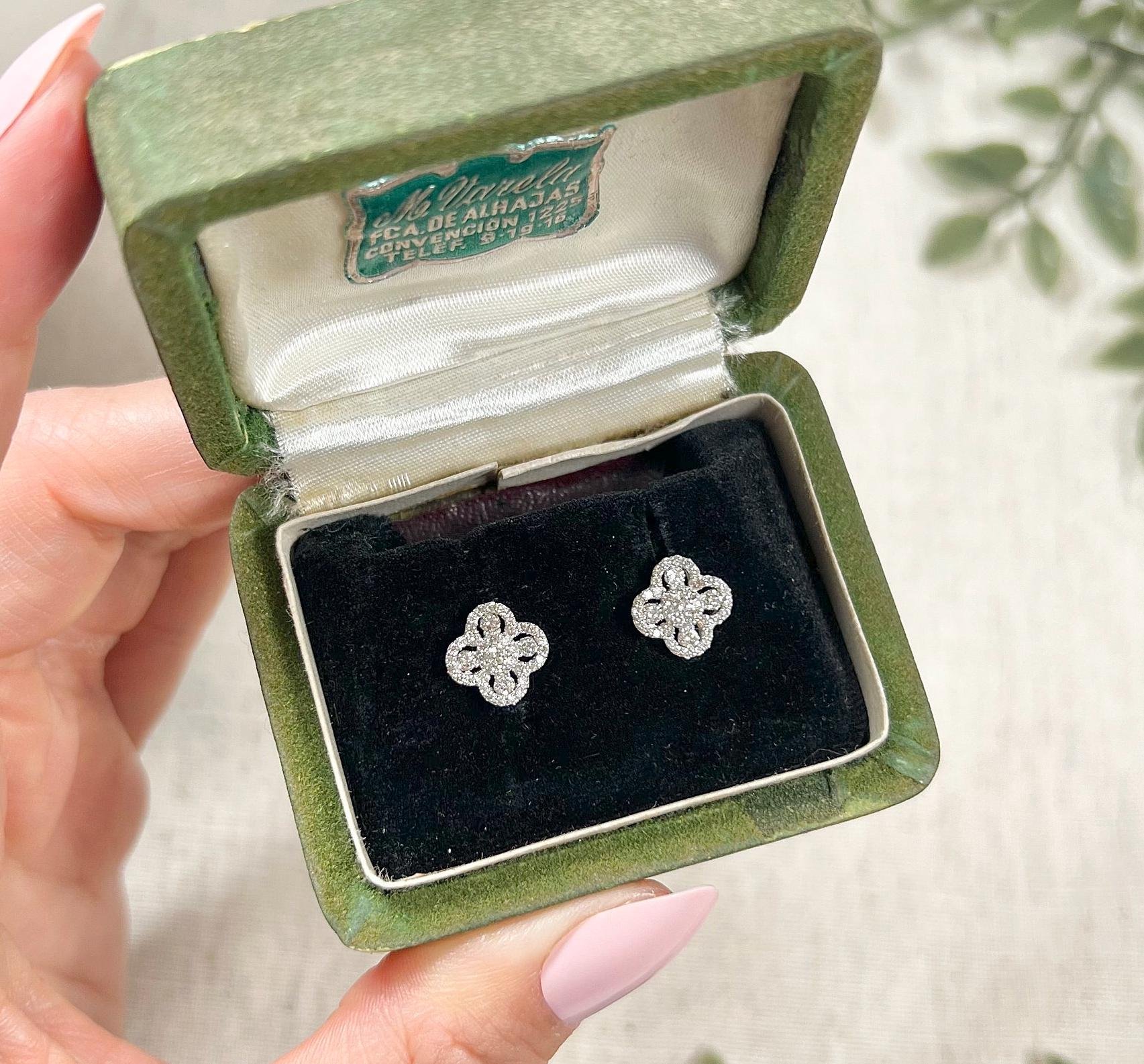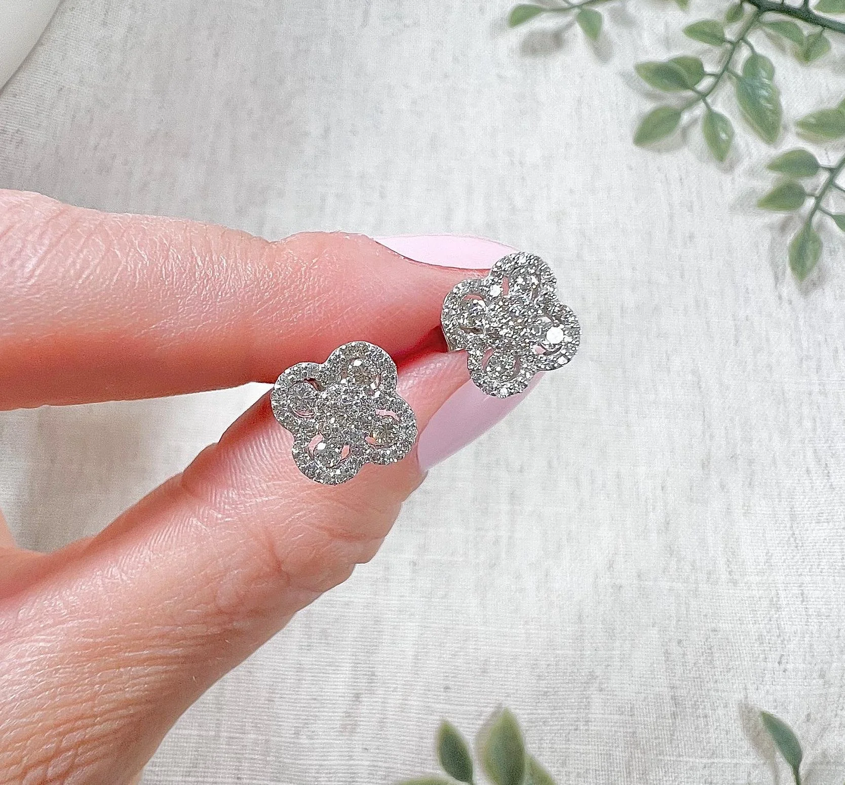 Pretty, preloved diamond stud earrings. Set with natural, diamonds in a pretty clover shaped, white gold settings.