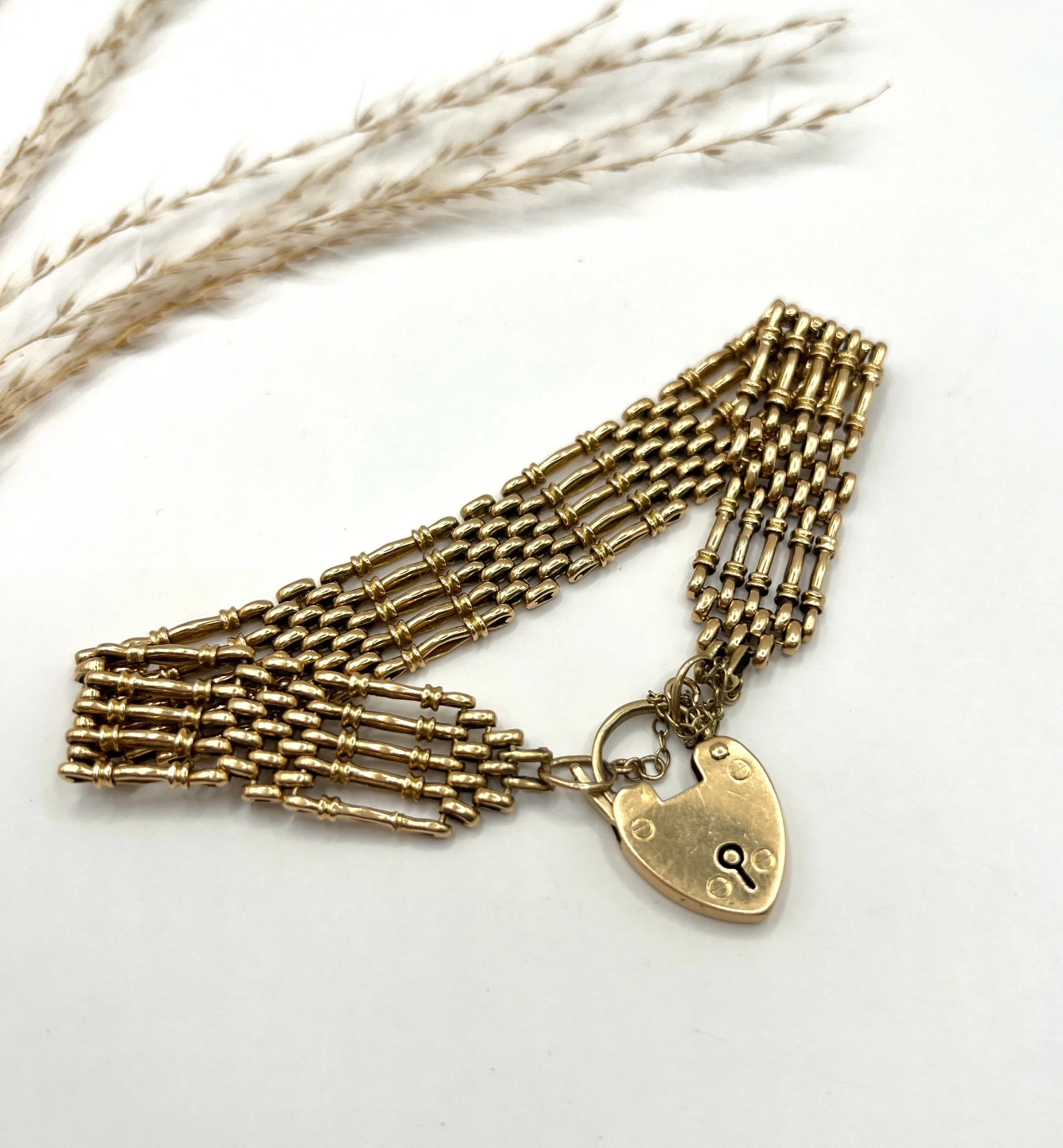 Discover the elegance of our stunning 15ct Yellow Gold Victorian Gate Bracelet, a true testament to the craftsmanship of a bygone era. This exquisite piece features a five-row design fastened with a heart padlock clasp, a blend of design and romance that captures the spirit of the Victorian period.