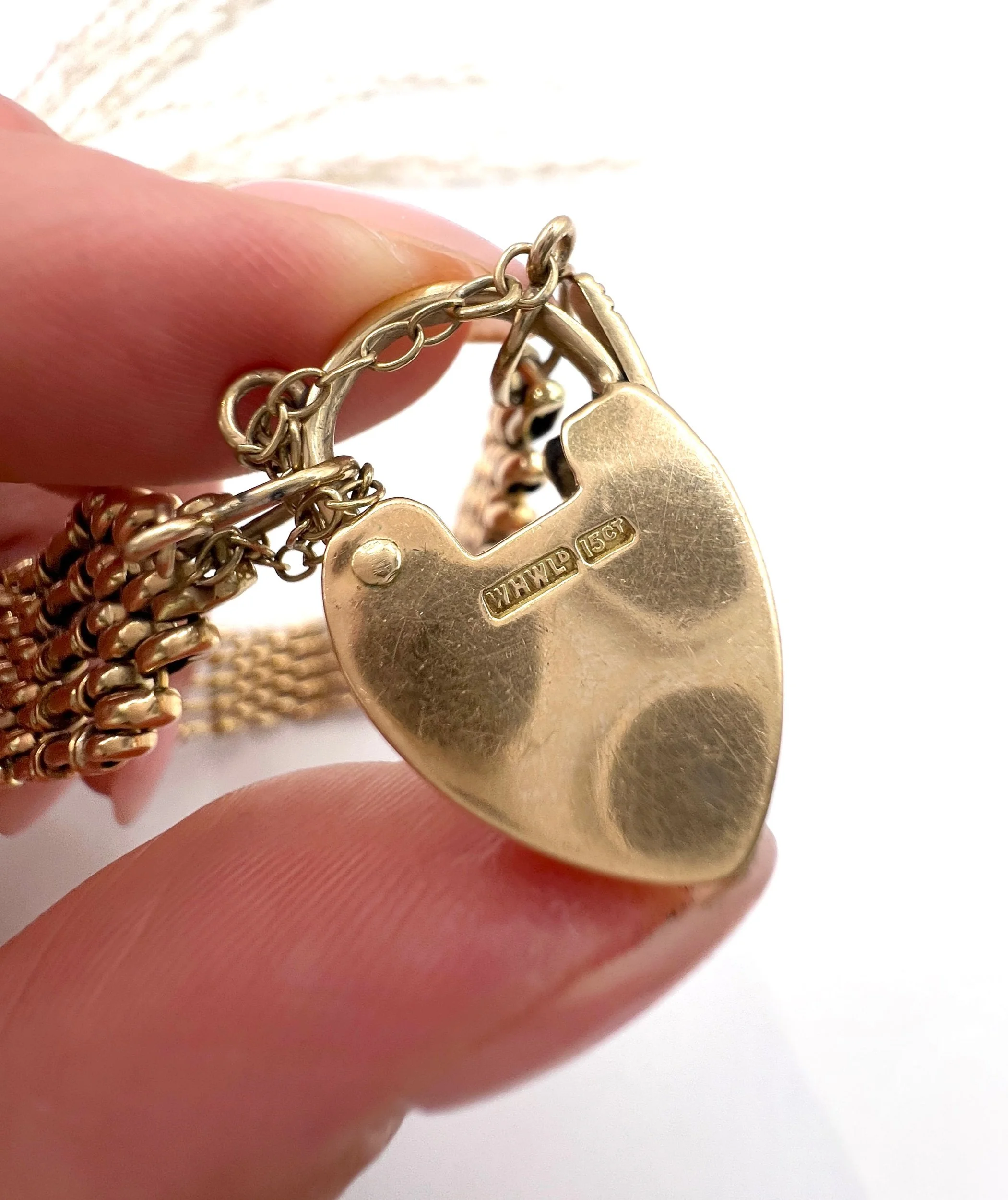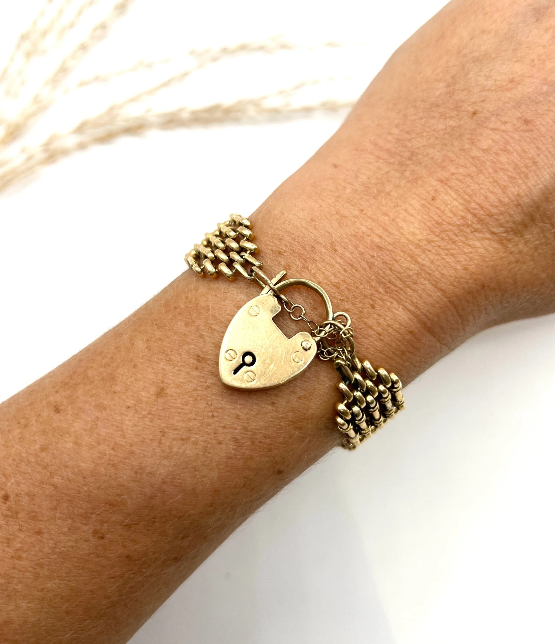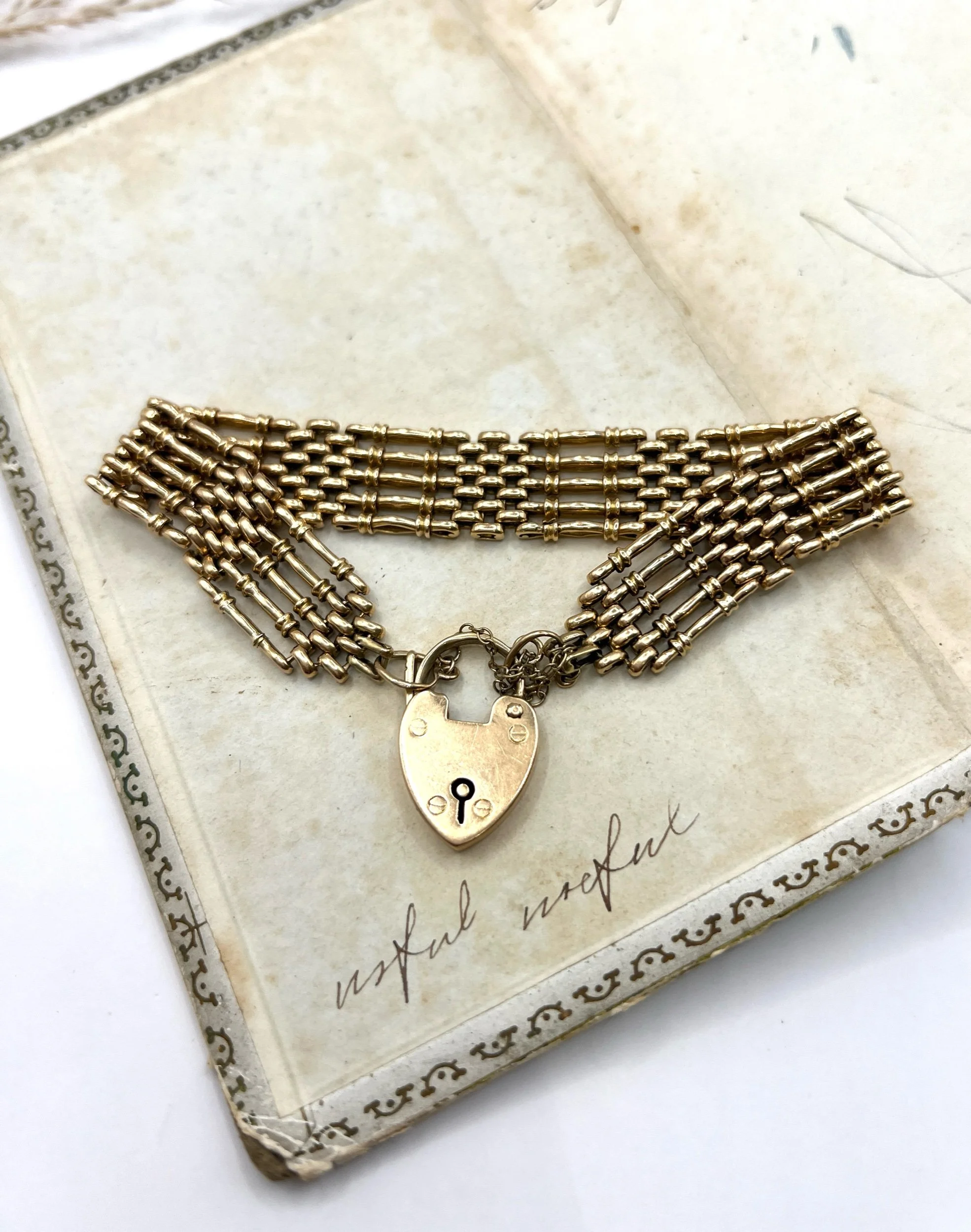 Antique 15ct Yellow Gold Stamped, Victorian 8 1/2 Inch Five Row Gate Bracelet with Heart Padlock Clasp