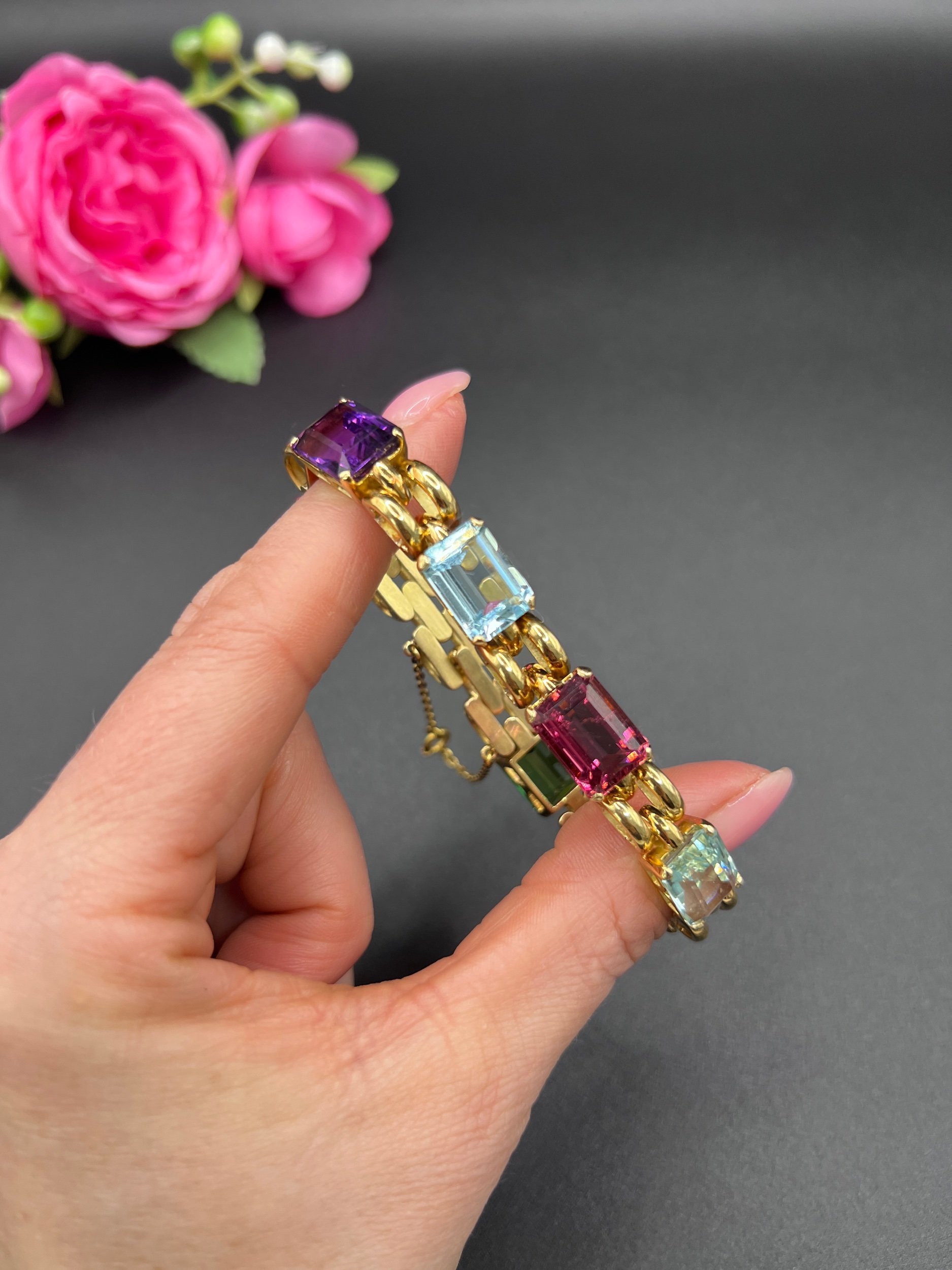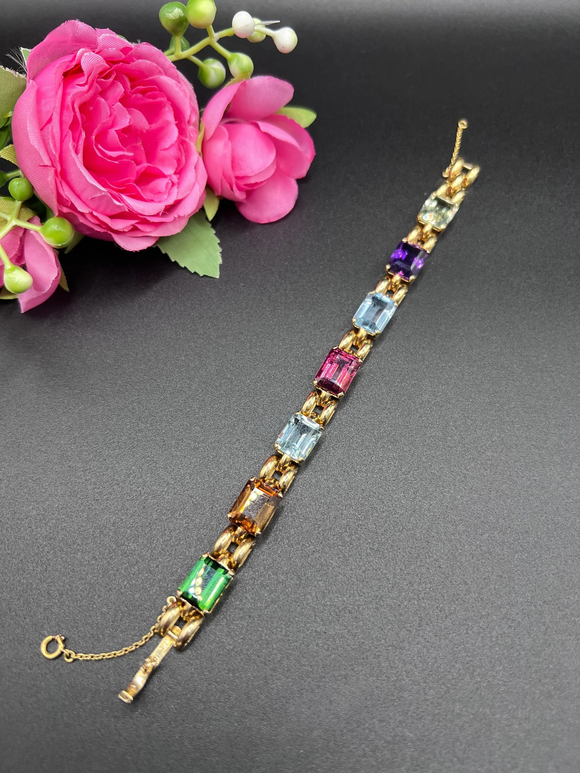 Introducing an exquisite piece from the 1940s, this 18ct gold link bracelet is a true testament to timeless elegance. Meticulously crafted, it features a beautiful array of emerald-cut gemstones, including vibrant pink tourmaline, serene aquamarine, rich amethyst, and sunny citrine. Each gemstone is thoughtfully interspersed among the gold links, creating a harmonious blend of colour and sparkle that captures the essence of vintage sophistication.