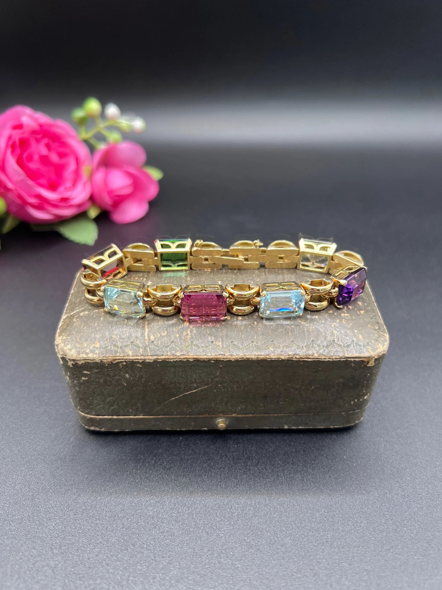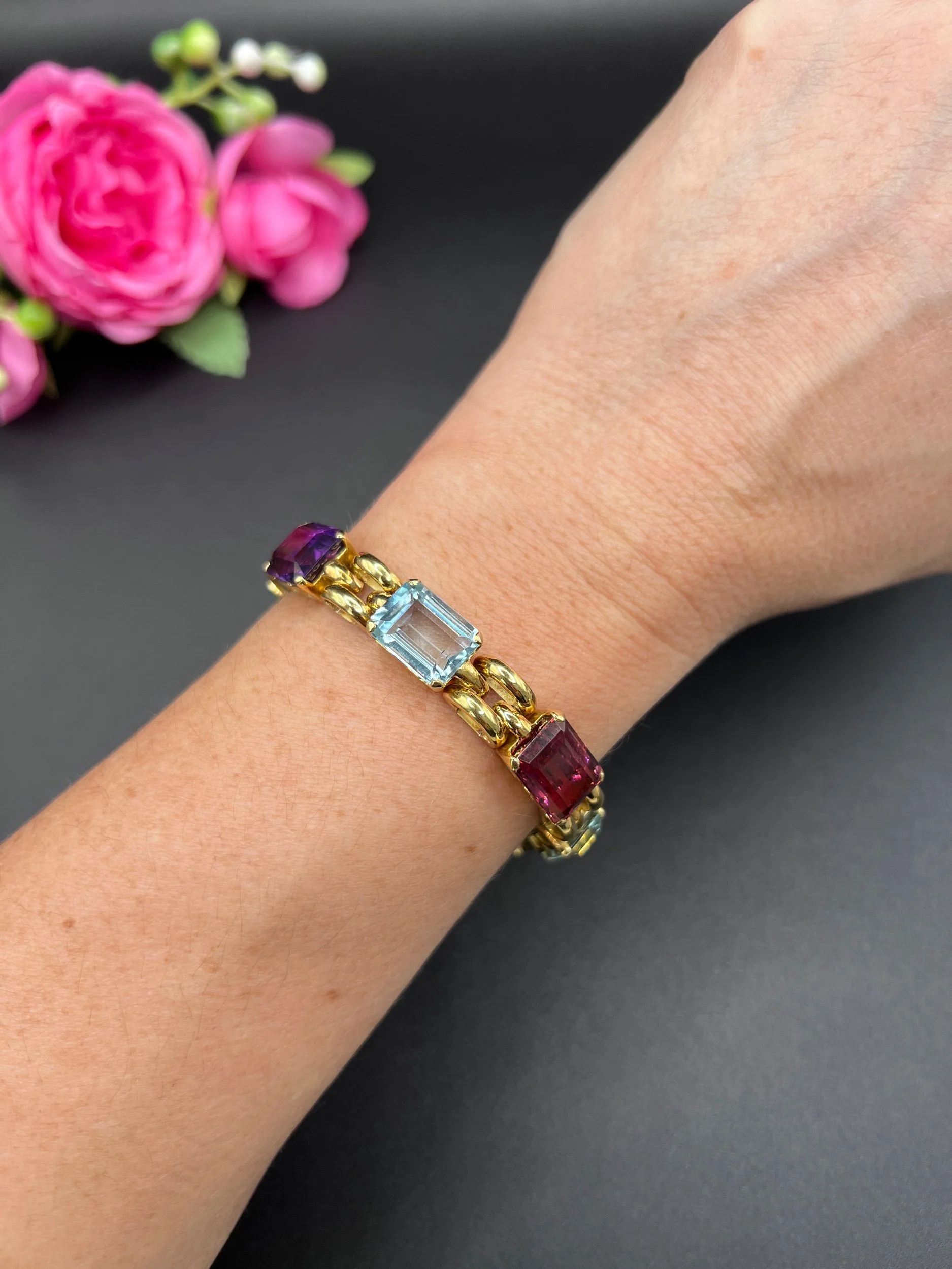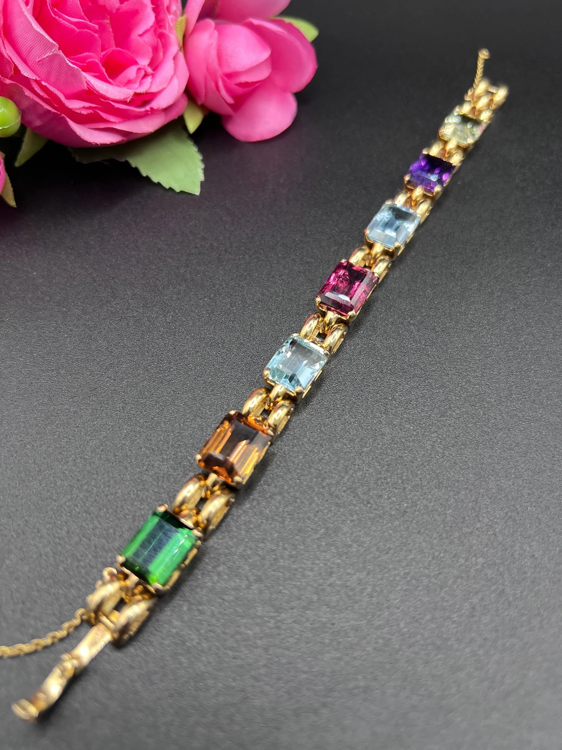 Vintage 18ct Gold, 1940s Citrine, Aquamarine, Tourmaline, Amethyst Harlequin Bracelet
