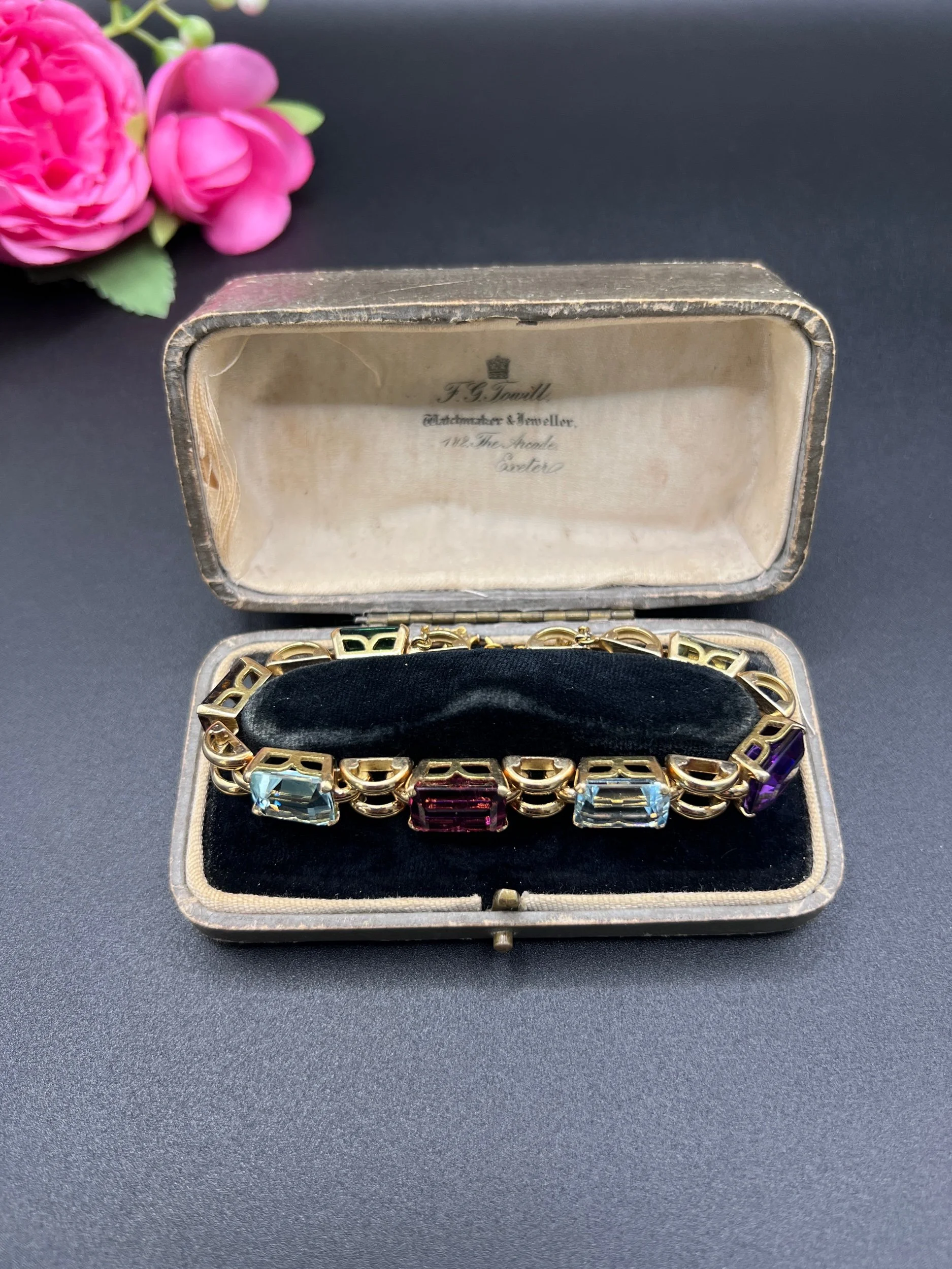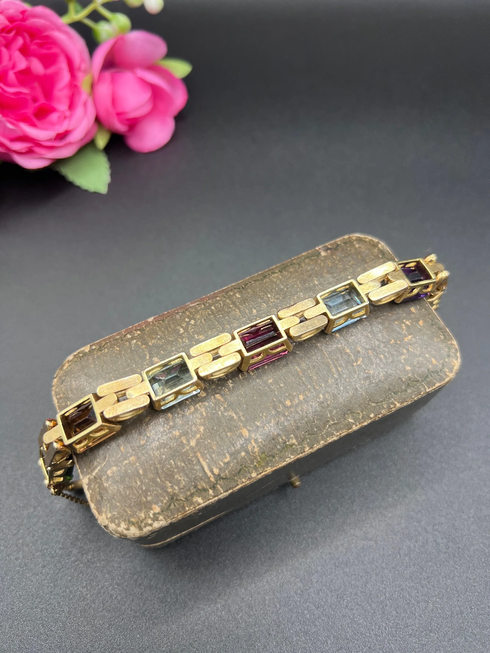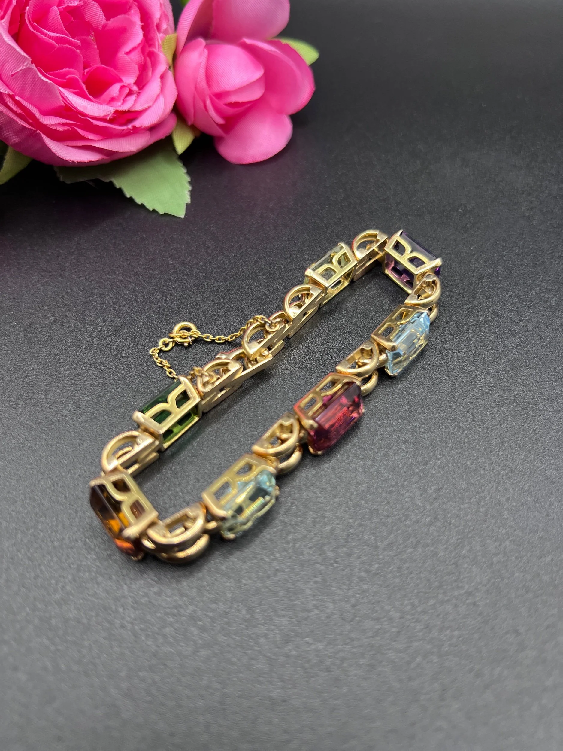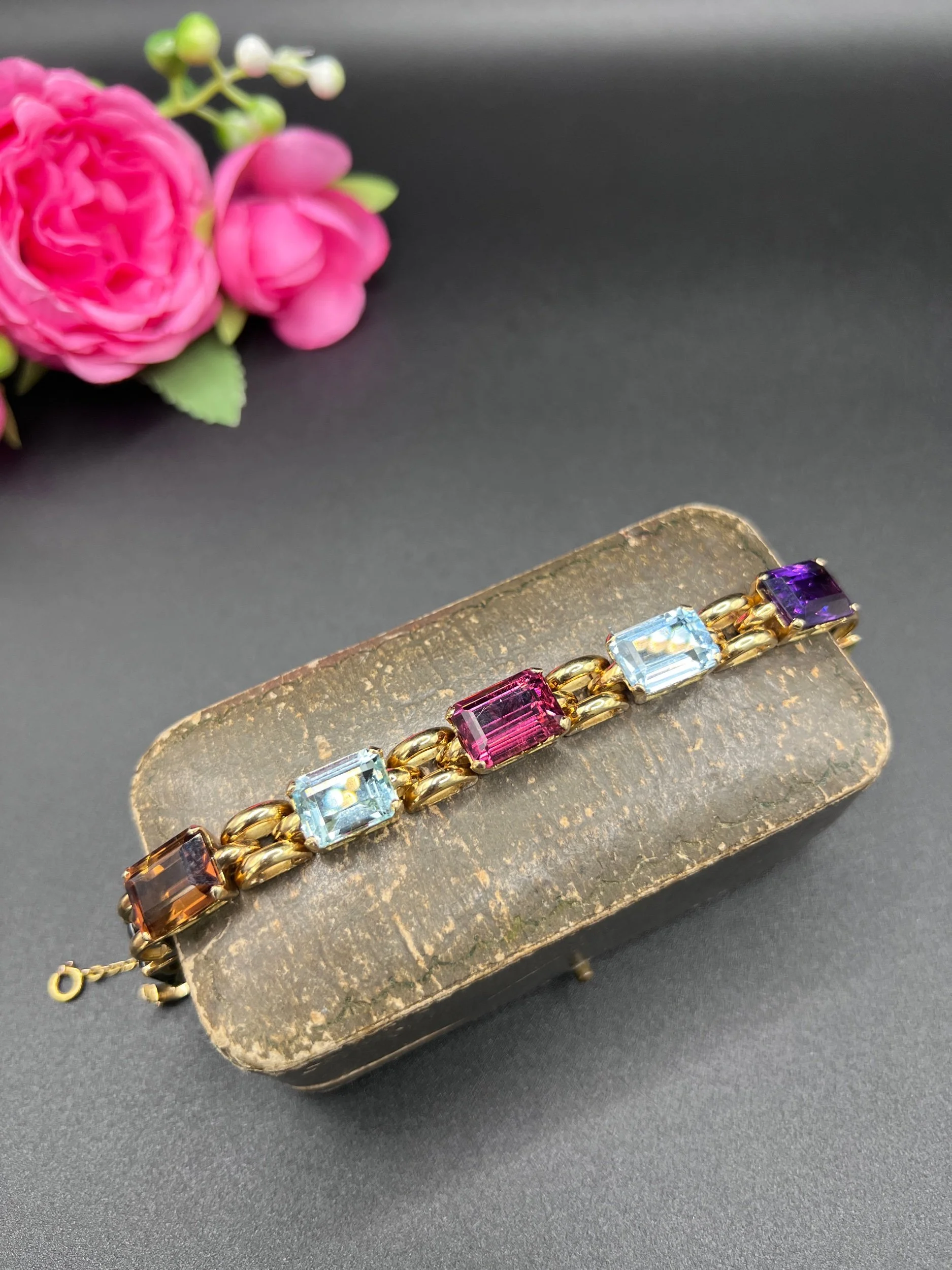Vintage 18ct Gold, 1940s Citrine, Aquamarine, Tourmaline, Amethyst Harlequin Bracelet