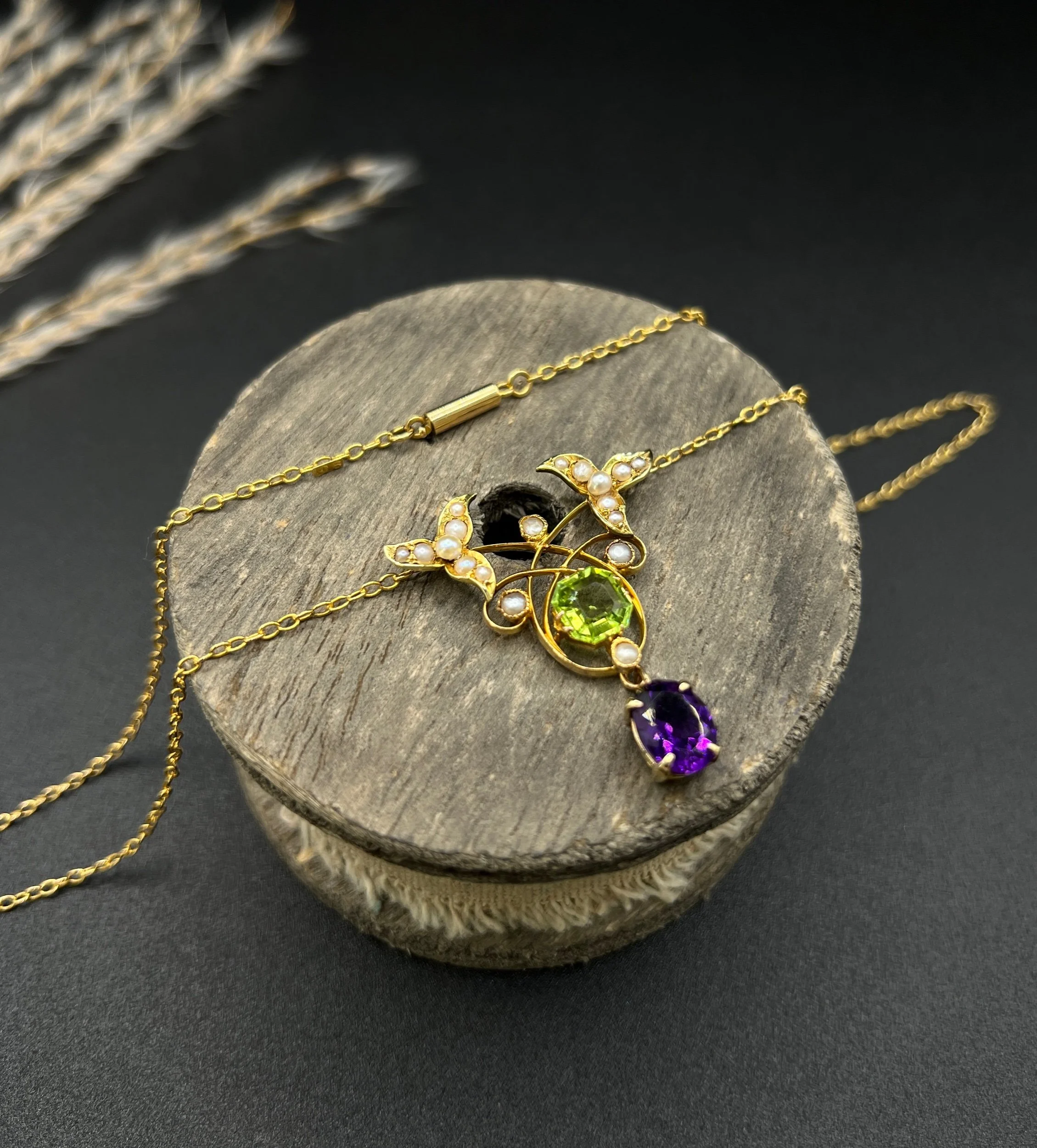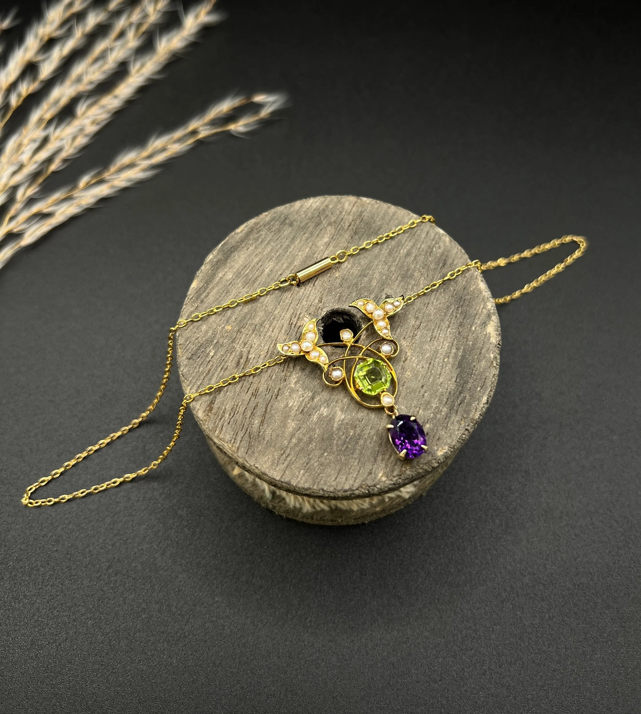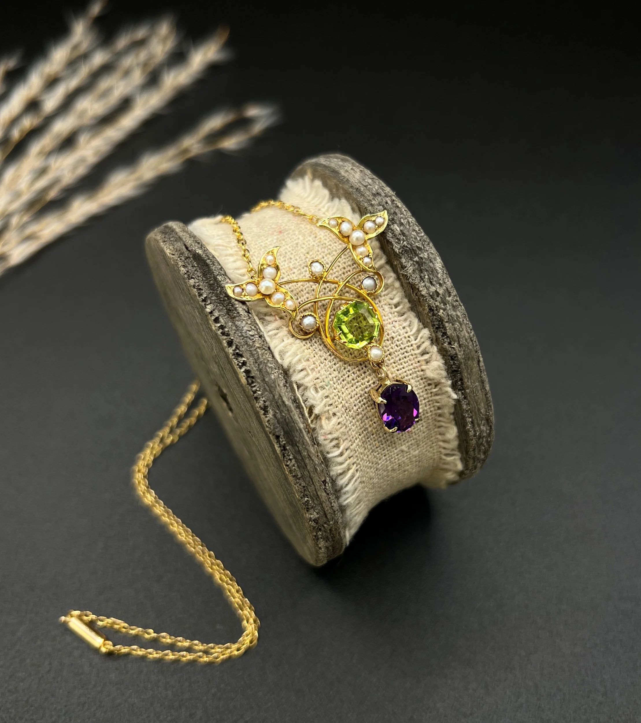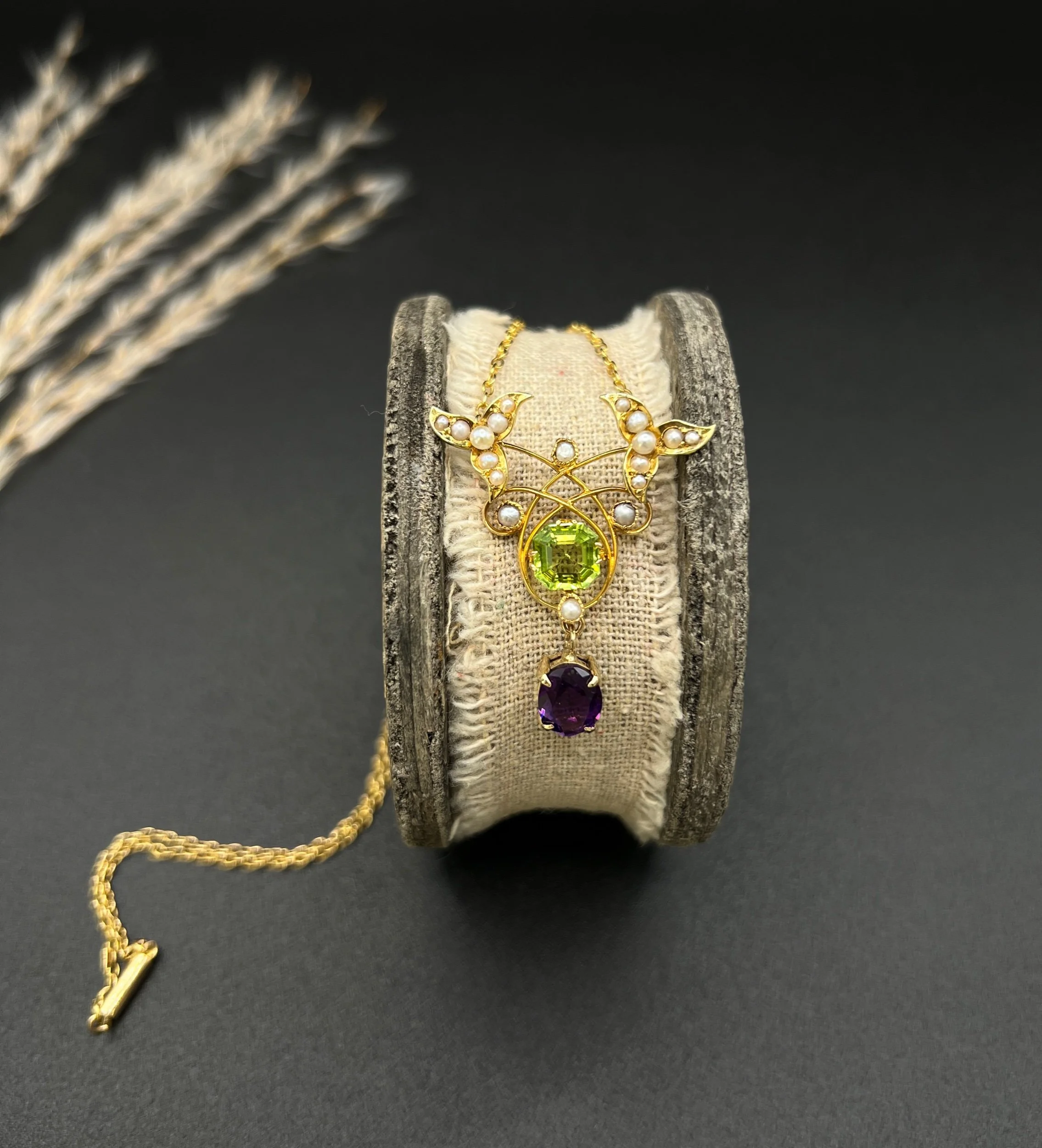 Antique 9ct Gold Stamped, Authentic Edwardian-era Suffragette Pendant Necklace with Amethyst, Peridot & Seed Pearls