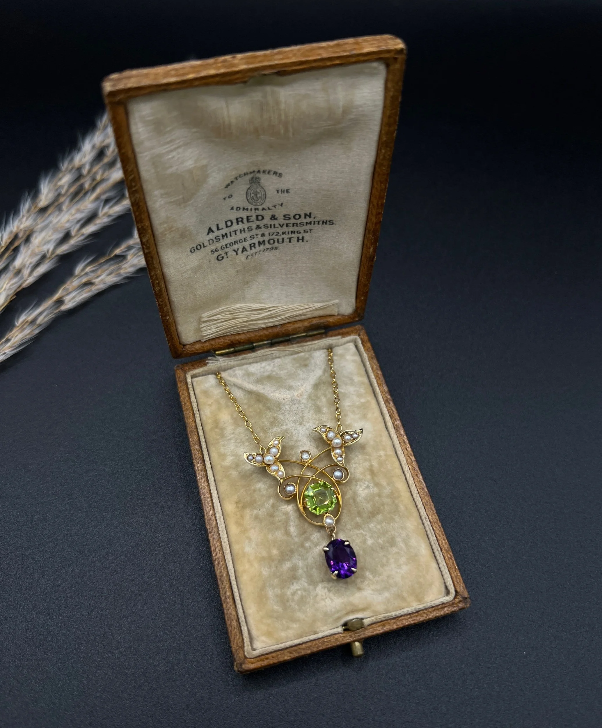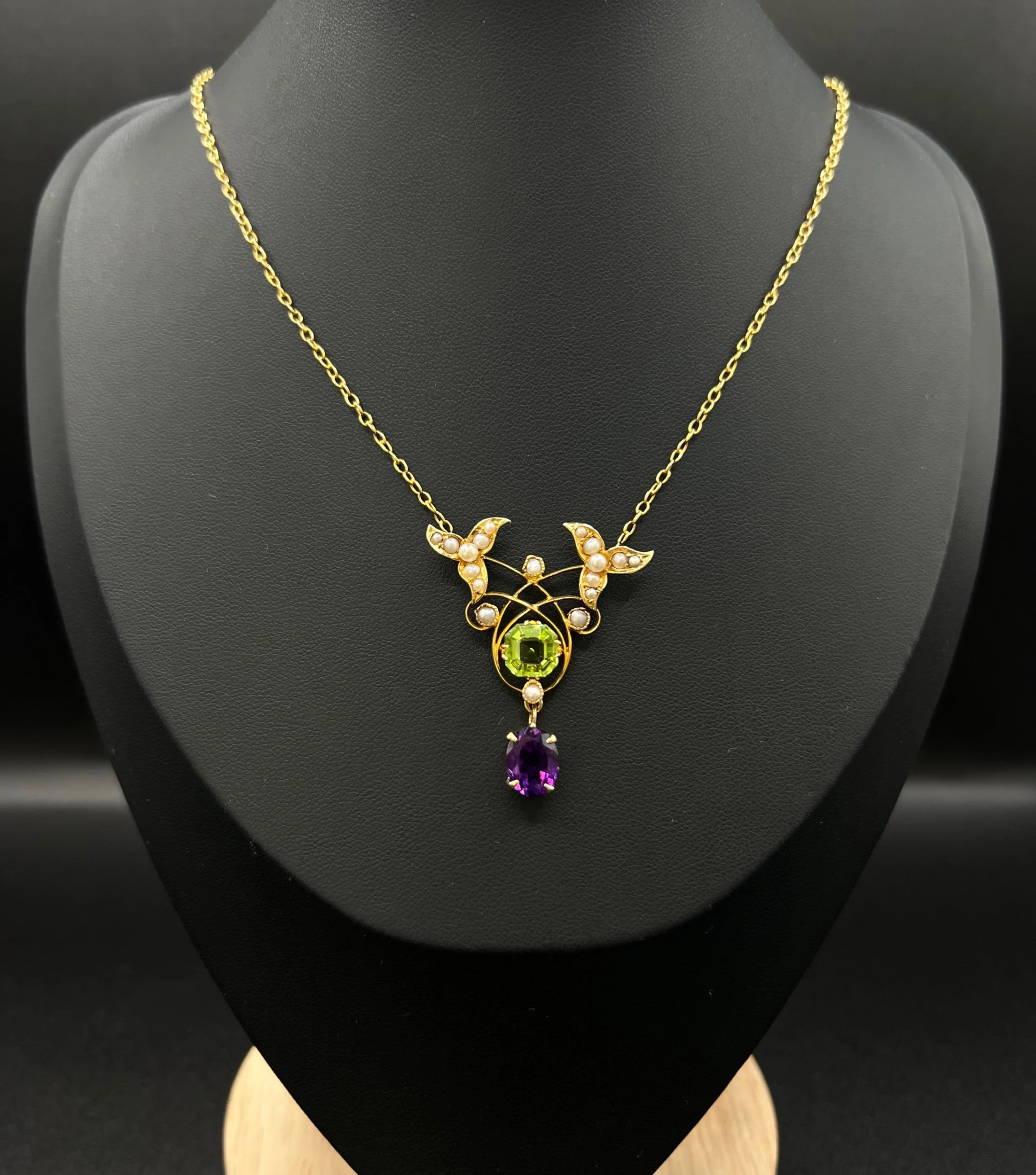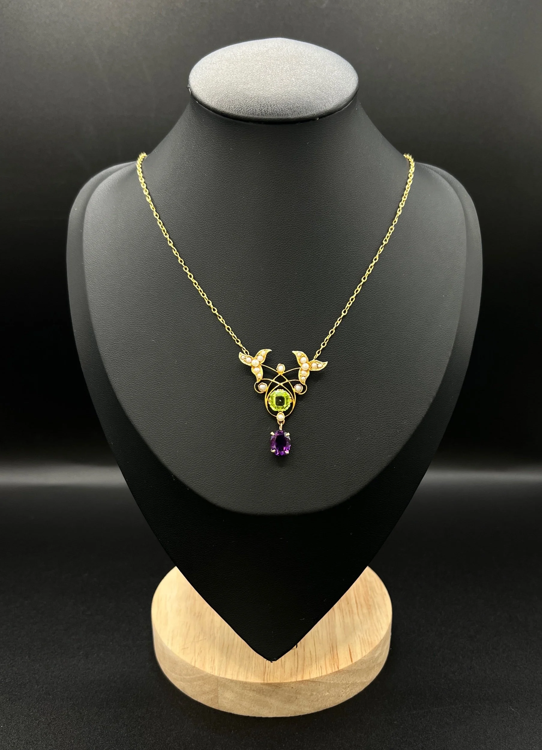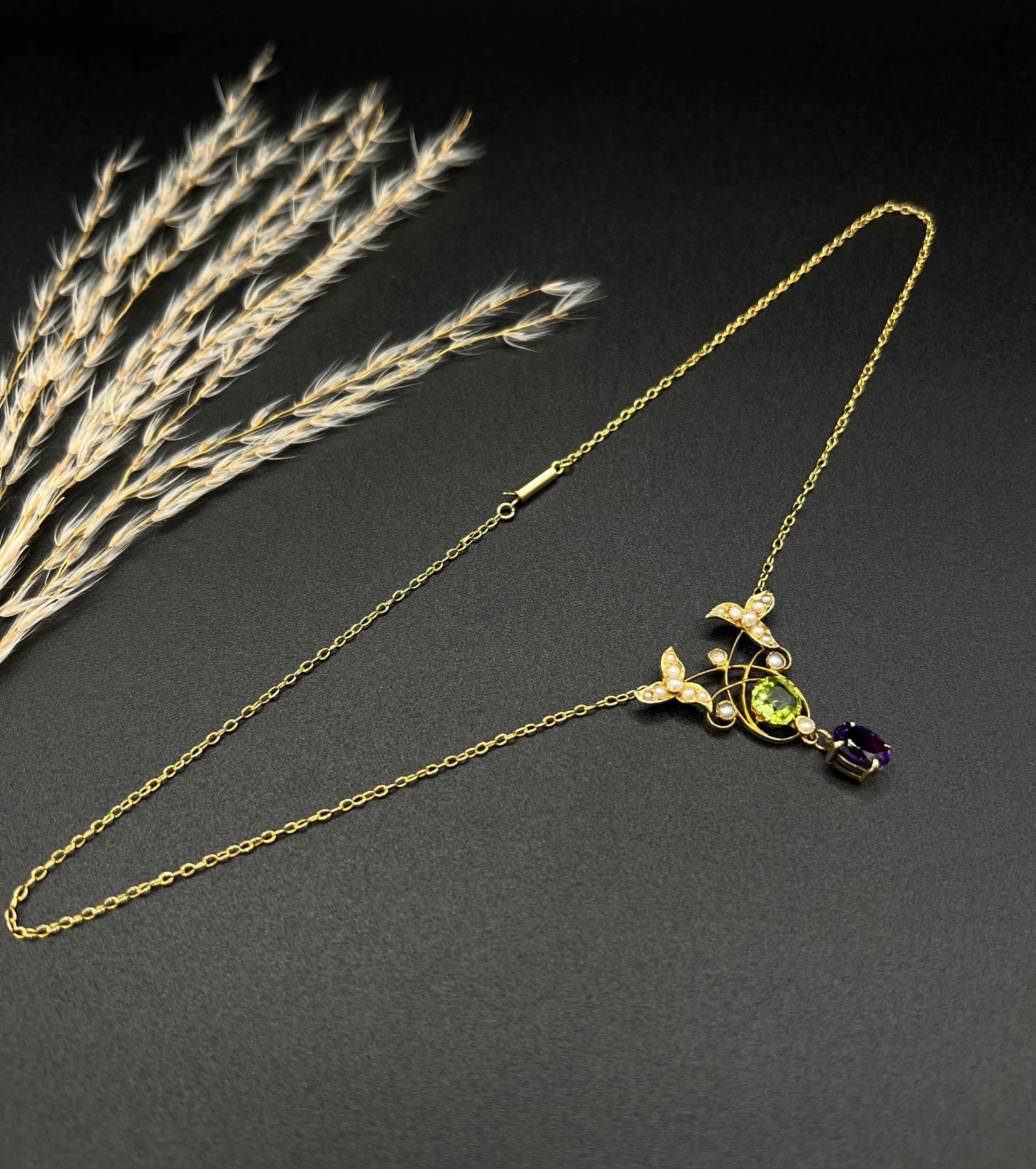 Antique 9ct Gold Stamped, Authentic Edwardian-era Suffragette Pendant Necklace with Amethyst, Peridot & Seed Pearls