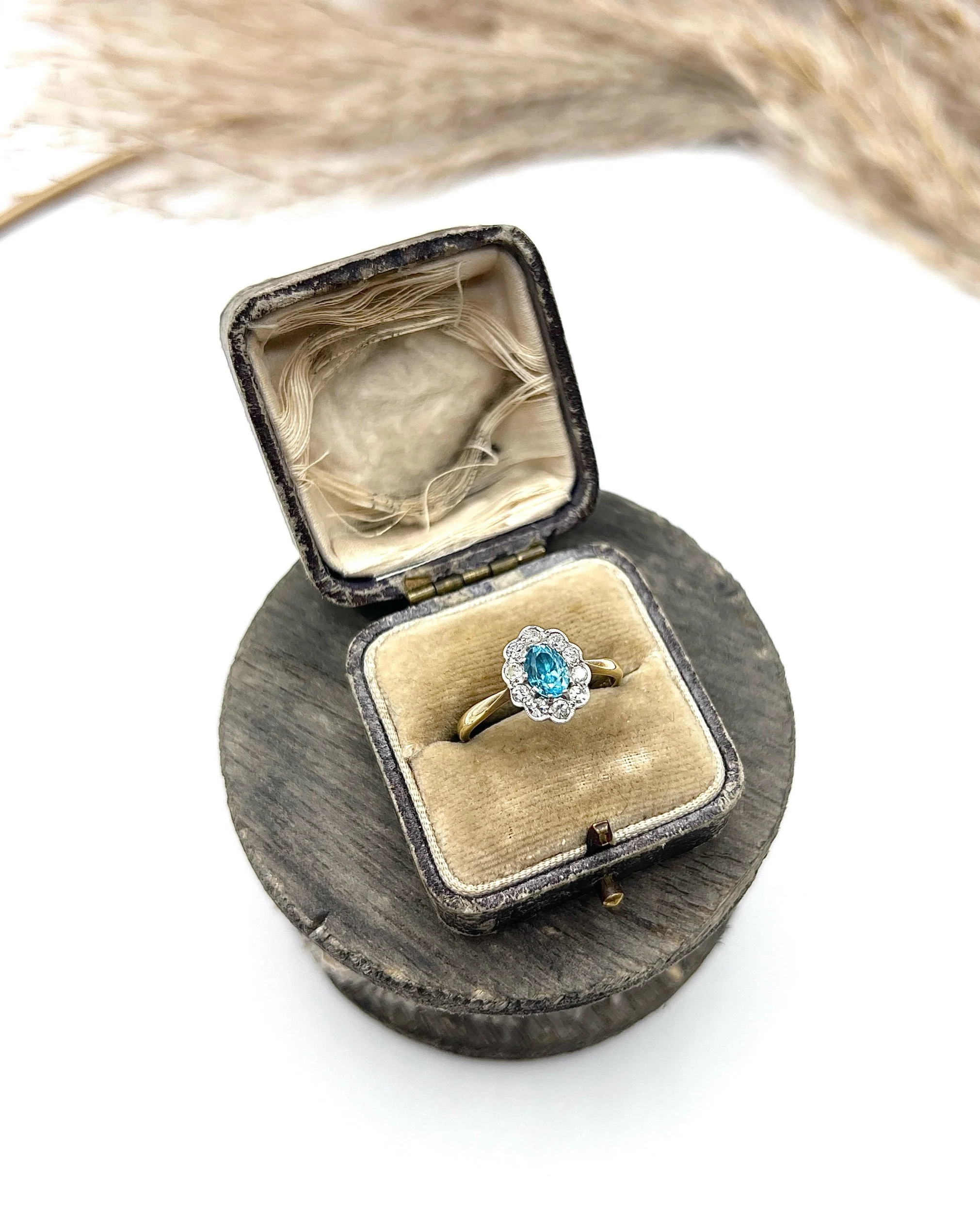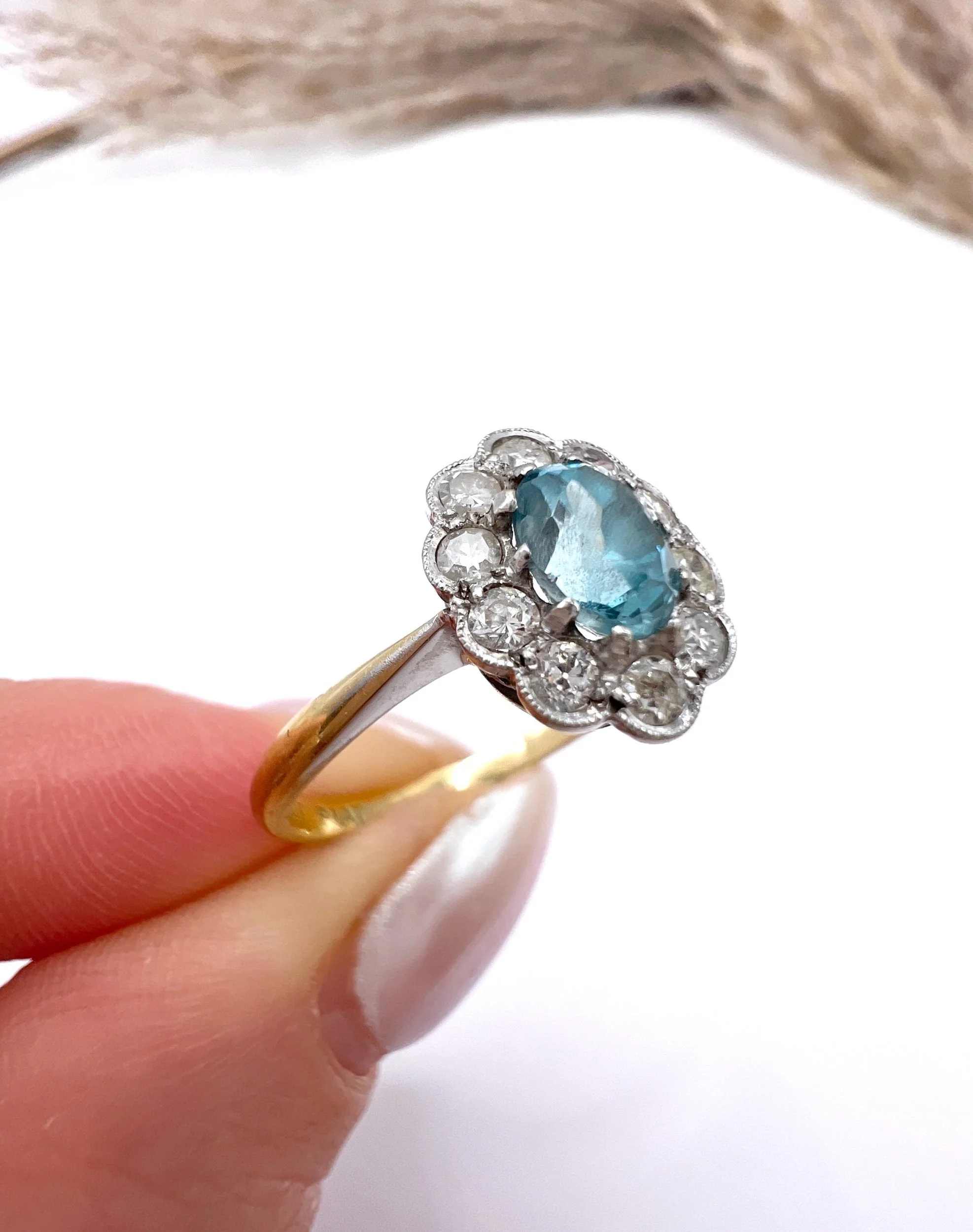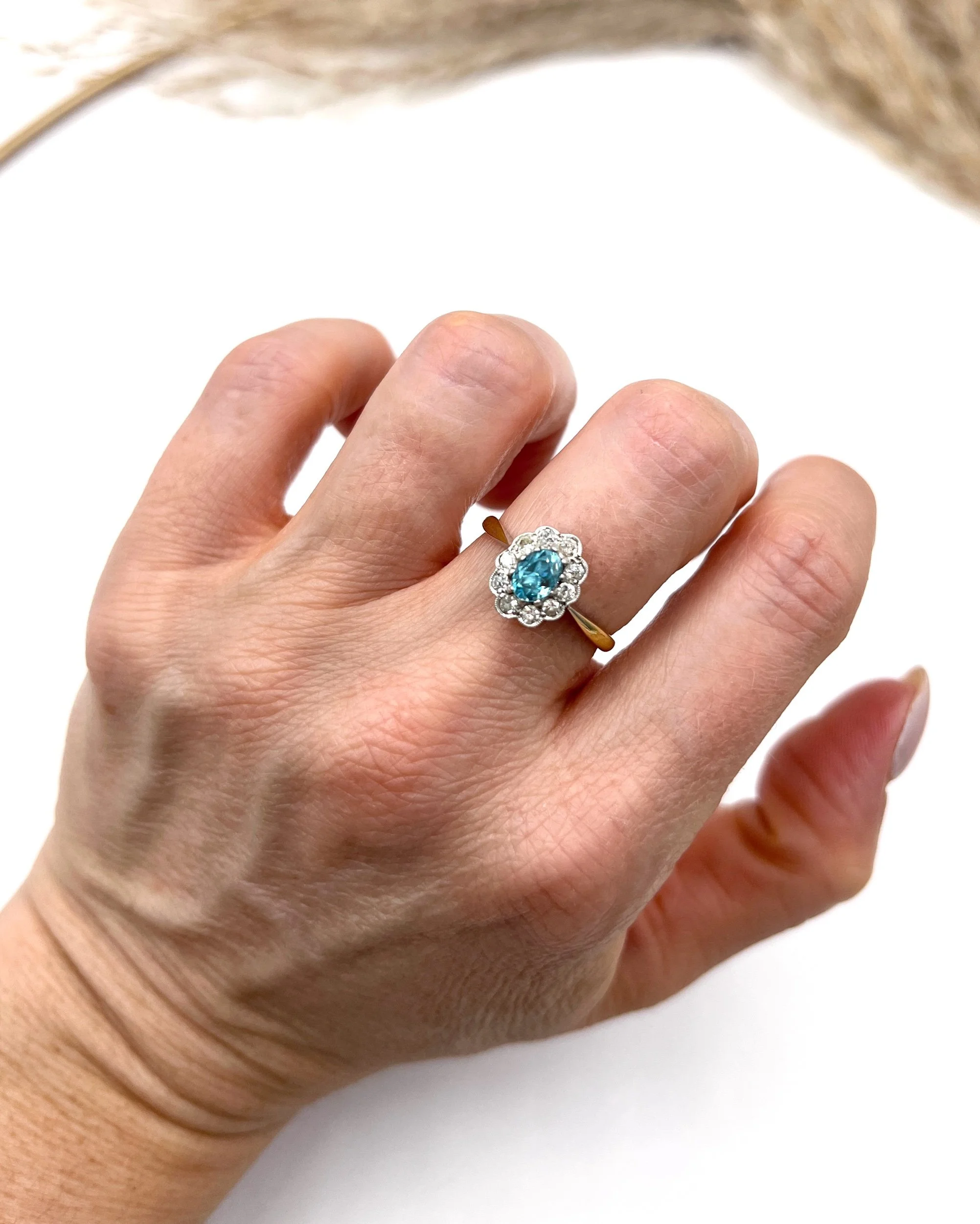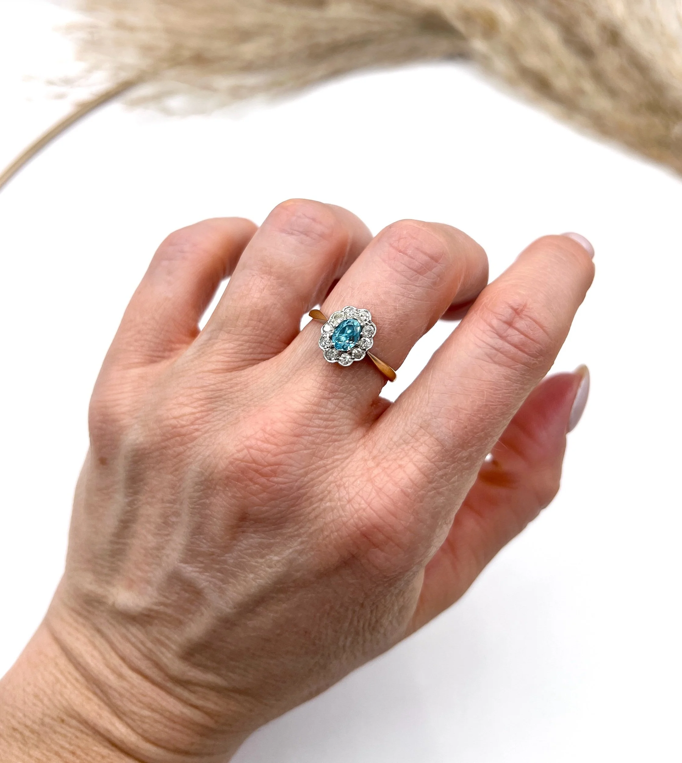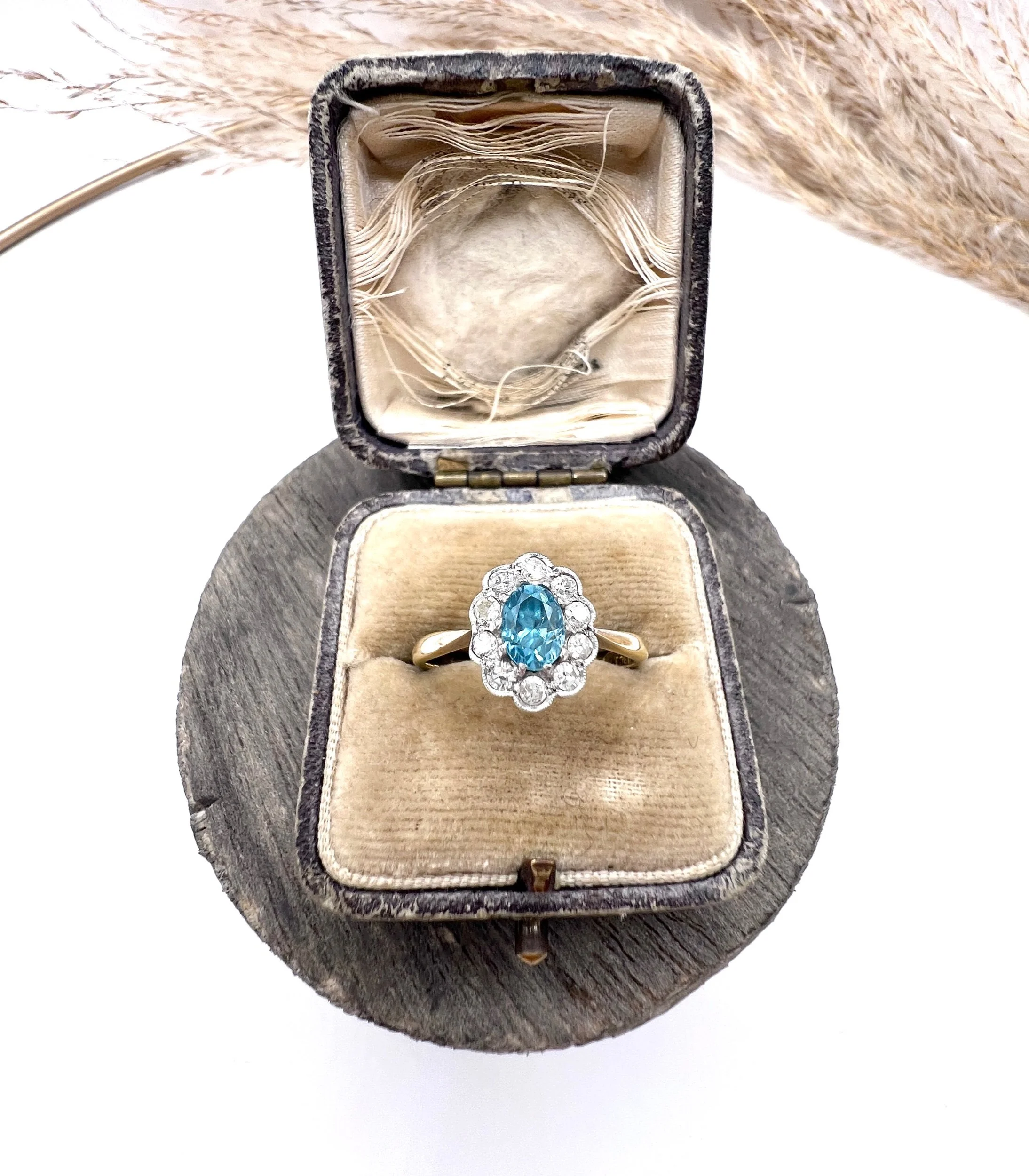 This stunning antique cluster ring from the Edwardian era showcases a beautiful oval-cut zircon centre surrounded by a captivating halo of natural diamonds, all set in platinum. It is mounted on an 18-carat yellow gold band that tapers at the reverse, making it a lovely example of a bygone era. This ring is sure to catch the eye of anyone who appreciates the beauty and elegance of Edwardian jewellery.