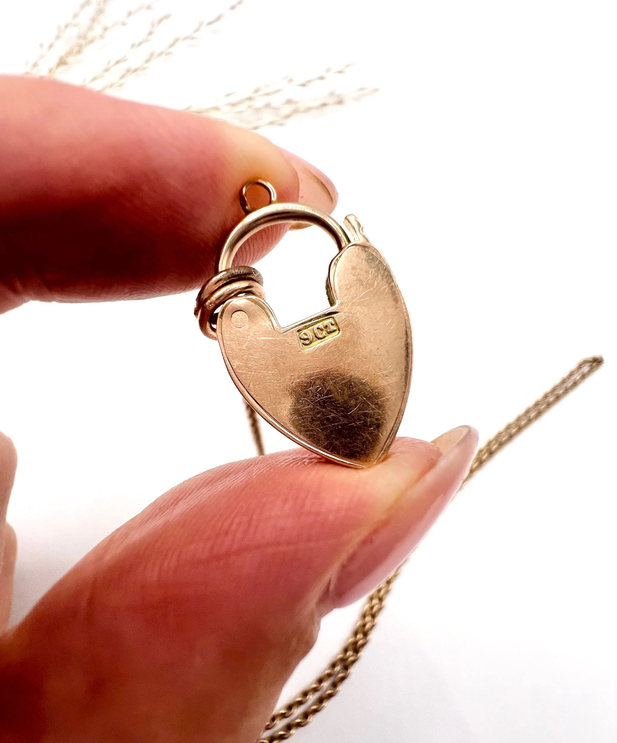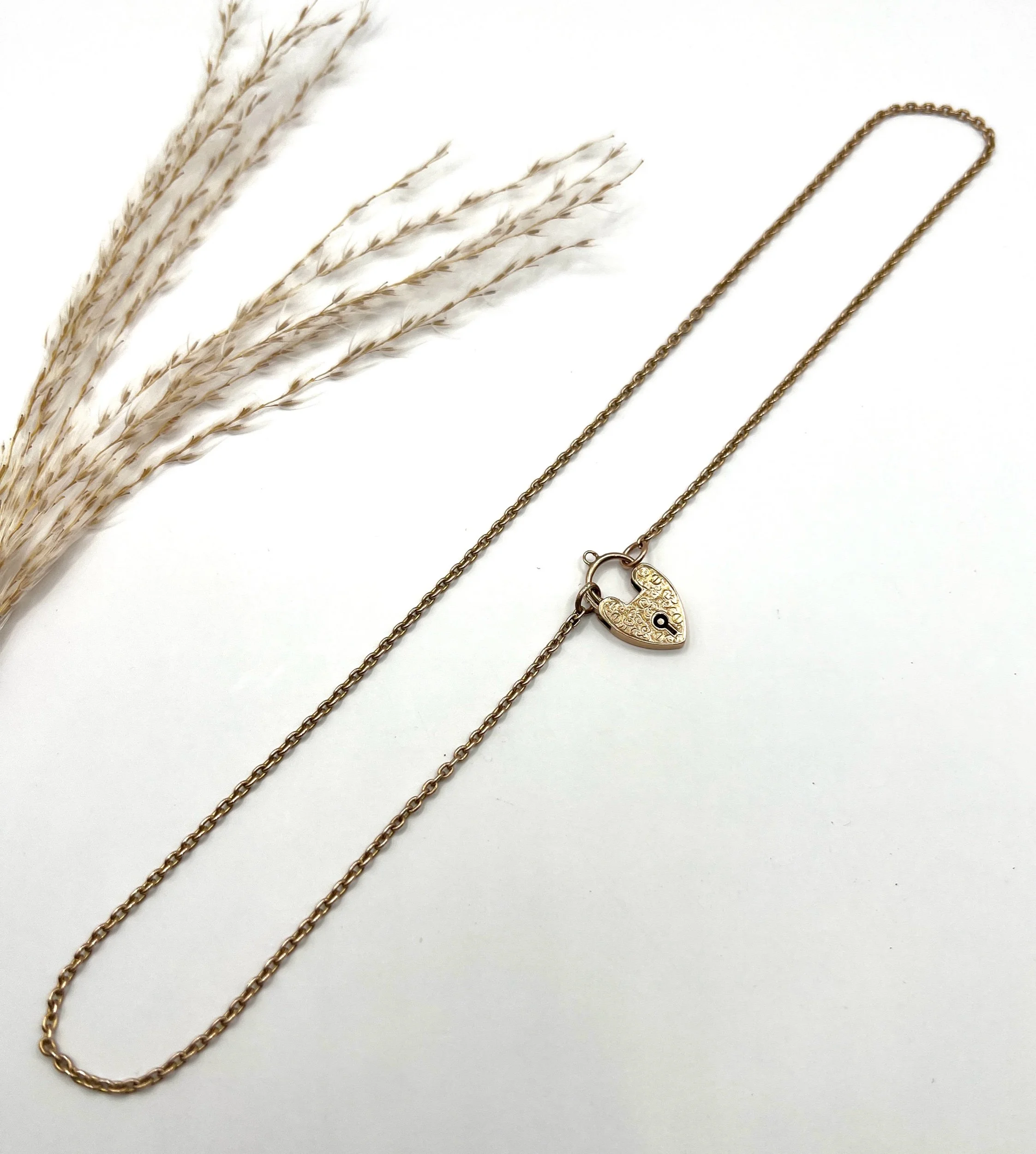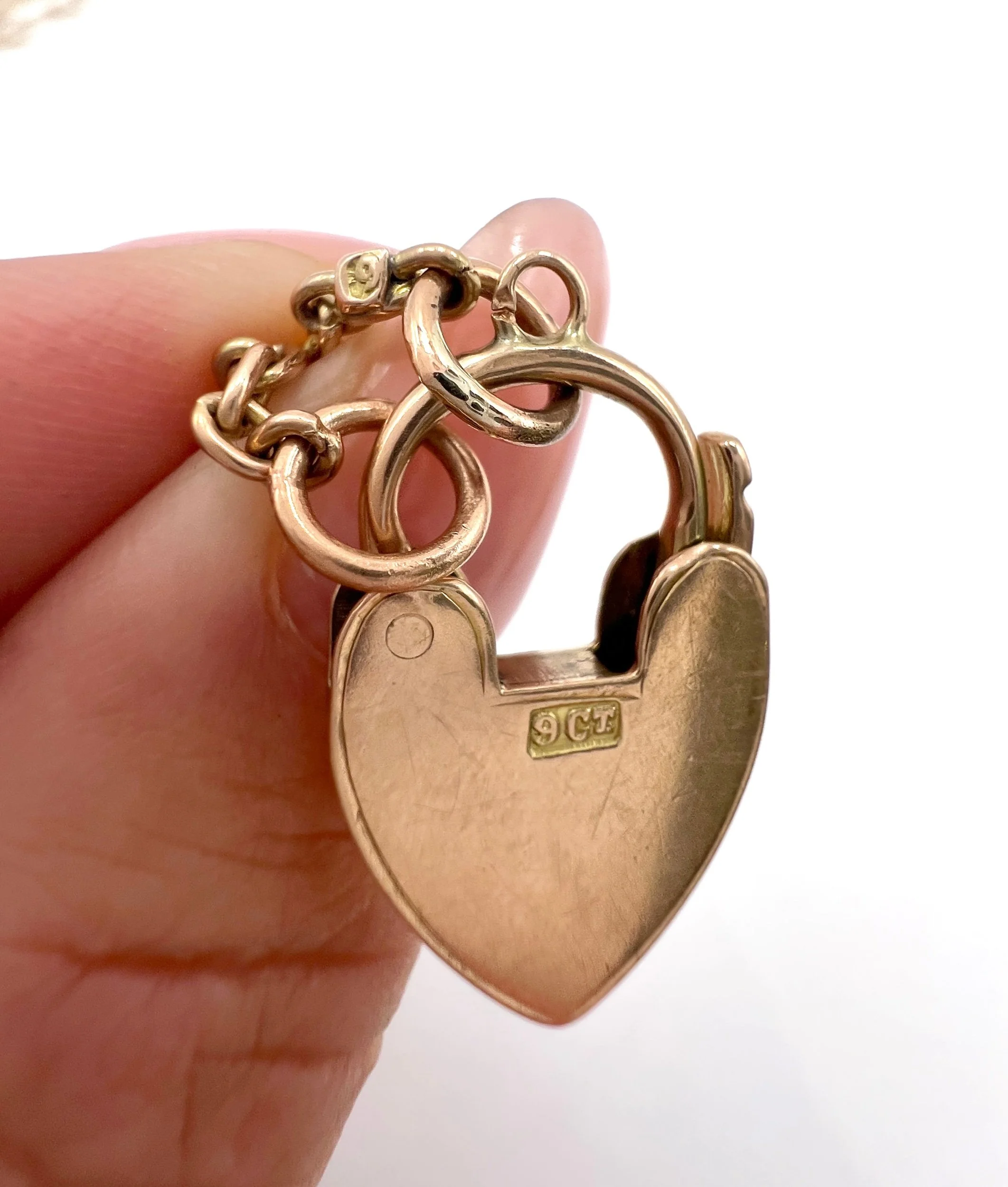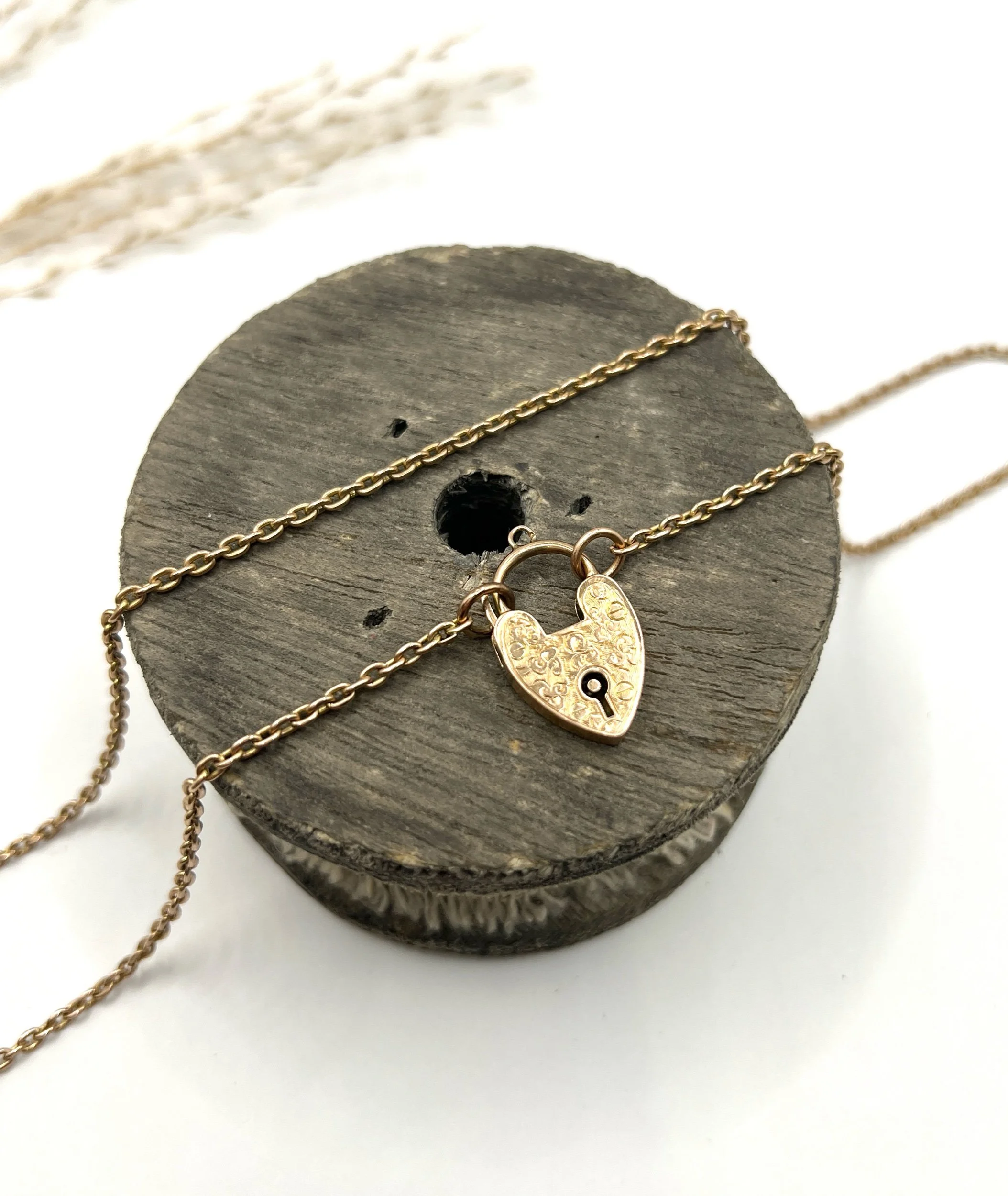 Antique 9ct Rose Gold, Edwardian Trace Link Chain with Fancy Engraved Heart Padlock Clasp