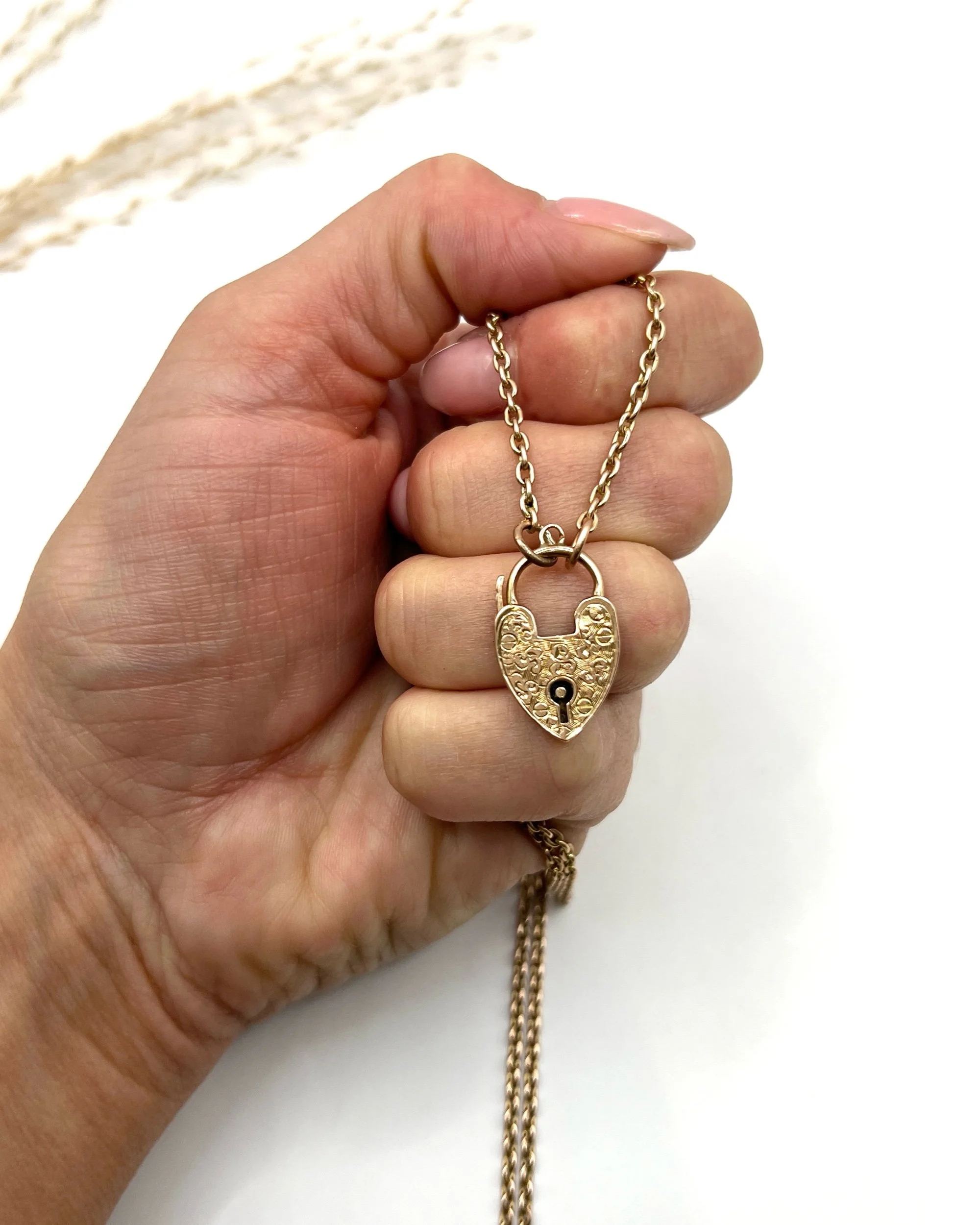 The chain measures approximately 20 1/4 Inches in length including the padlock, and 2.1mm in width. The heart padlock measures approximately 20mm in height and 13.2mm in width.
