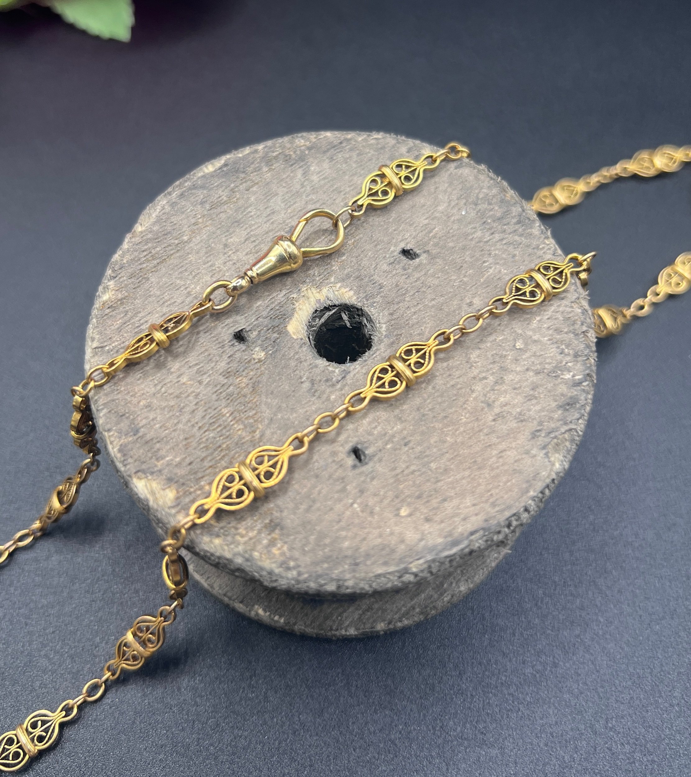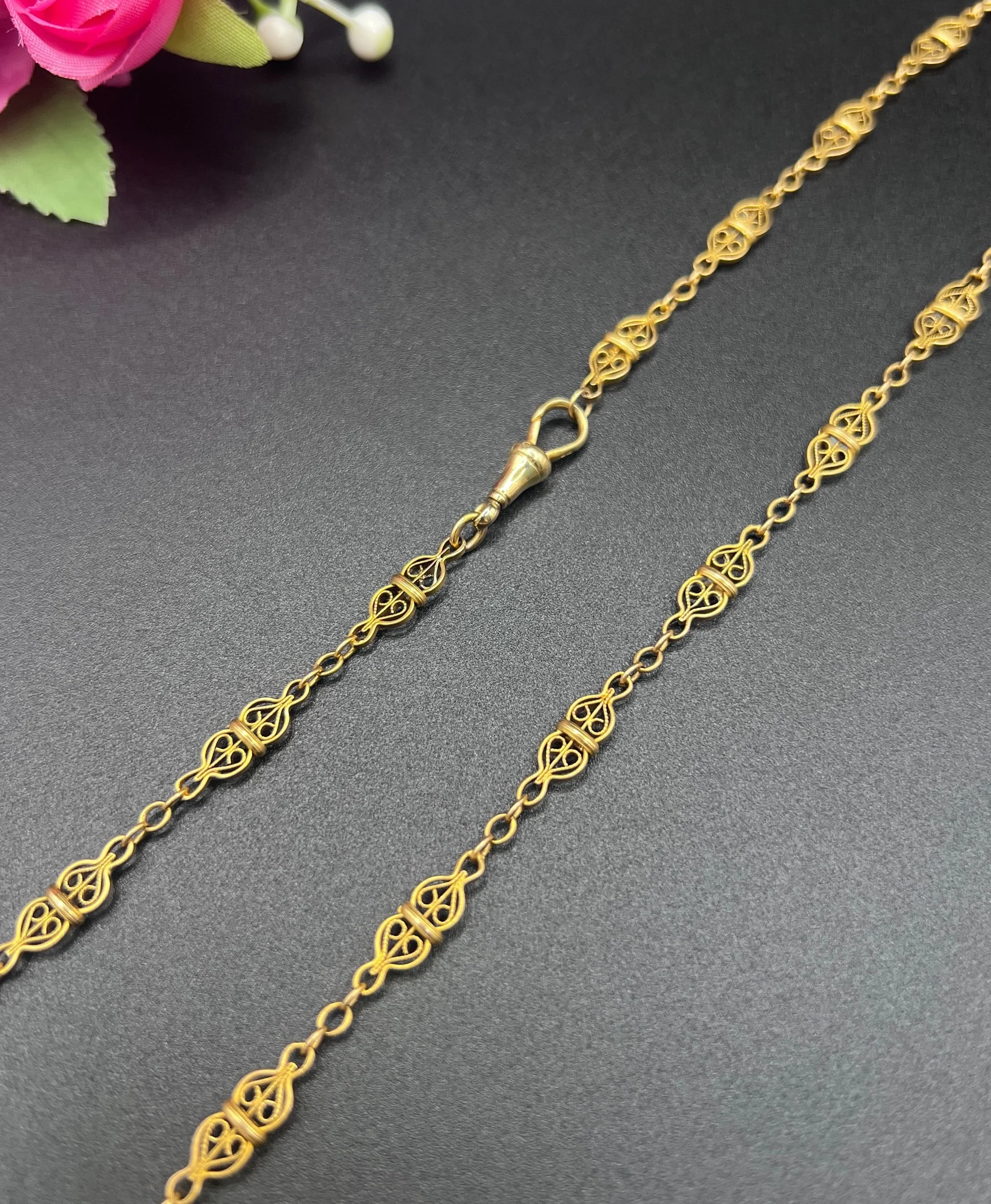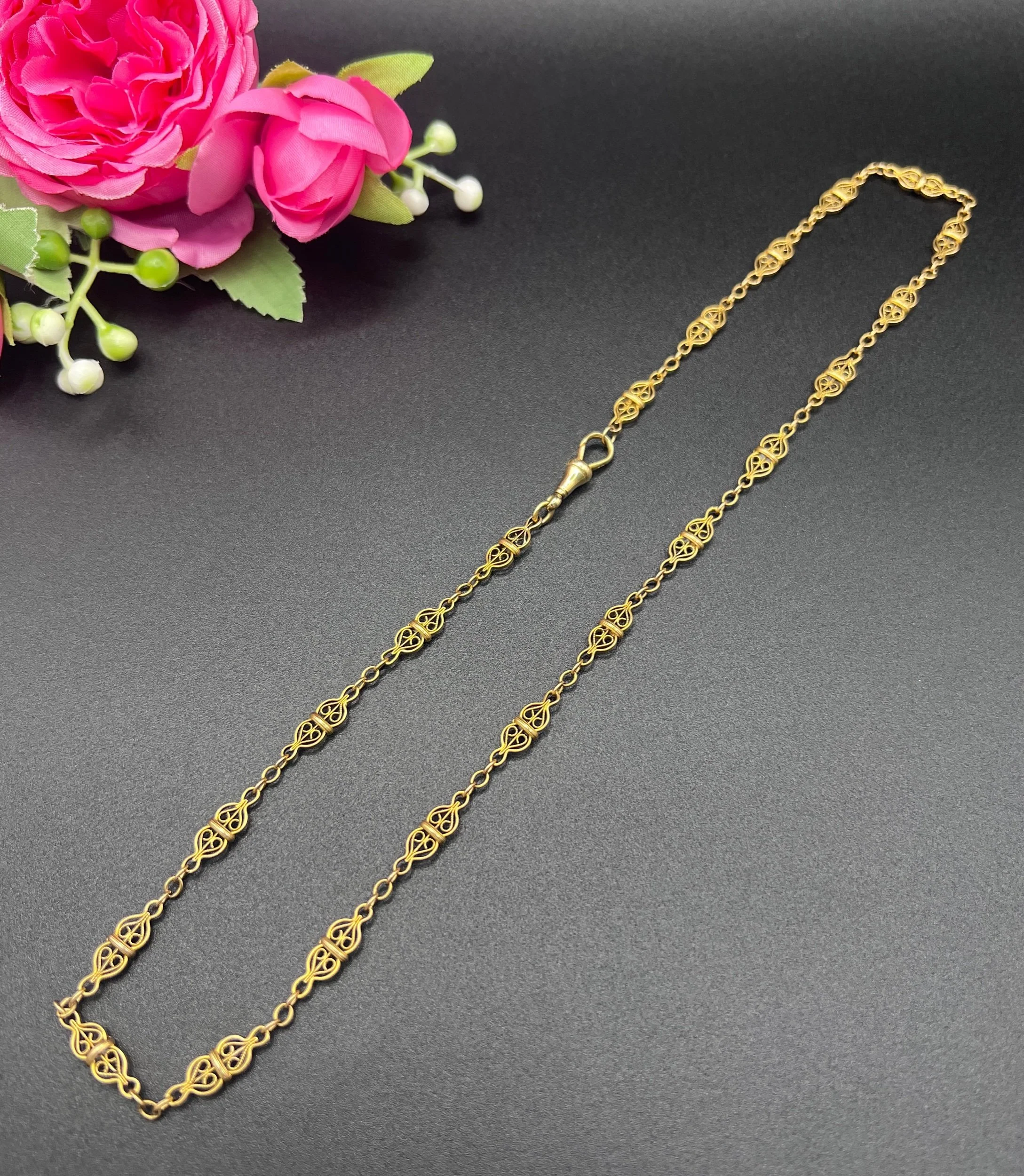 Step back in time with this exquisite 18ct yellow gold chain from the 1920s, a true testament to vintage elegance and craftsmanship. This eye-catching piece features beautifully crafted, fancy links, each adorned with intricate filigree gold work that showcases the artistry of the era.
