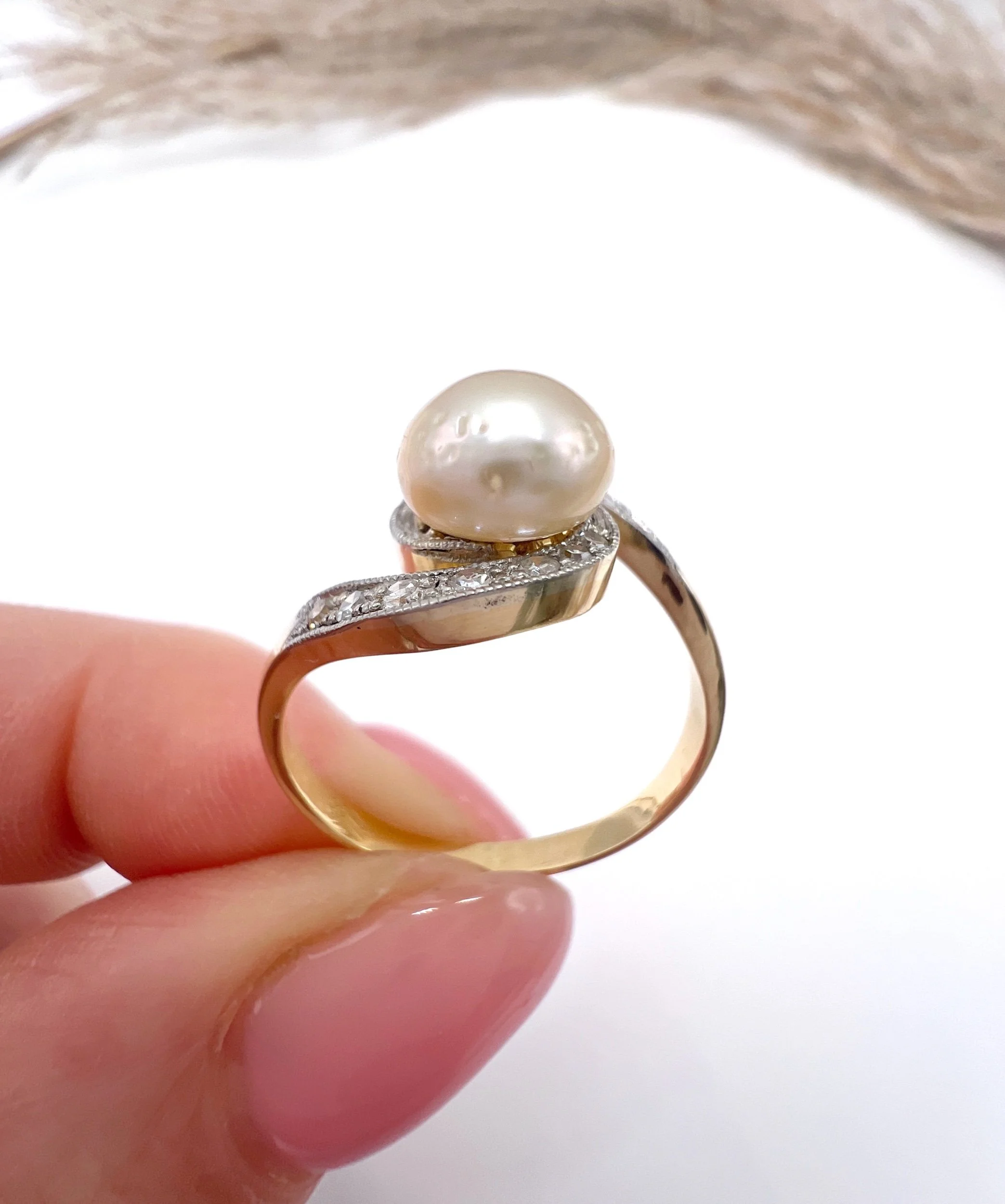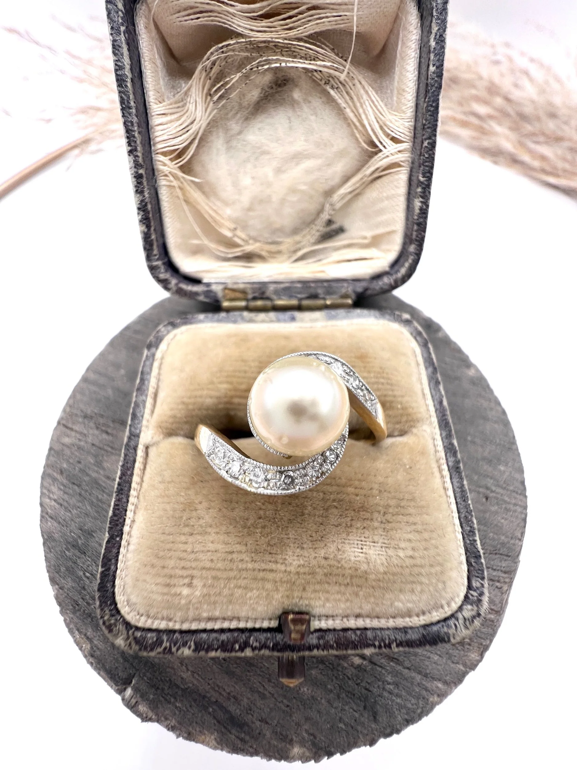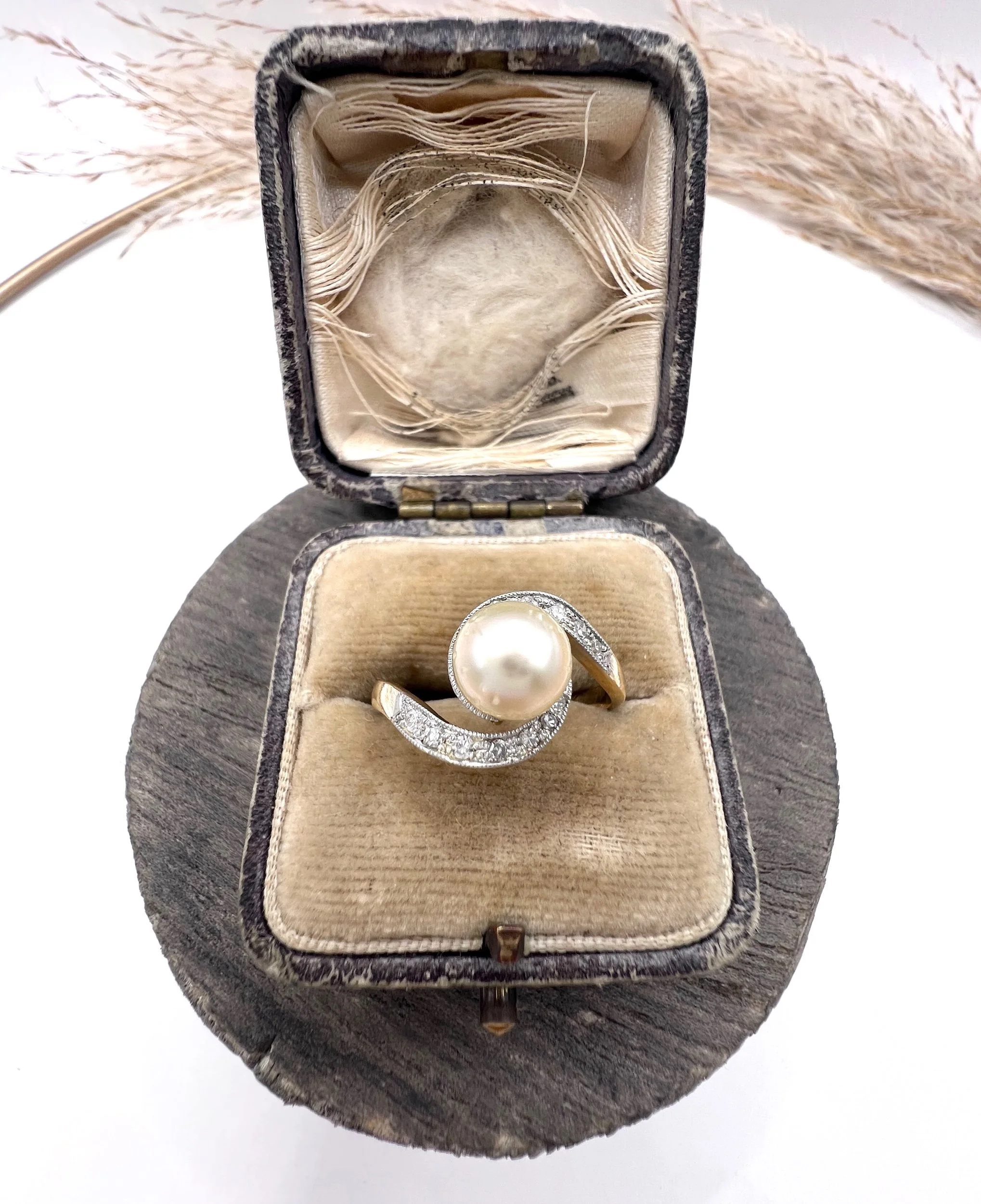 Discover the elegance of our exquisite 18ct yellow gold Edwardian ring, a stunning piece that embodies the charm of its era. This fabulous crossover design features a captivating 7mm pearl at its centre, gracefully framed by delicate natural diamonds that sparkle brilliantly. The pearl exhibits slight signs of wear that reflect its historical significance.
