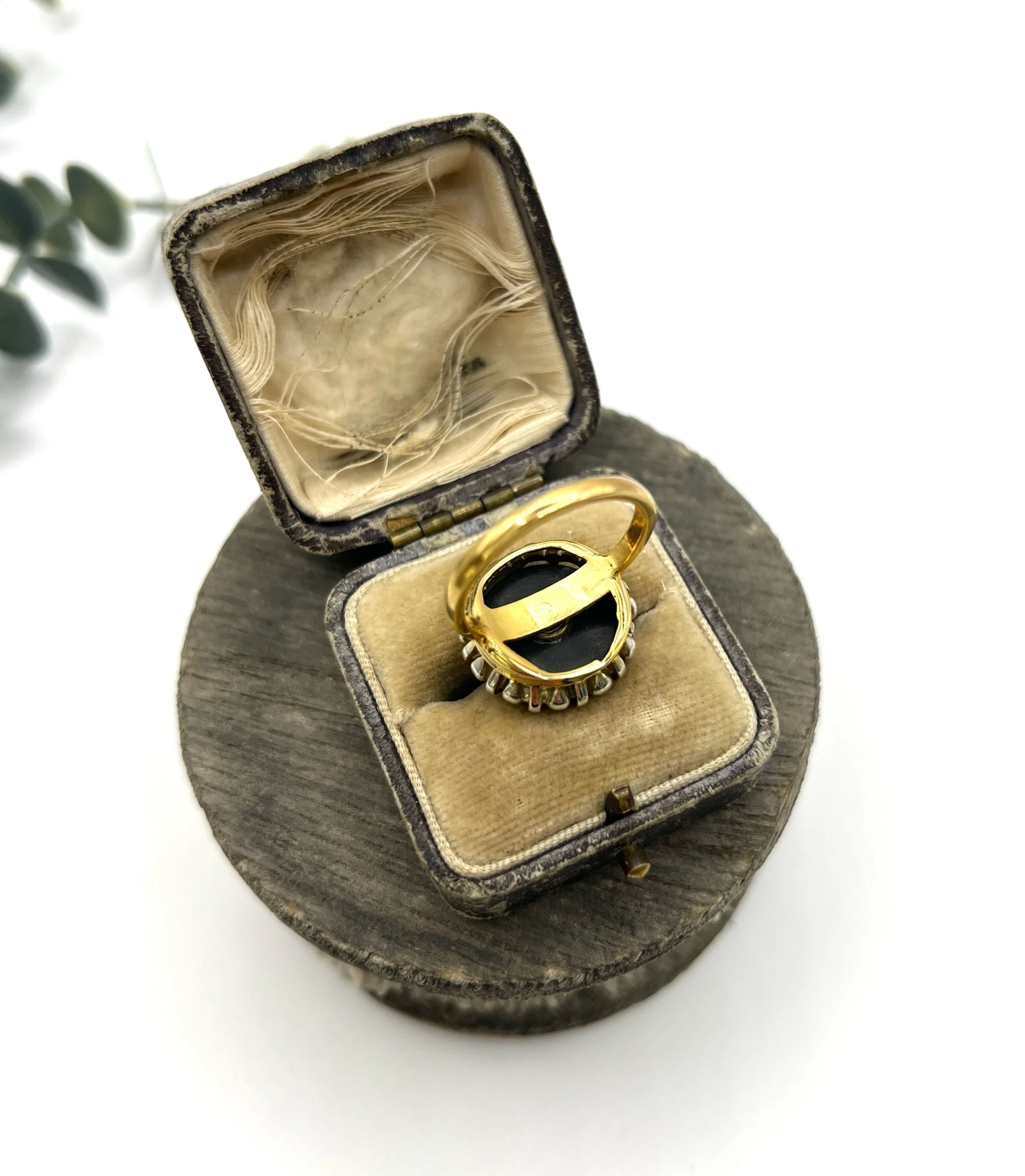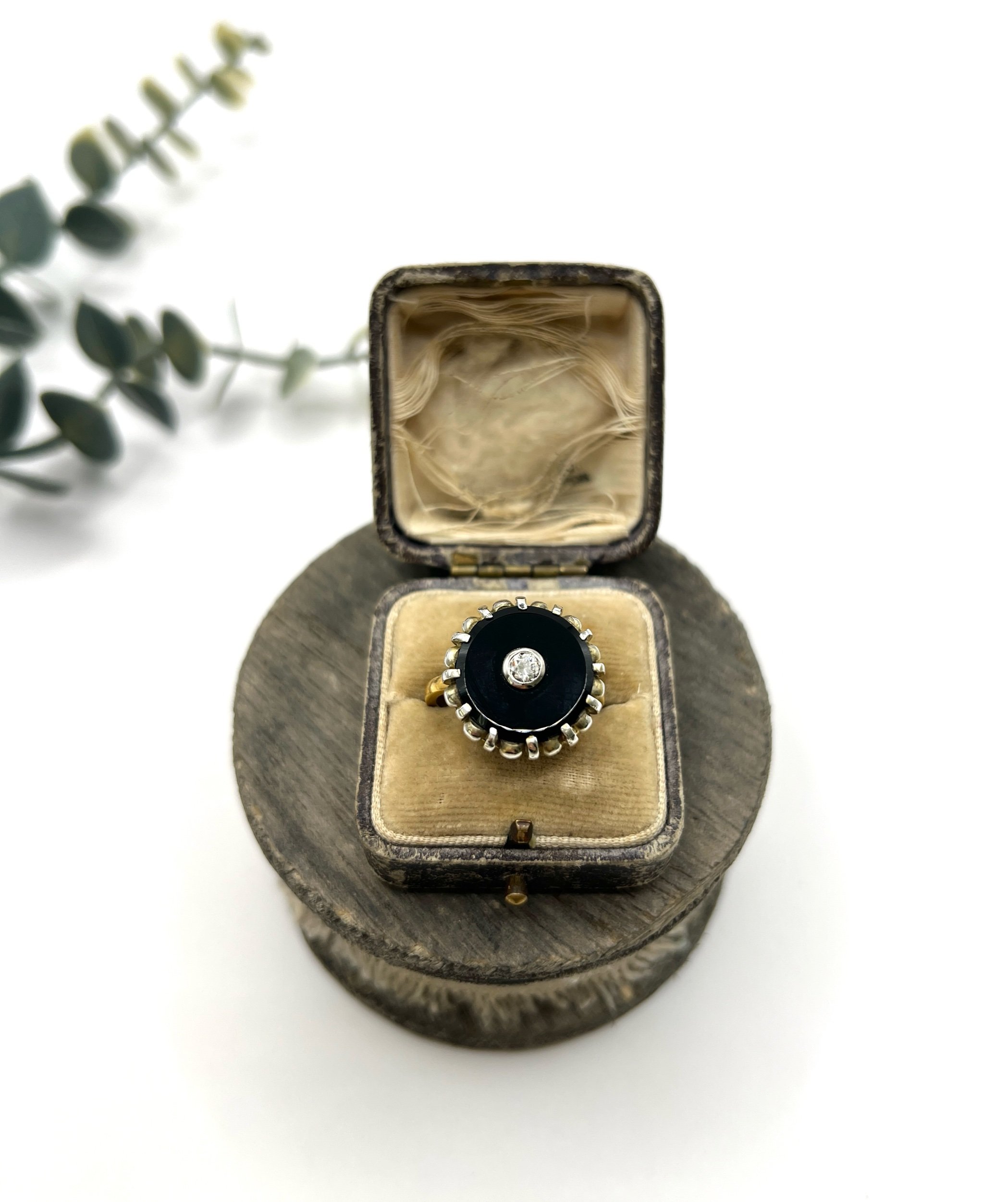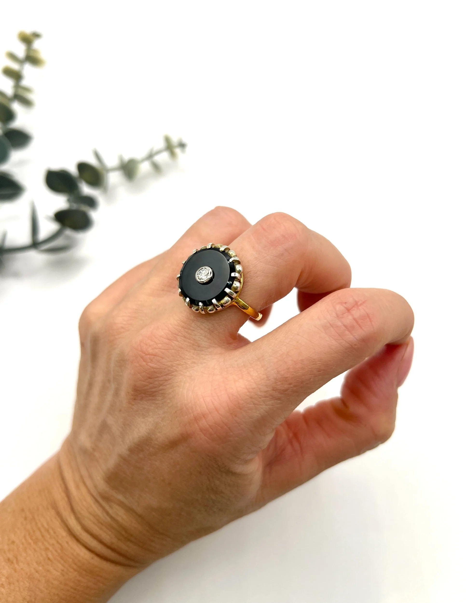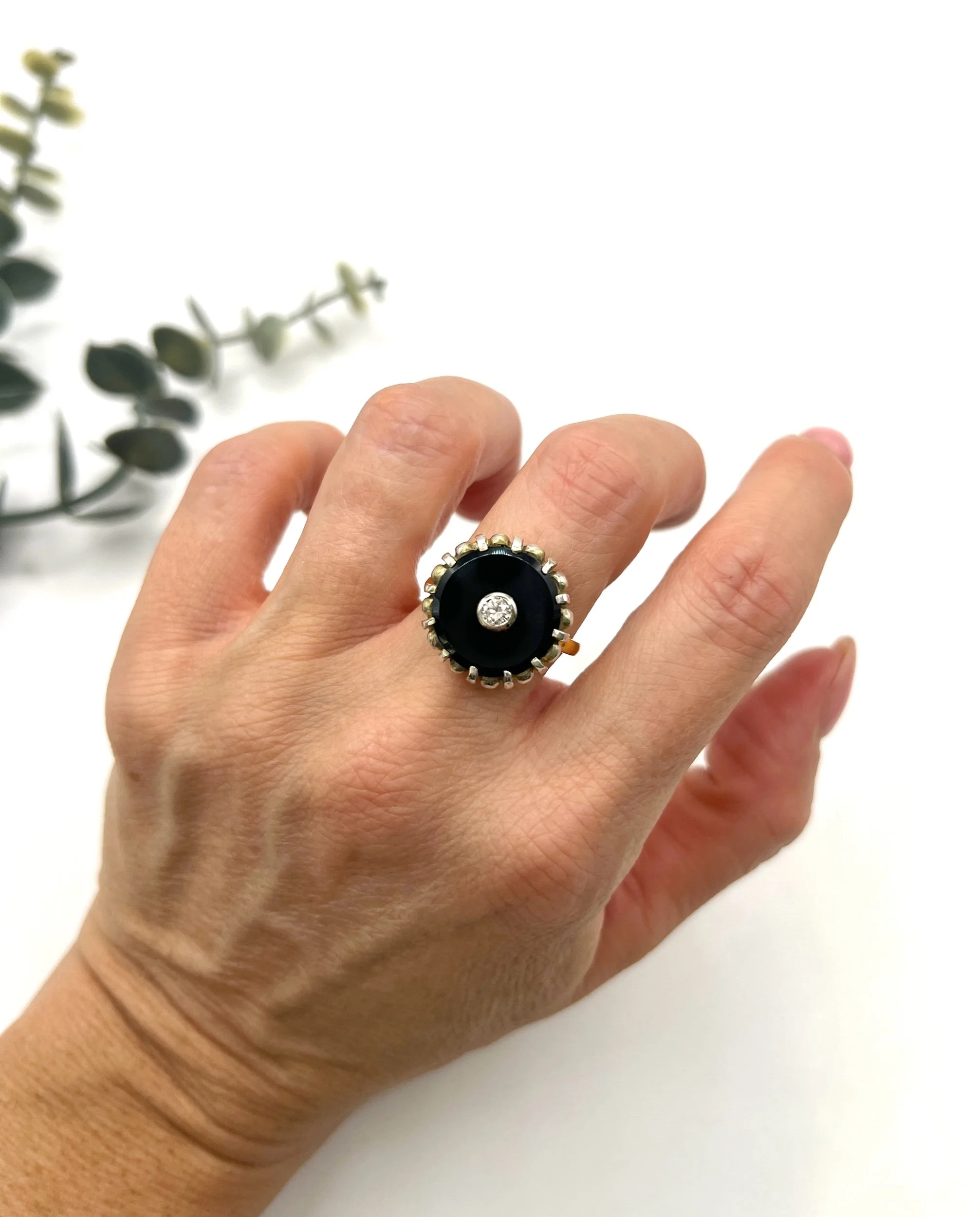 The band features a comfortable design, making it perfect for both special occasions and everyday wear. With its unique combination of materials and classic style, this ring is a true statement piece that embodies the charm of vintage jewellery.
