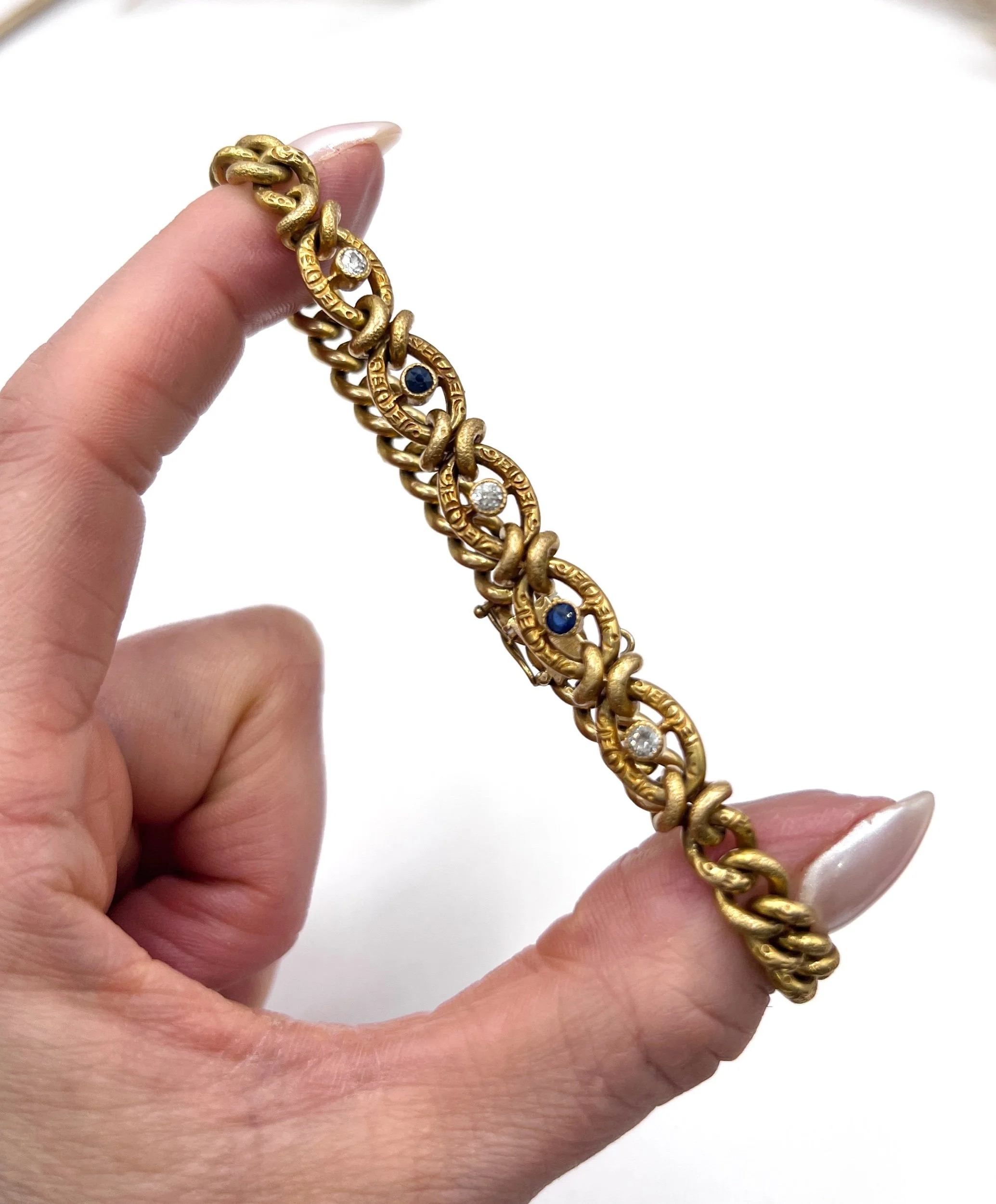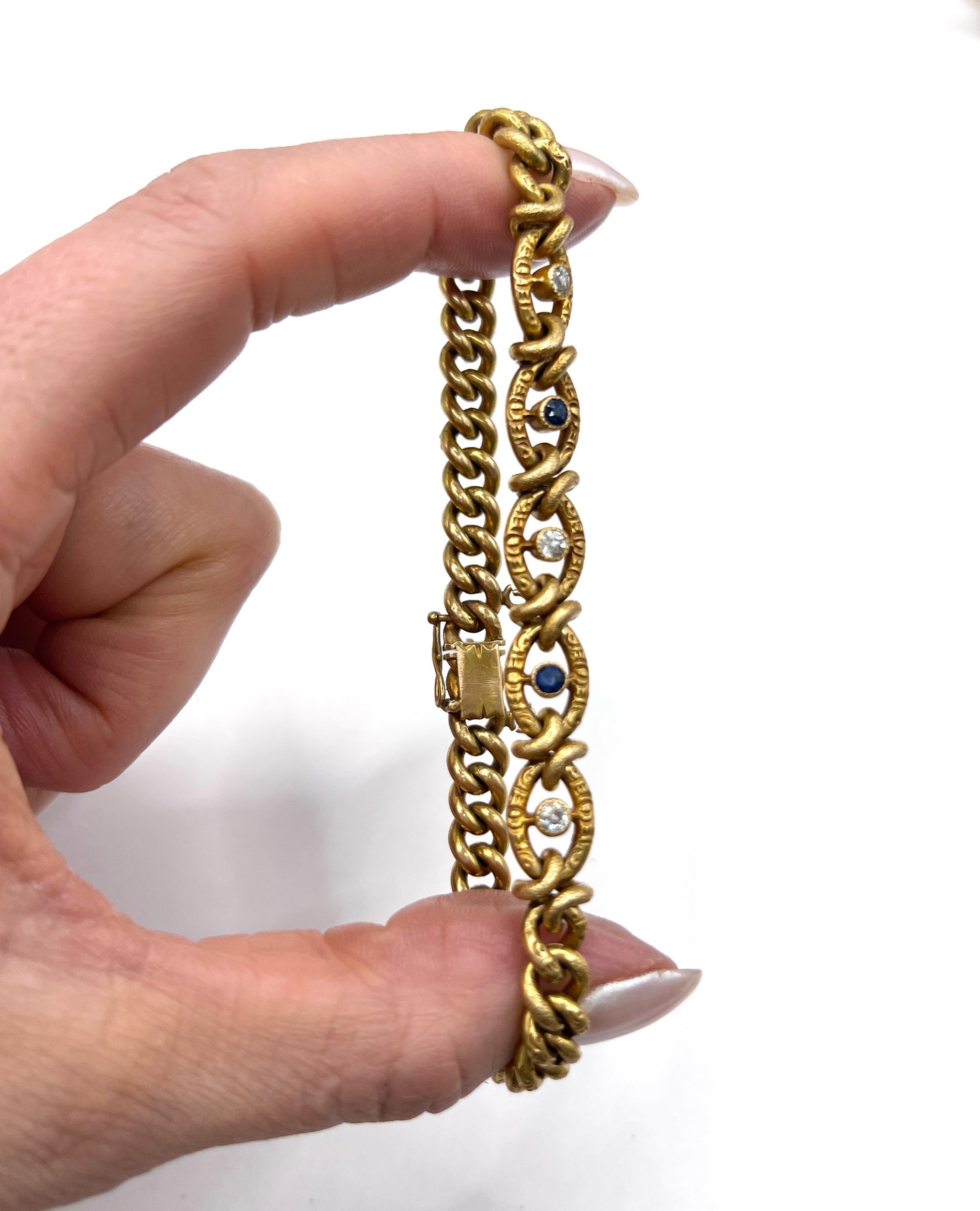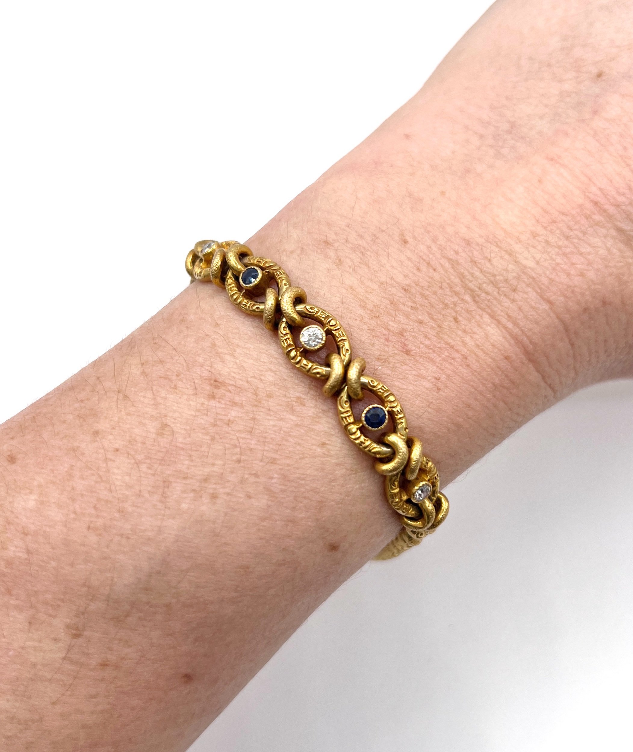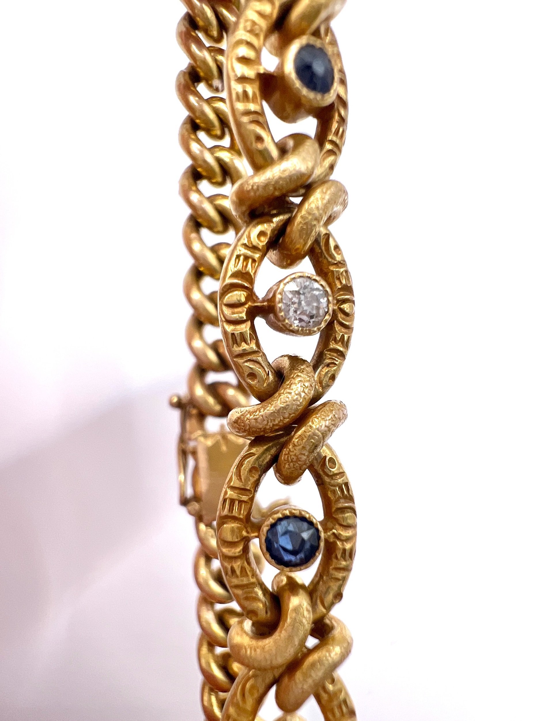 Set within the decorative links are deep blue sapphires and sparkling old cut diamonds, adding subtle brilliance and refined colour to the warm gold tones. The engraved detailing and sculptural link pattern are typical of fine 19th century Victorian jewellery, making this bracelet both collectible and wearable.